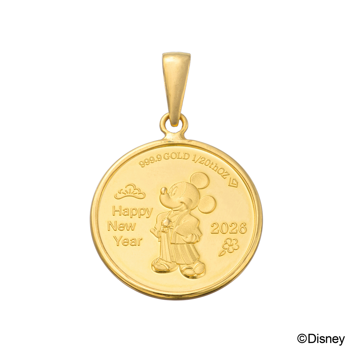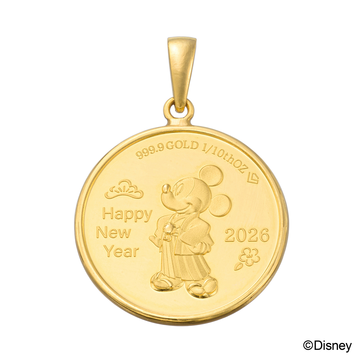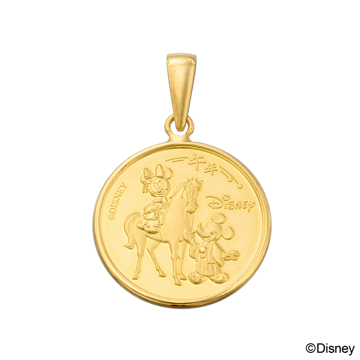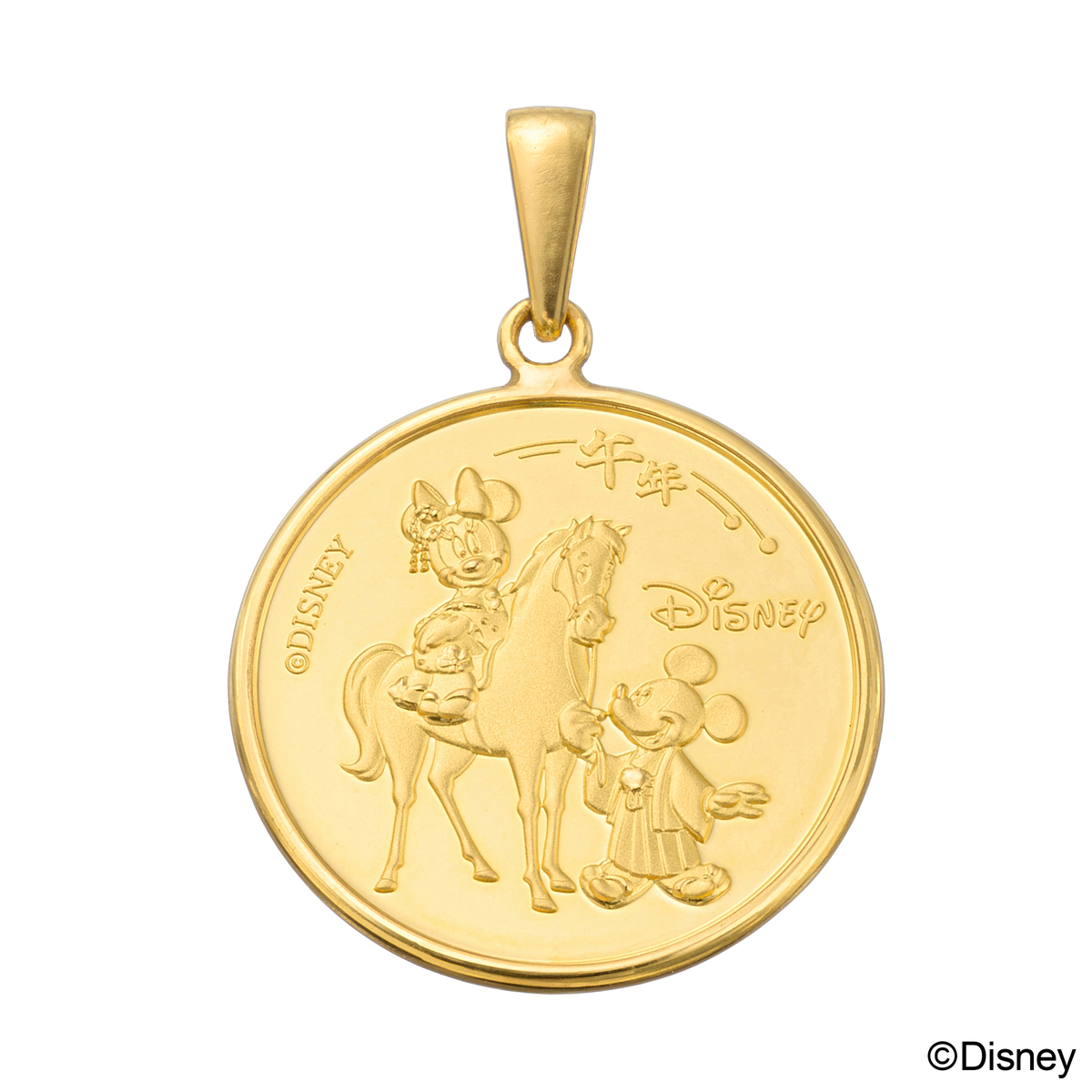 和服姿のミッキーとミニーが描かれた純金メダルペンダントヘッド。2026年の干支である馬もあしらい、新年にふさわしい純金と華やかな絵柄を一緒にお楽しみください
