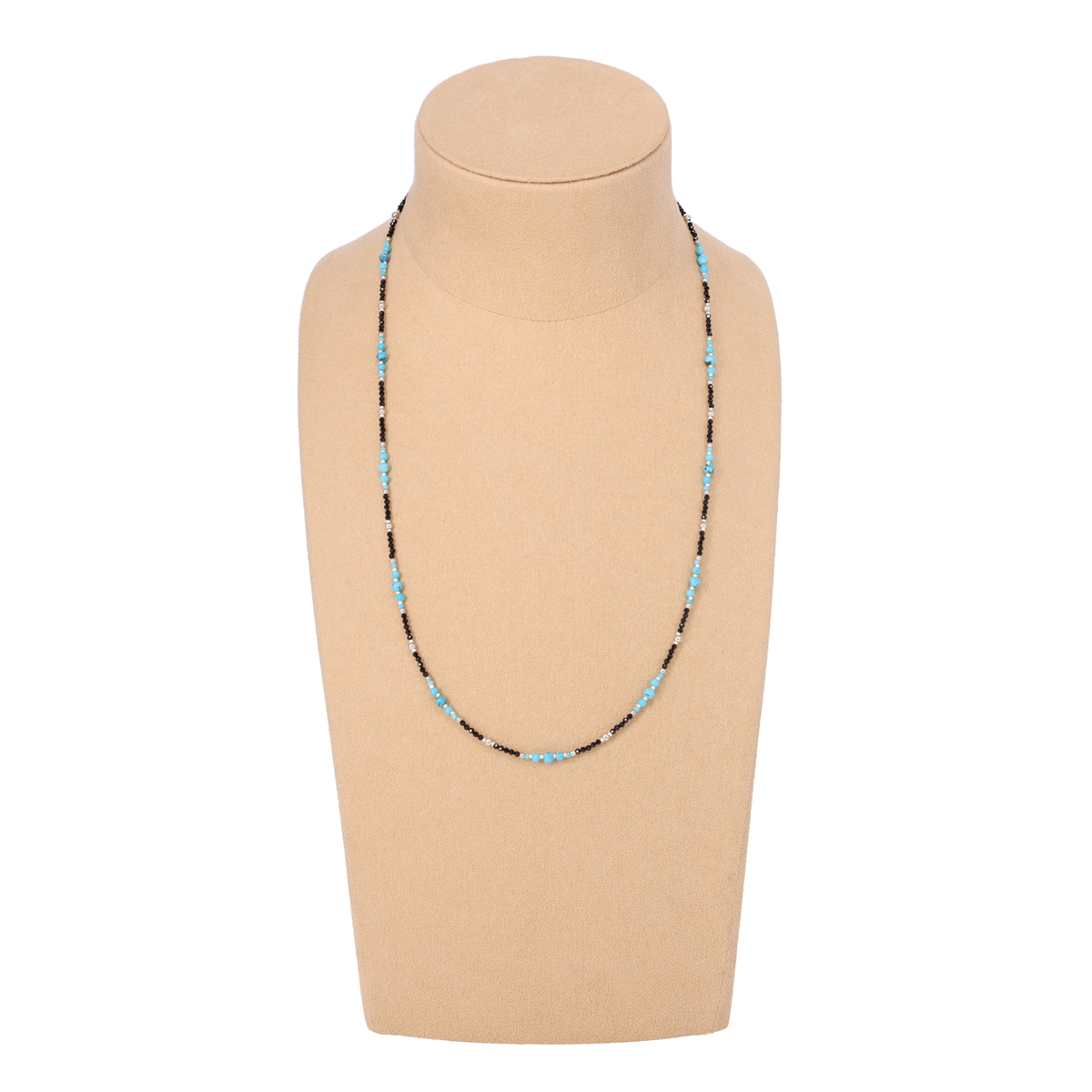 素材: [ターコイズ] 約1.8〜3.8mm 丸珠 貫通 [ブラックスピネル] 約1.8mm 多面カット 貫通 [ガラスビーズ] [樹脂ビーズ] [長さ] 全長約70cm(ネックレス使用時約66cm) [重量] 約6.9g [地金] 真鍮 [メッキ] シルバーカラーメッキ ■主にブラックスピネルを使用していますが、パイロキシンやブラックトルマリン等が混在する可能性があります ■素材の大きさ・形・色合い、製品のサイズは1点1点多少異なります 【日本製】