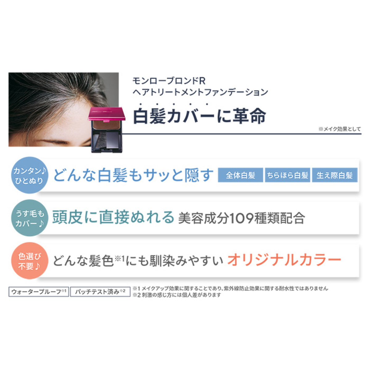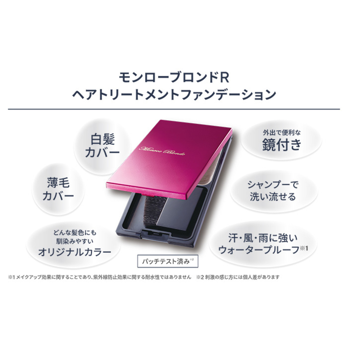 [商品内容] ・モンローブロンドRヘアトリートメントファンデーション13g(本体、ブラシ付き) ・モンローブロンドRヘアトリートメントファンデーション(レフィル)13g [使用方法] 1.乾いた髪にご使用ください 2.ブラシに適量をとり、気になる生え際やわけ目の白髪に塗ります。もう片方の手を添えると塗りやすくなります 3.スタイリング剤をご使用される場合は最後にお使いください ※ご使用後は、ブラシについた余分なヘアファンデーションをティッシュペーパーなどでふき取ってください。就寝前にシャンプーで、洗い流してください [注意事項] ※頭皮に異常が生じていないかよく注意してご使用ください ※頭皮に傷、はれもの、湿疹等、異常のあるときはご使用しないでください ※使用中、又は直射日光にあたって、赤味、はれ、かゆみ、刺激、色抜け(白斑等)や黒ずみ等の異常があらわれたときは、使用を中止し、皮膚科専門医等にご相談することをおすすめします。そのまま使用を続けますと悪化することがあります ※襟や肩に触れる部分の髪へのご使用や、帽子の着脱はご遠慮ください。使用直後の衣服の着脱には特にご注意ください。色が付くことがあります ※使用量や使用方法によっては、気づかないうちに、衣類やアクセサリー(特に襟元や肩、イヤリング・ピアス・サングラスなど)に付着する可能性がありますので、十分にご注意ください ※頭髪以外にはご使用しないでください ※保管状況により、表面に油滴が発生する場合がございますが、品質には問題ございません ※乳幼児の手の届かないところに保管してください ※極端に高温または低温の場所、直射日光のあたる場所には保管しないでください ※ご使用後は、ブラシについた余分なヘアファンデーションをティッシュペーパーなどでふき取り、ケースに入れ、きちんとふたを閉めて保管してください 【日本製】 [成分] ■モンローブロンドリッチヘアファンデーション: トリエチルヘキサノイン、 イソノナン酸イソトリデシル、合成金雲母、 ジメチコン、合成ワックス、メタクリル酸メチルクロスポリマー、トリメチルシロキシケイ酸、(エチレン/プロピレン)コポリマー、(PPG-51/SMDI)コポリマー、ラウロイルリシン、プラセンタエキス、サイタイエキス、マンダリンオレンジ果皮エキス、オタネニンジン根エキス、トコフェロール、セラミドAG、 セラミドAP、 セラミドEOP、セラミドNG、セラミドNP、ローヤルゼリーエキス、ジパルミチン酸アスコルビル、ジリノール酸ジイソプロピル、キャンデリラロウ、ジメチルシリル化シリカ、ポリヒドロキシステアリン酸、ハイドロゲンジメチコン、シクロペンタシロキサン、シメチコン、水、タウリン、BG、スクワラン、PCA-Na、アスパラギン酸、アスパラギン酸Na、アルギニン、オリーブ果実油、ホホバ種子油、マカデミア種子油、リシンHCl、乳酸Na、PCA、アラニン、アラントイン、アルテア根エキス、アルニカ花エキス、 アンズ種子エキス、イソロイシン、イチョウ葉エキス、イノシトール、イノシン酸2Na、オドリコソウ花エキス、オノニスエキス、オプンティアストレプタカンサエキス、オランダガラシ葉エキス オレンジ果汁、カニナバラ果実油、カミツレ花エキス、 カンゾウ根エキス、キュウリ果実エキス、グアニル酸2Na、 クララ根エキス、グリシン、グリセリン、グルタミン酸、グレープフルーツ果実エキス、ゴボウ根エキス、サッカロミセスセレビシアエエキス、サボンソウ葉エキス、サンザシエキス、シャクヤク根エキス、スギナ/(アルニカ/カミツレ)花エキス、スギナエキス、セイヨウアカマツ球果エキス、セイヨウオトギリソウエキス、セイヨウオトギリソウ花/葉/茎エキス、セイヨウキズタエキス、セイヨウキズタ葉/茎エキス、セイヨウサクラソウエキス、セイヨウトチノキ種子エキス、 セイヨウトチノキ葉エキス、セイヨウニワトコエキス、セイヨウノコギリソウエキス、セイヨウノコギリソウ花エキス、セイヨウハッカ葉エキス、セージ葉エキス、ゼニアオイ花/葉/茎エキス、ゼニアオイ花エキス、セリン、セロリエキス、タチジャコウソウ花/葉/茎エキス、チャ葉エキス、チロシン、トウキンセンカ花エキス、トウキ根エキス、トレオニン、ナイアシンアミド、ナツメ果実エキス、ナンバンクサフジ葉エキス、ニンニク根エキス、 ノイバラ果実エキス、ハゴロモグサエキス、ハマメリス葉エキス、 パリエタリアエキス、バリン、パントテン酸Ca、ヒスチジン、 ヒスチジンHCl、ヒバマタエキス、フィトステロールズ、 フェニルアラニン、フキタンポポエキス、ブクリョウエキス、ブッチャーブルーム根エキス、ブドウ葉エキス、プロリン、ベロニカオフィシナリス花/葉/茎エキス、ホウライシダ葉エキス、ホップ球果エキス、 マグワ根皮エキス、他