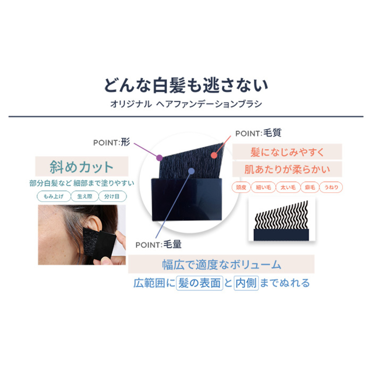 高密度でクリンプ(浅波)加工を施した人工毛ブラシを採用。パウダーの付着と離れが良く、毛にオリジナルの角度をつけることで、毛髪に塗りやすい仕様です