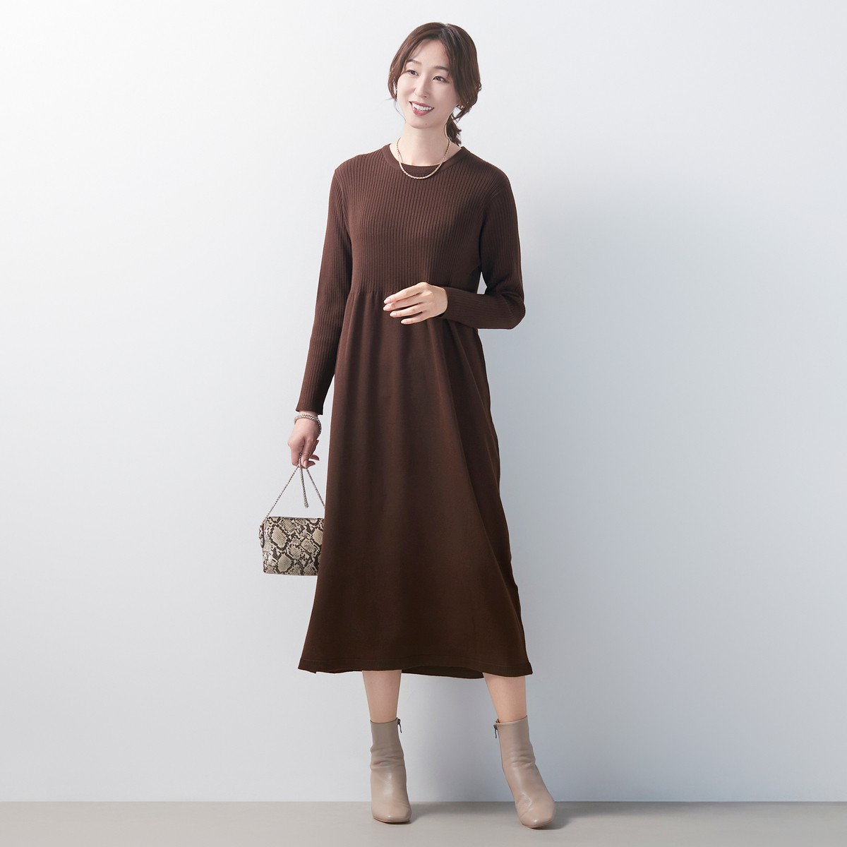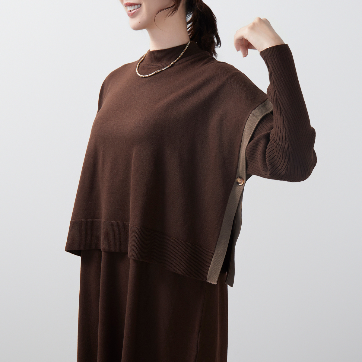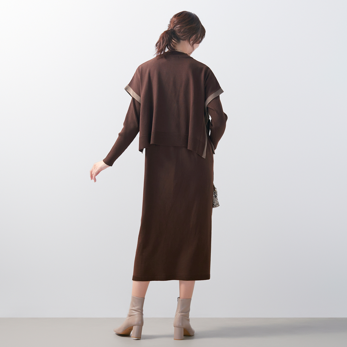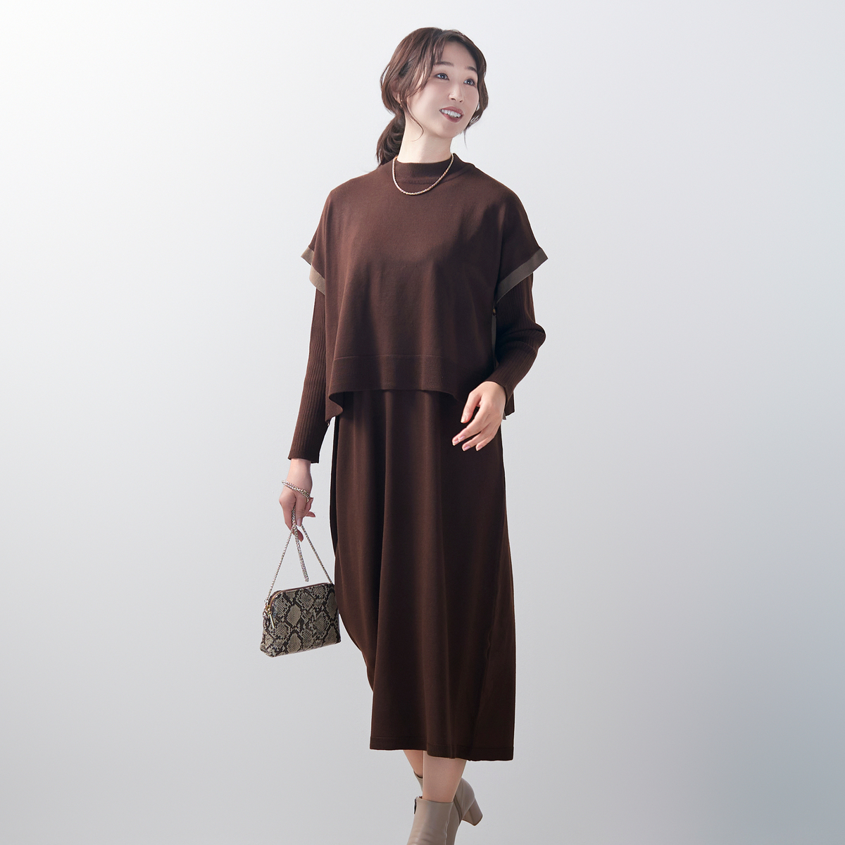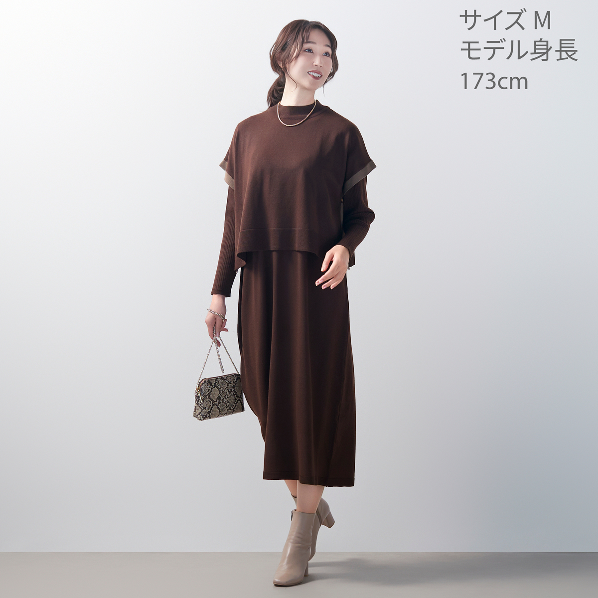 ニットワンピースにポンチョ風ベストを組合せたアンサンブルです。上品な編地が高級感を引き立て、洗練された雰囲気を演出。ベストを合わせることで、気になる二の腕や腰まわりを自然にカバーします