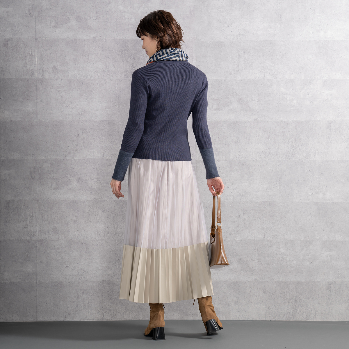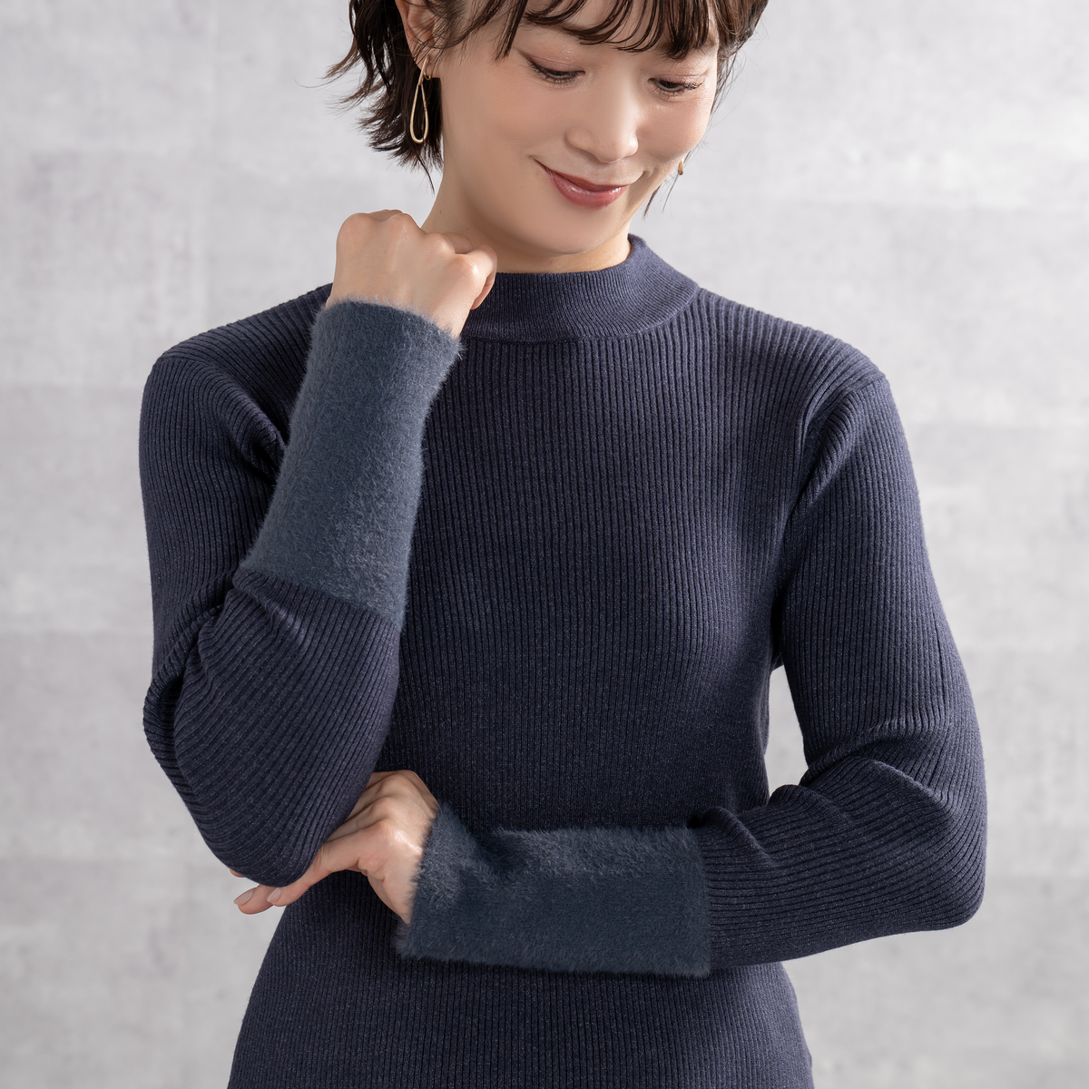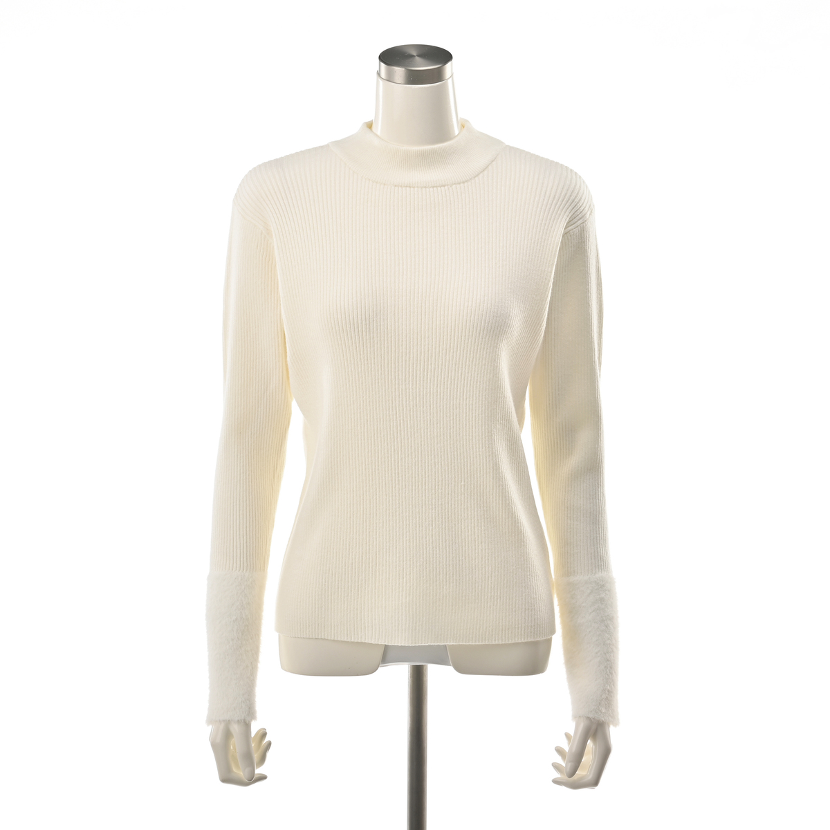 袖先にシャギー素材を組合せたニットプルオーバーです。ベーシックなシルエットに、シャギー袖のさりげない光沢感が加わり、上品でフェミニンな雰囲気に。アウターの袖口からちらりとシャギー素材を見せれば、コーディネートにほどよいアクセントをプラスします