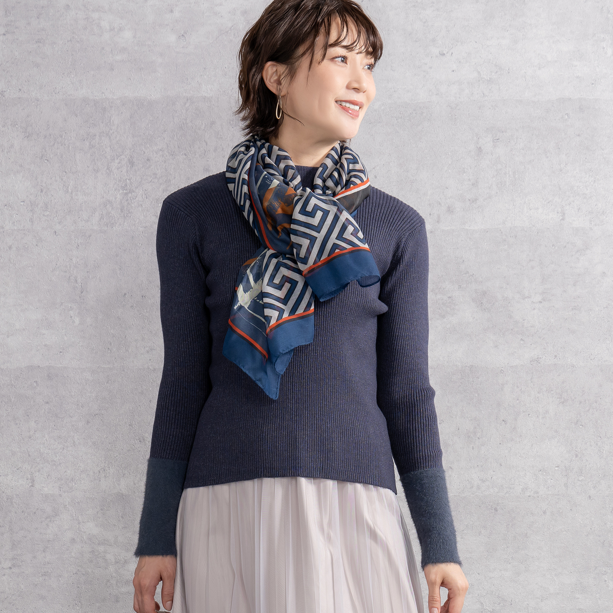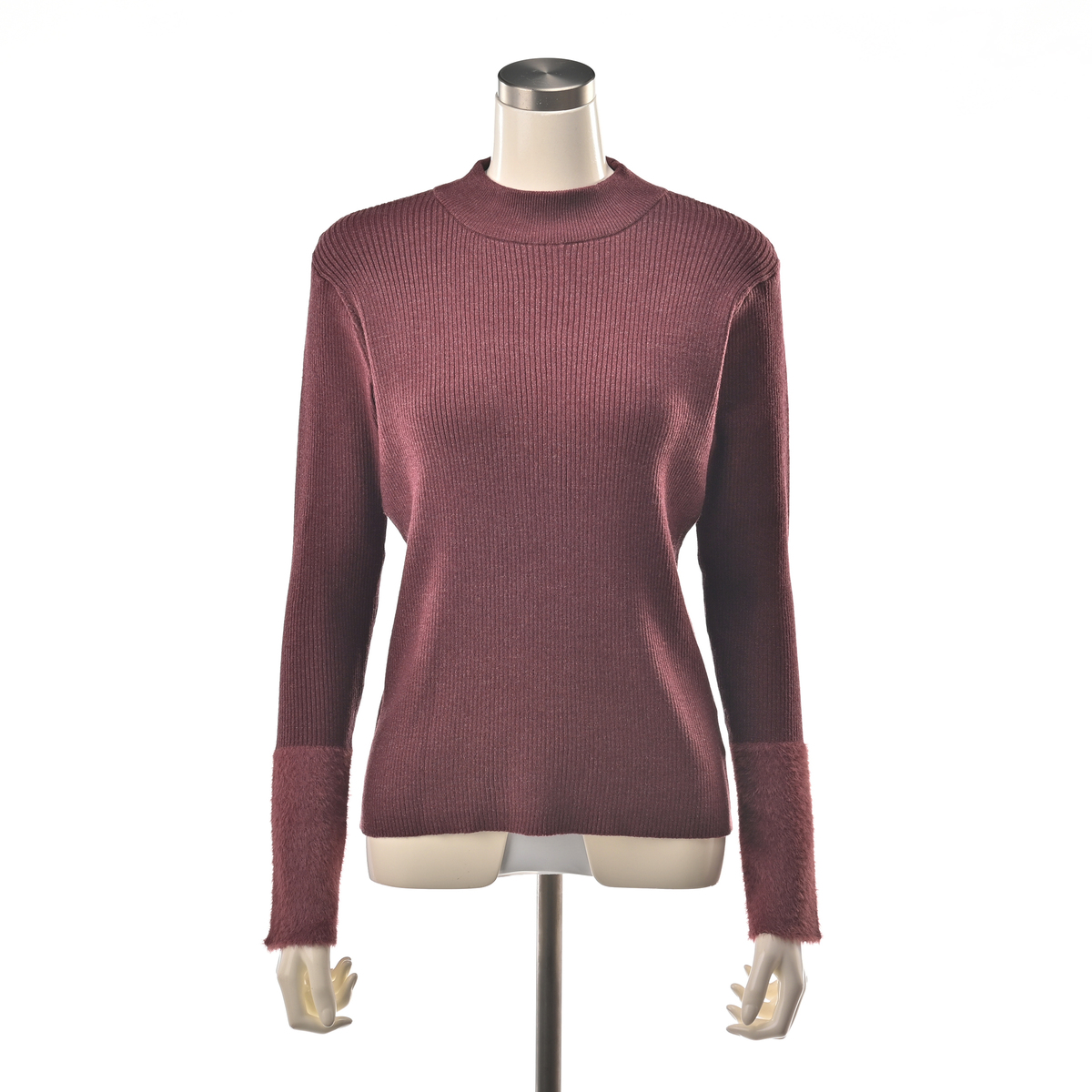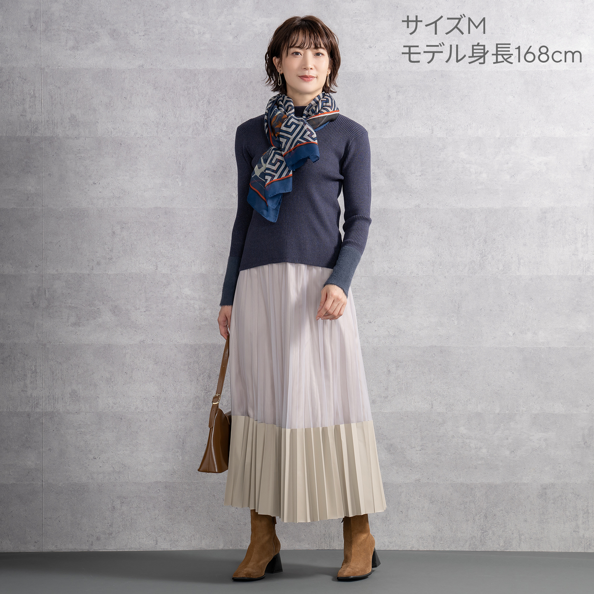 袖先にシャギー素材を組合せたニットプルオーバーです。ベーシックなシルエットに、シャギー袖のさりげない光沢感が加わり、上品でフェミニンな雰囲気に。アウターの袖口からちらりとシャギー素材を見せれば、コーディネートにほどよいアクセントをプラスします