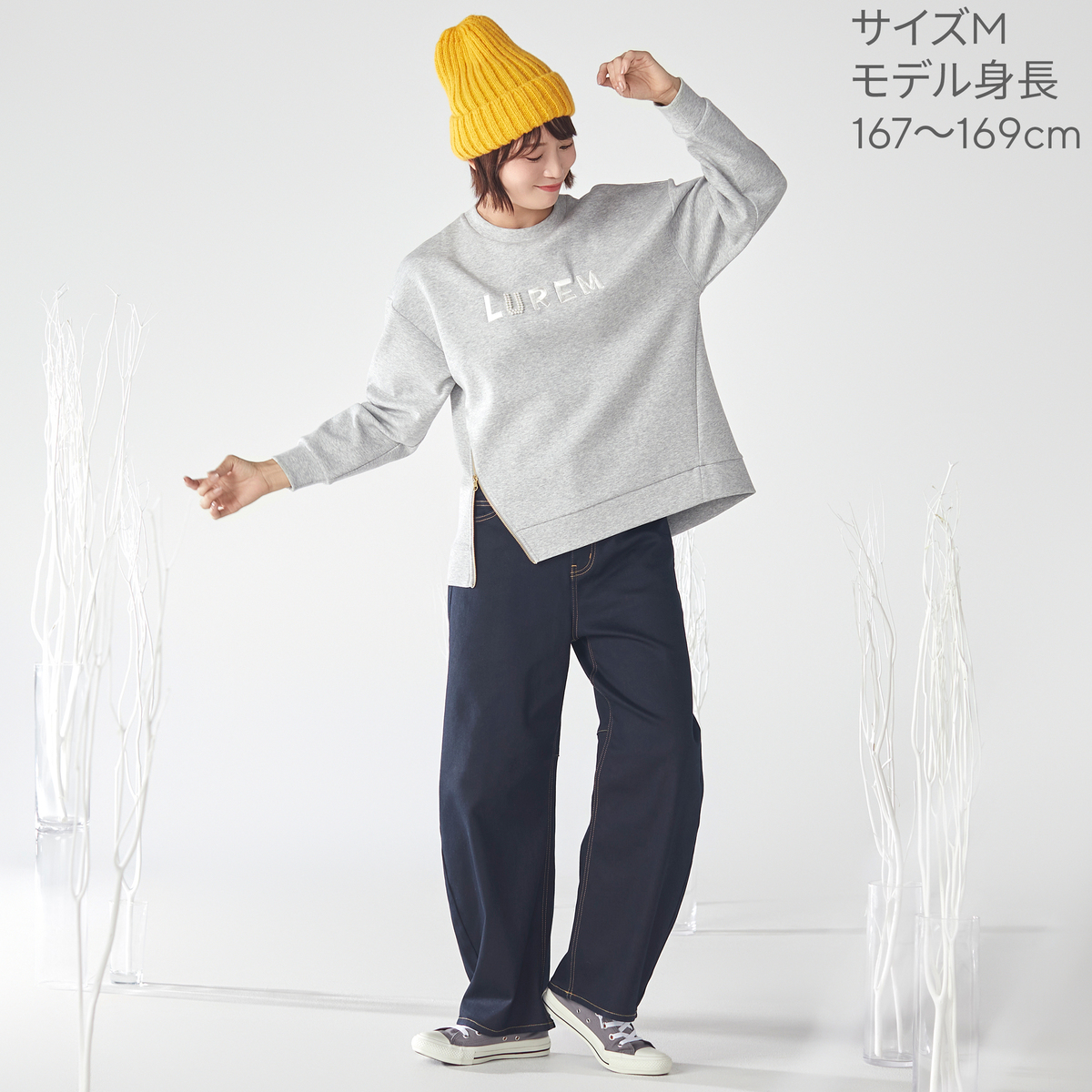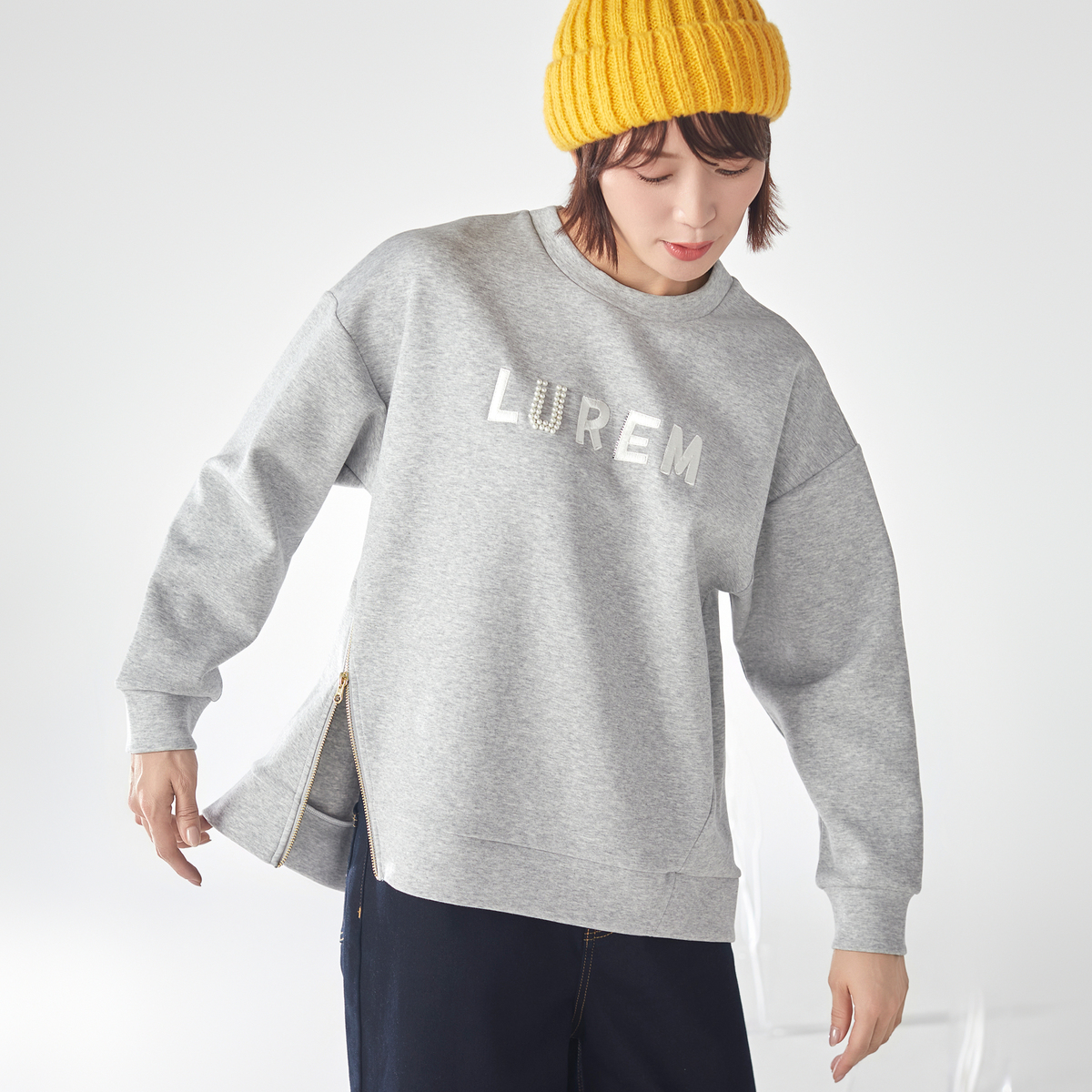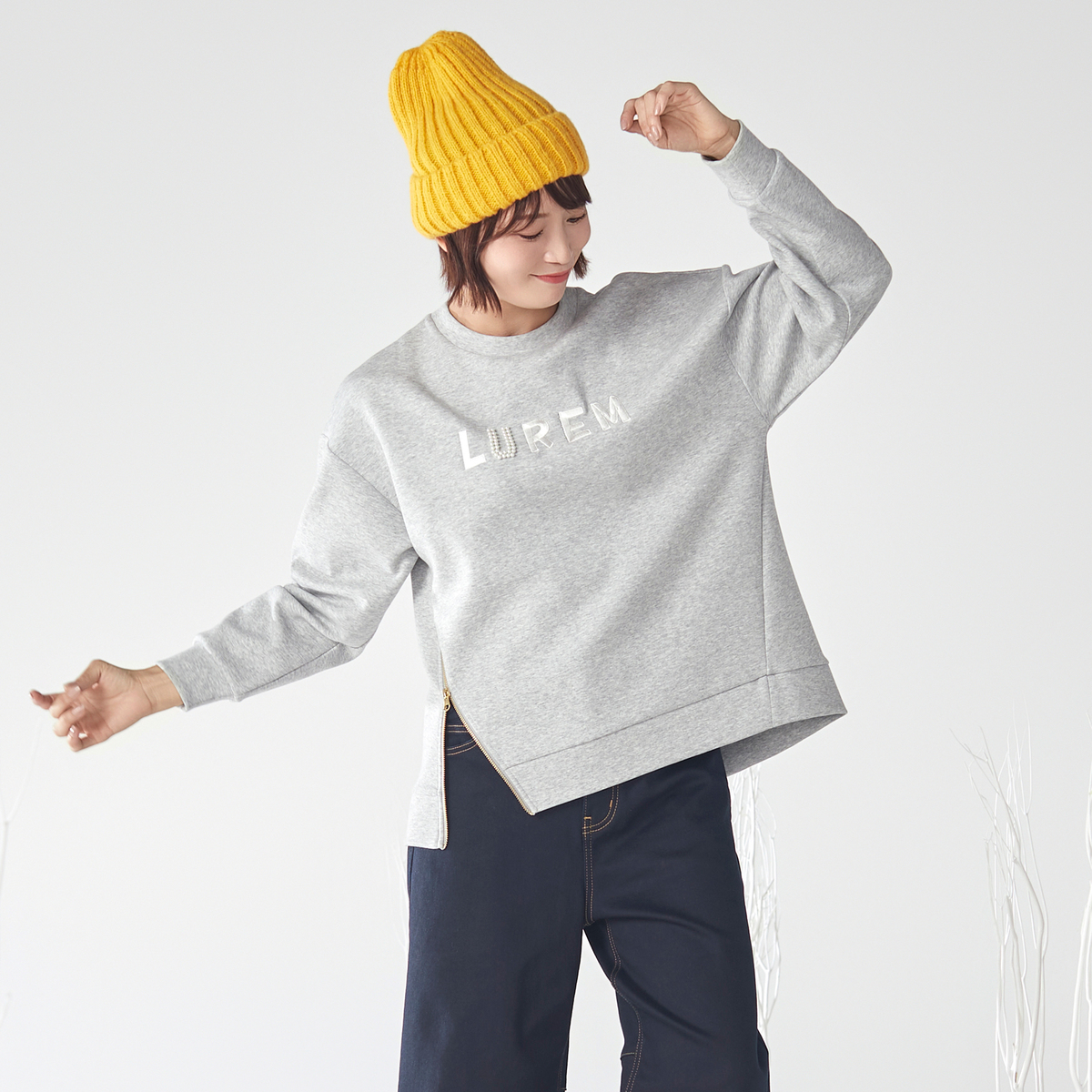 パール調刺繍が上品に映える、ダンボール素材のプルオーバー。きれい目な質感で、暖かい日は厚手のTシャツとして、寒い日はインナーを重ねてトレーナー風にも着用可能。サイドジップを開ければ、着こなしの幅が広がり、組合せ次第でカジュアルにもフェミニンにも活躍します