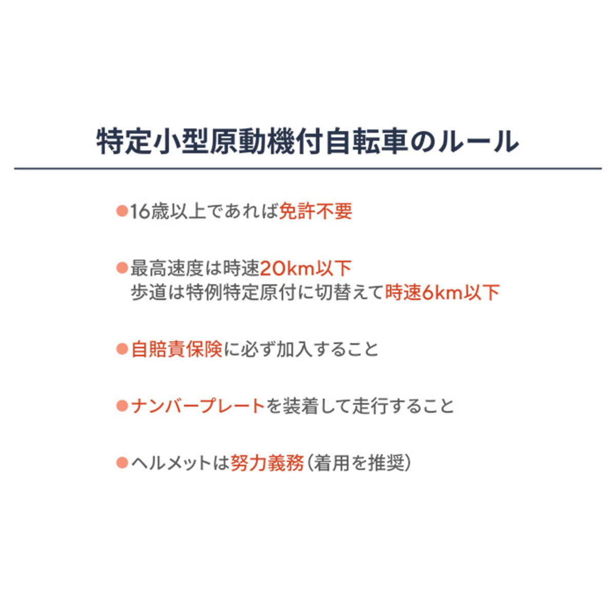 ・特定小型原動機付自転車は、定められた速度での走行、一時停止や信号の遵守、酒気帯び運転の禁止など、原動機付自転車と同じ交通ルールが適用されます。その他取扱説明書の記載をよくお読みください