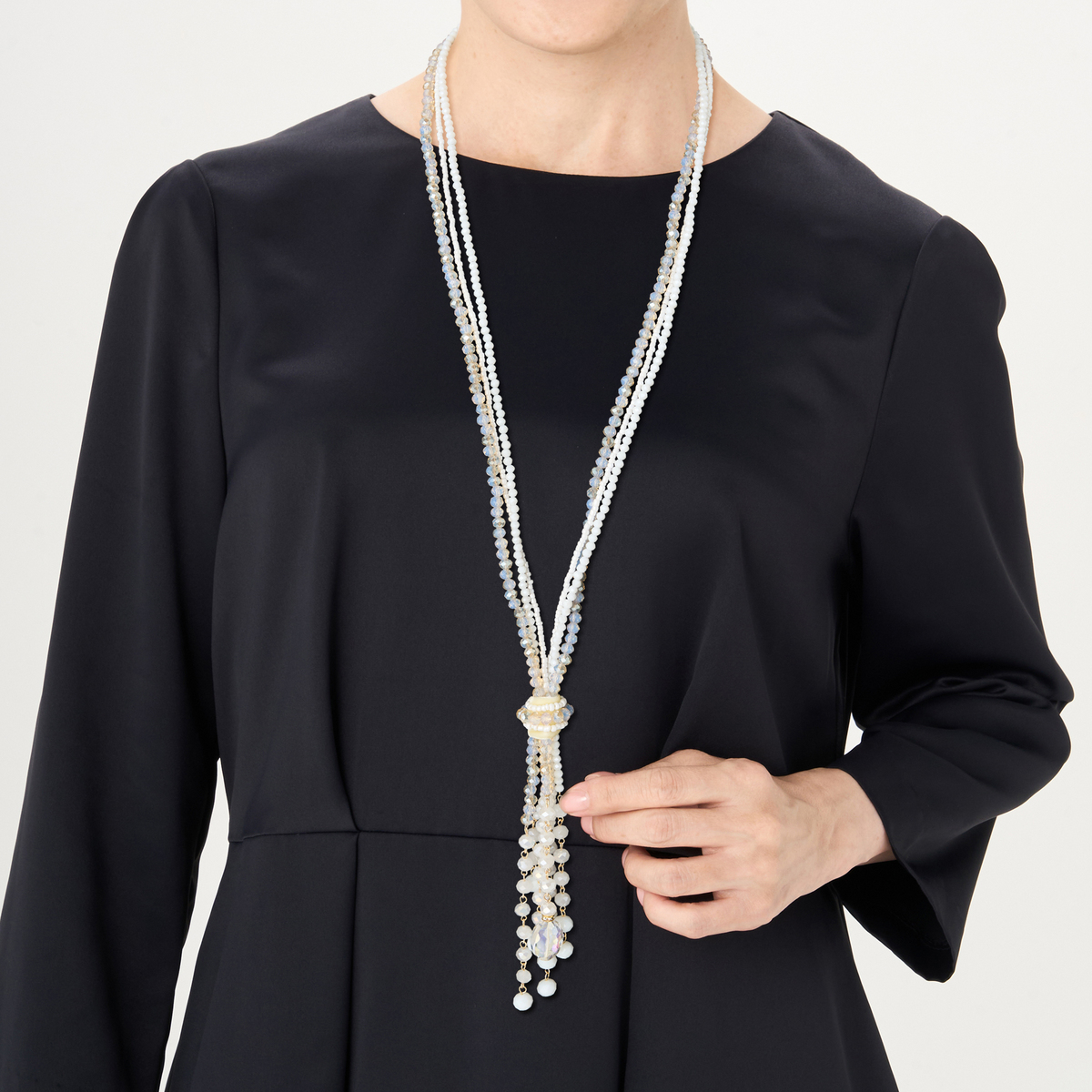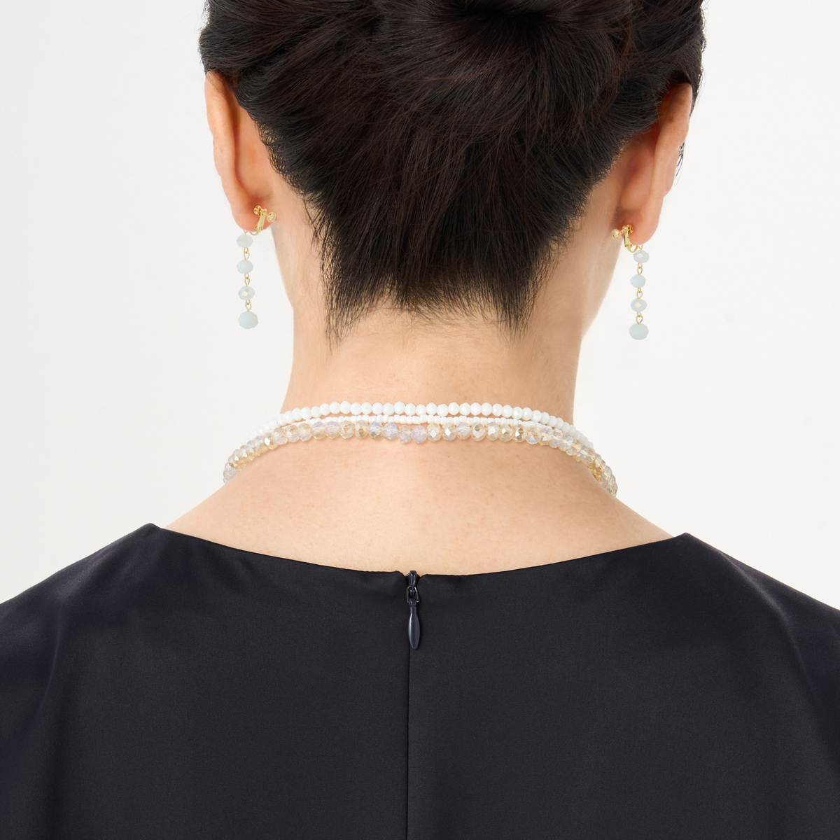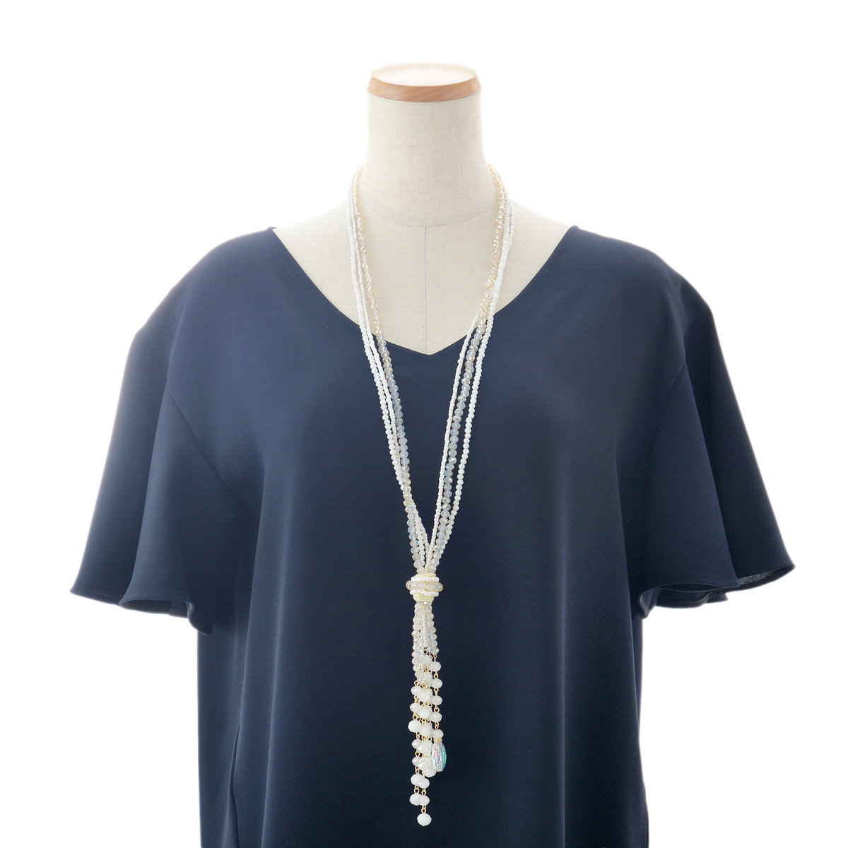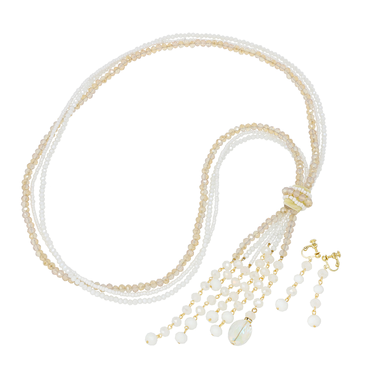 ホワイトを基調にしたタッセルネックレスと、イヤリングまたはピアスのセットです。動きのあるデザインが、身につけるたびに上品なきらめきを添え、大人の装いを洗練された印象に導きます