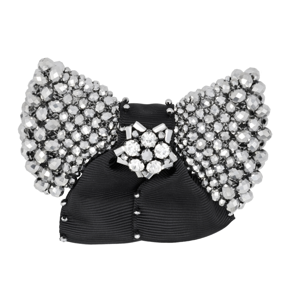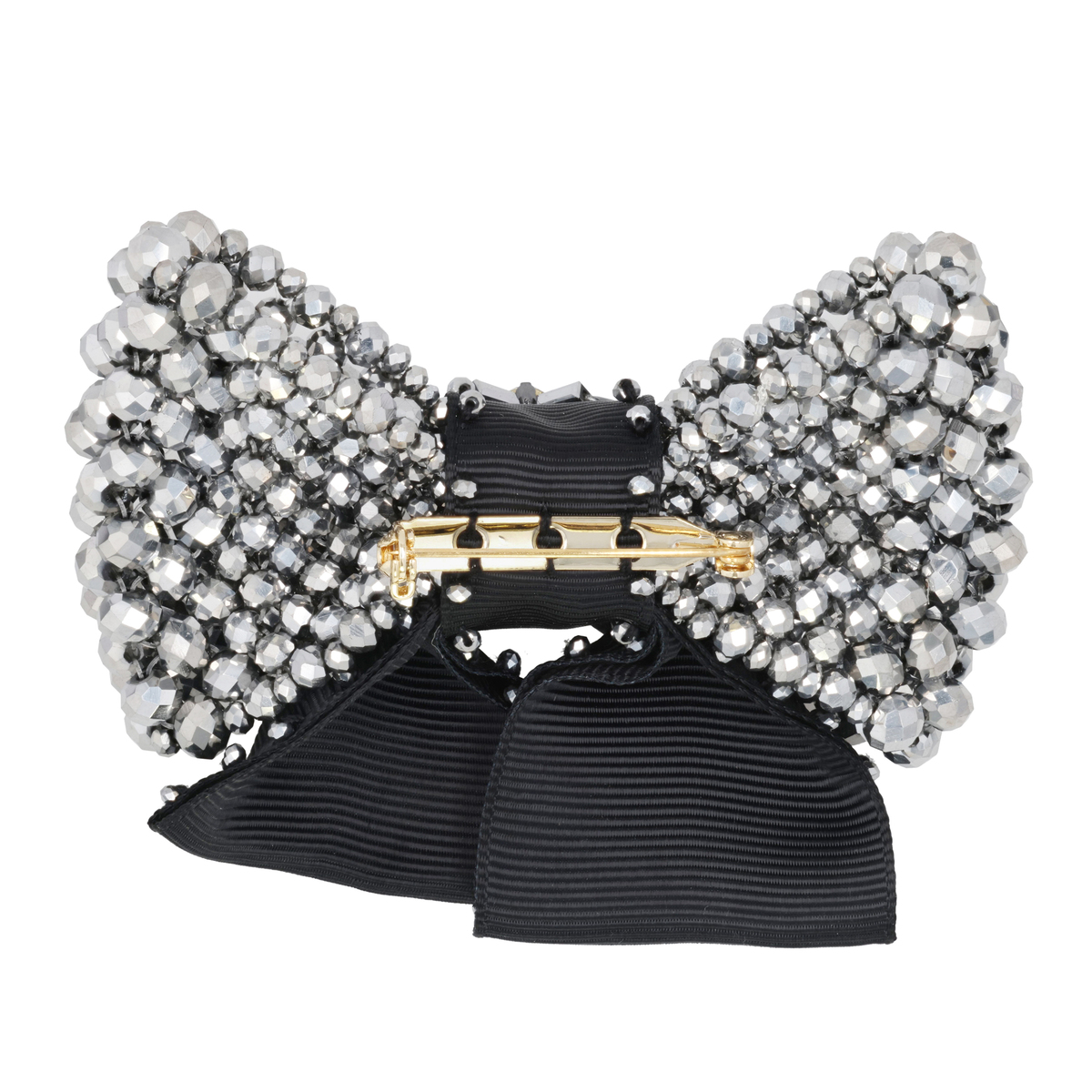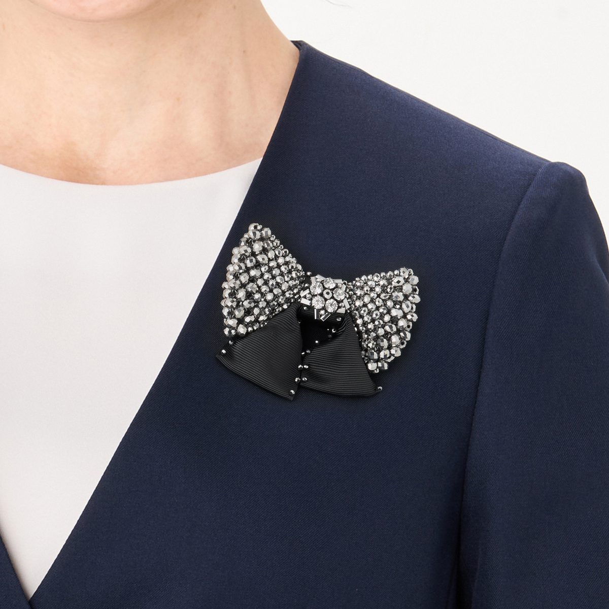 グレーカラーのカットガラスで形作ったリボンが目を引くブローチです。可愛らしさとゴージャス感が調和し、装いにさりげなく個性を添えます