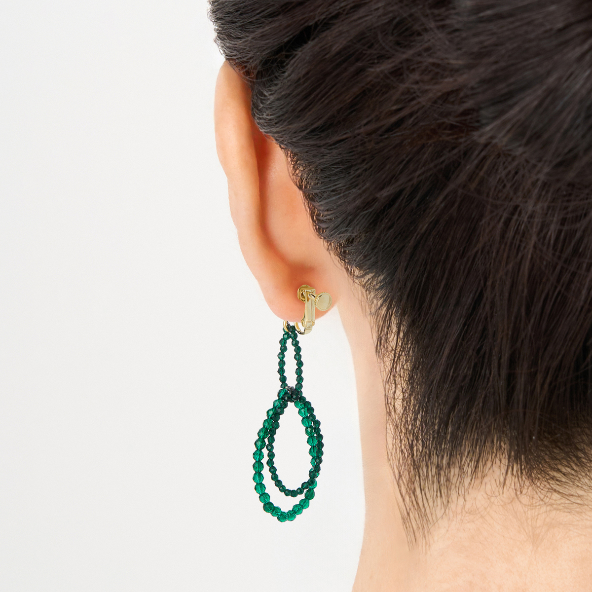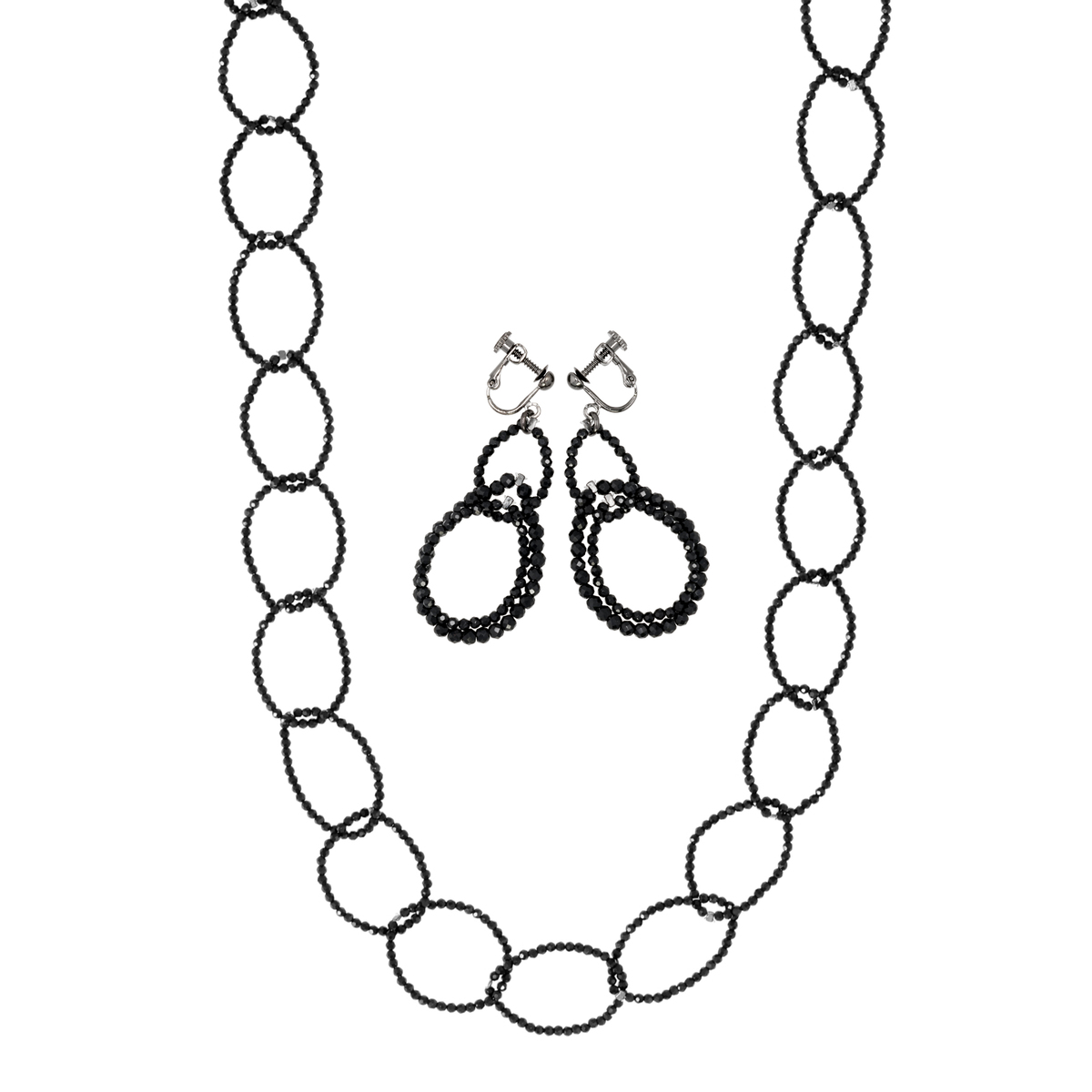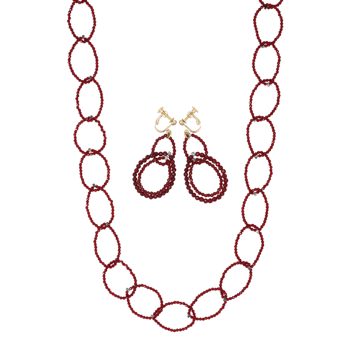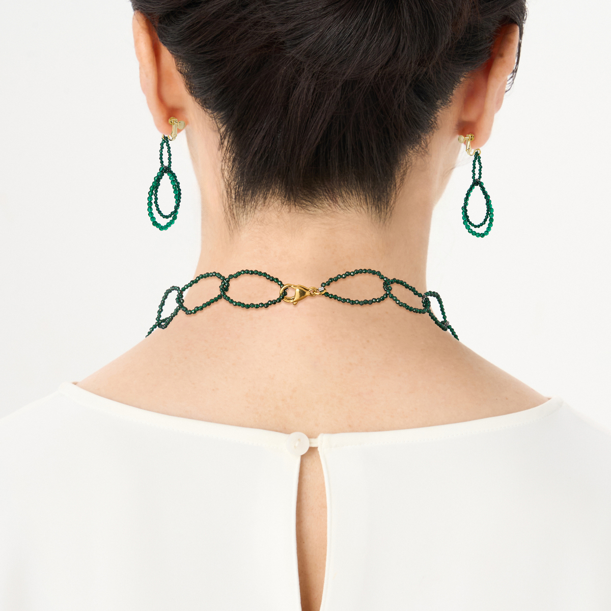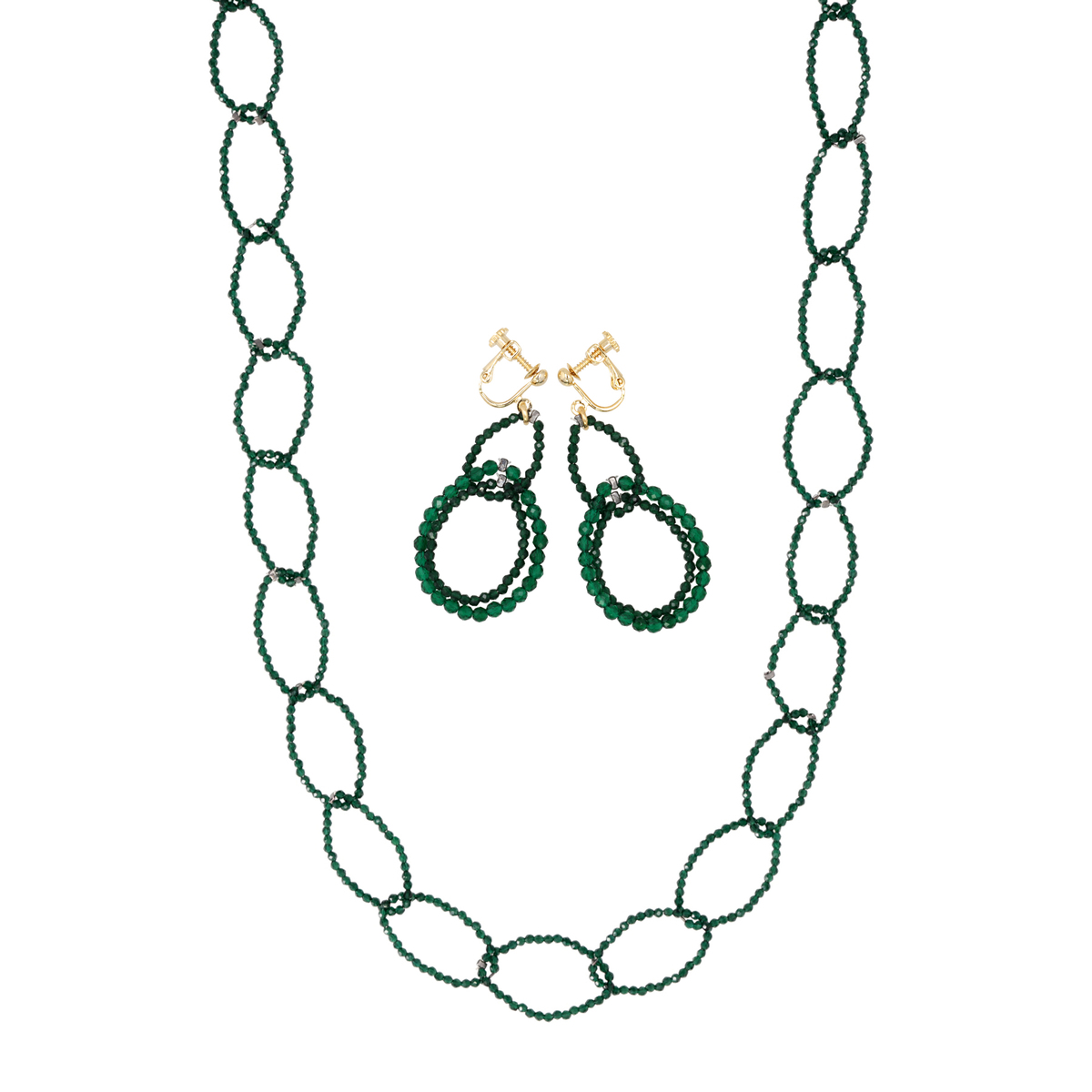 カットガラスを使用したフープネックレスと、イヤリングまたはピアスのセット。装いのポイントになってくれるボリューム感がありながらも、軽やかな着け心地です