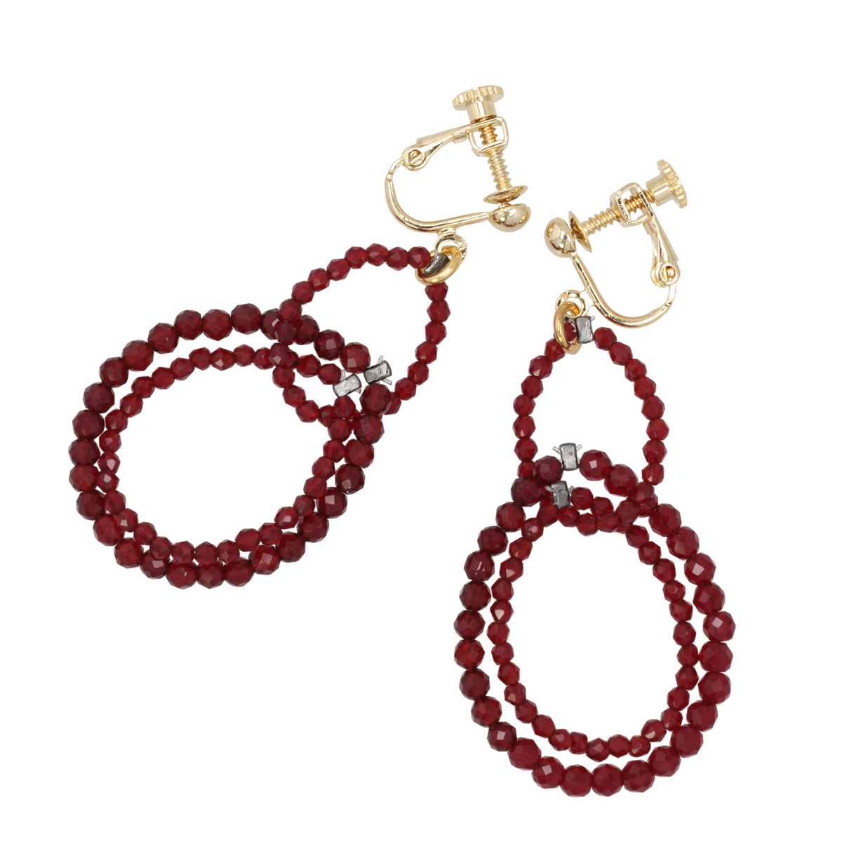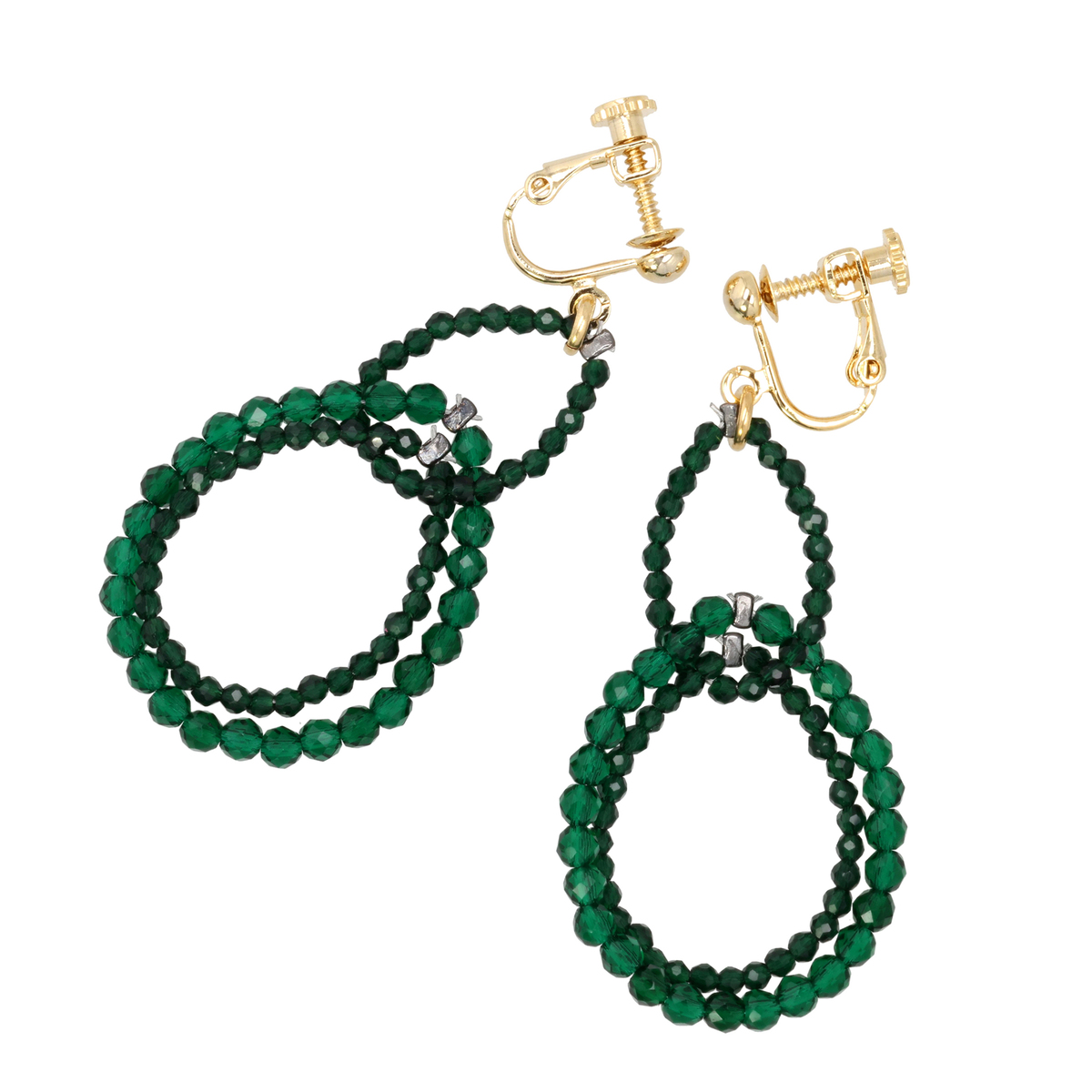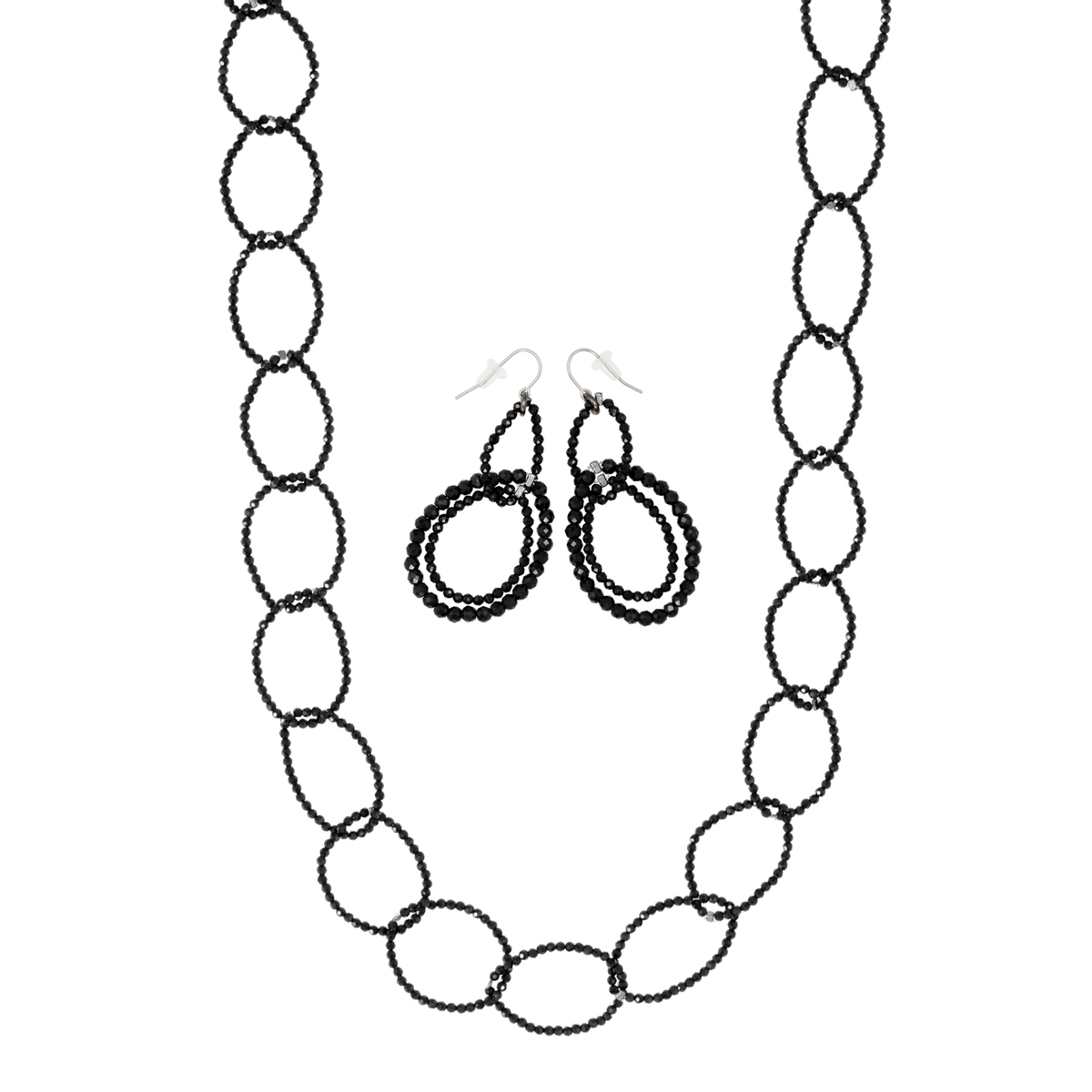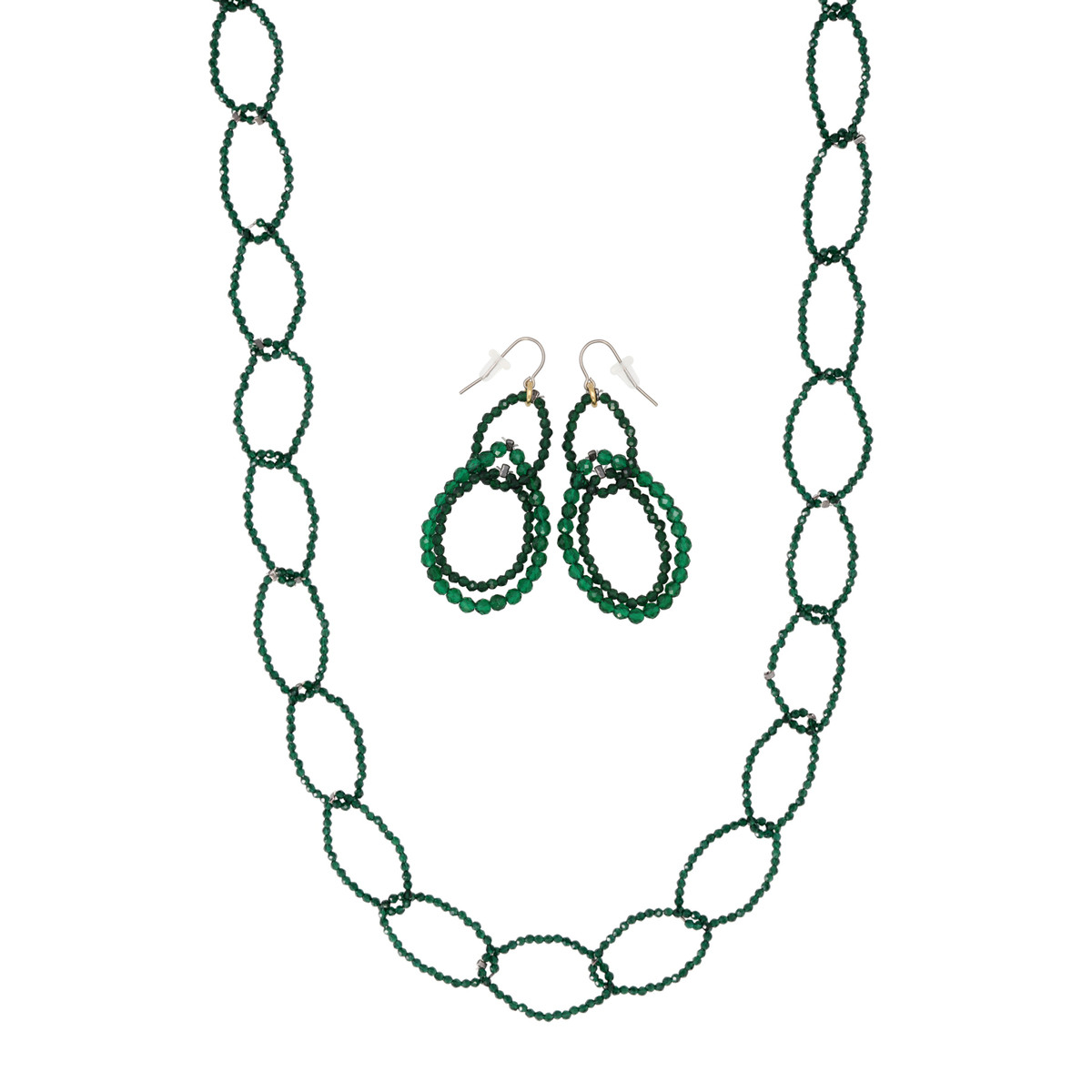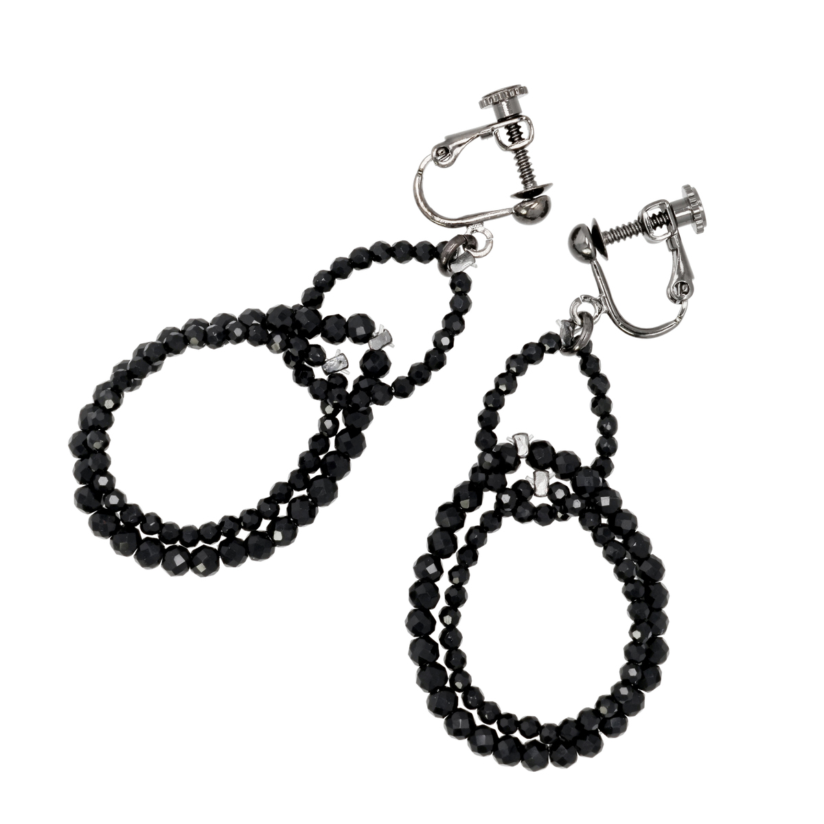 カットガラスを使用したフープネックレスと、イヤリングまたはピアスのセット。装いのポイントになってくれるボリューム感がありながらも、軽やかな着け心地です