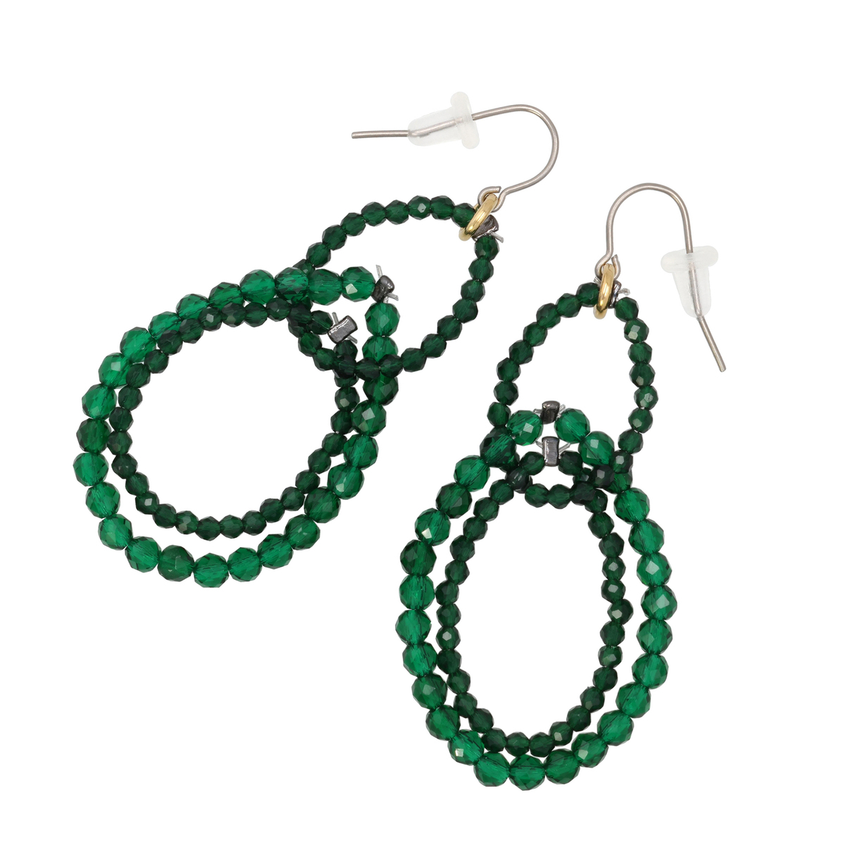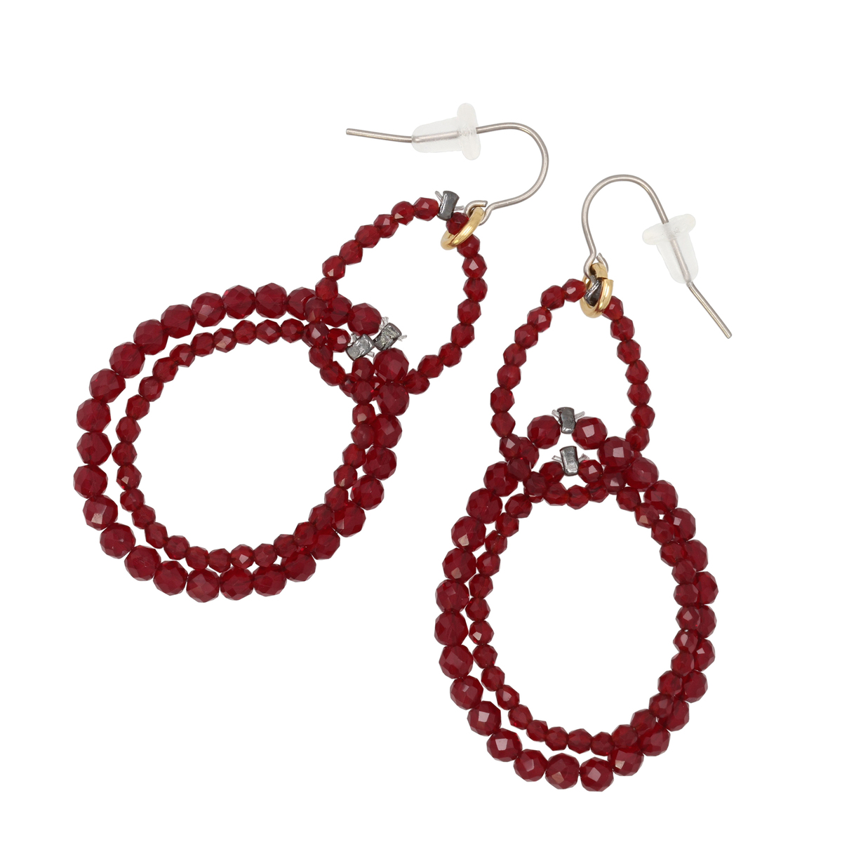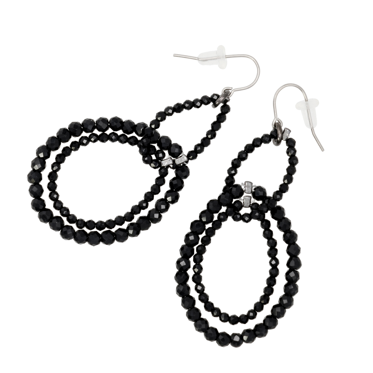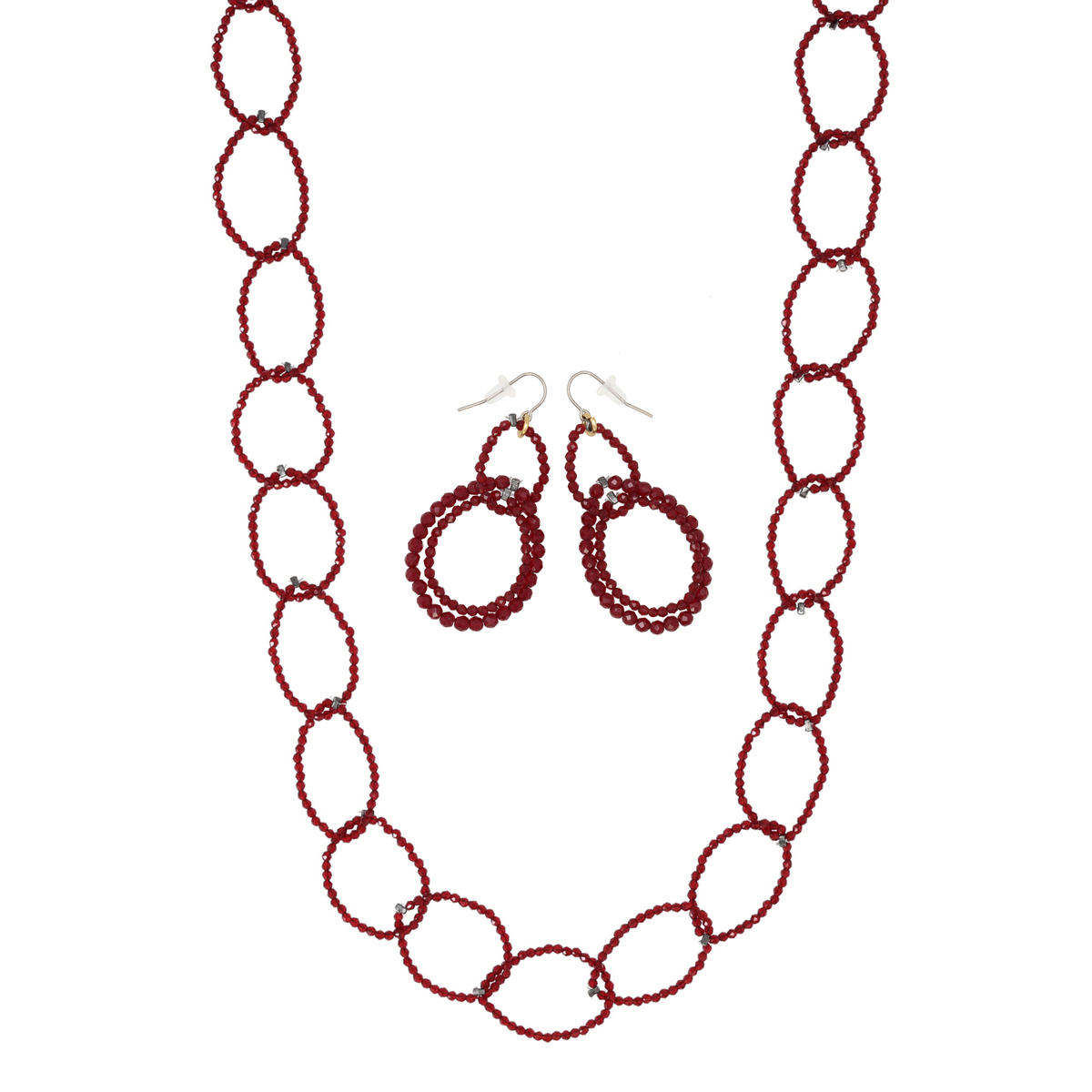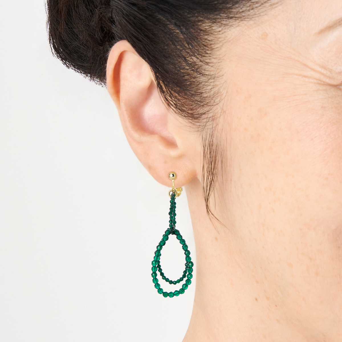 カットガラスを使用したフープネックレスと、イヤリングまたはピアスのセット。装いのポイントになってくれるボリューム感がありながらも、軽やかな着け心地です