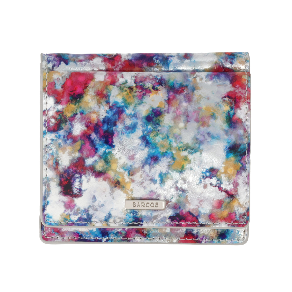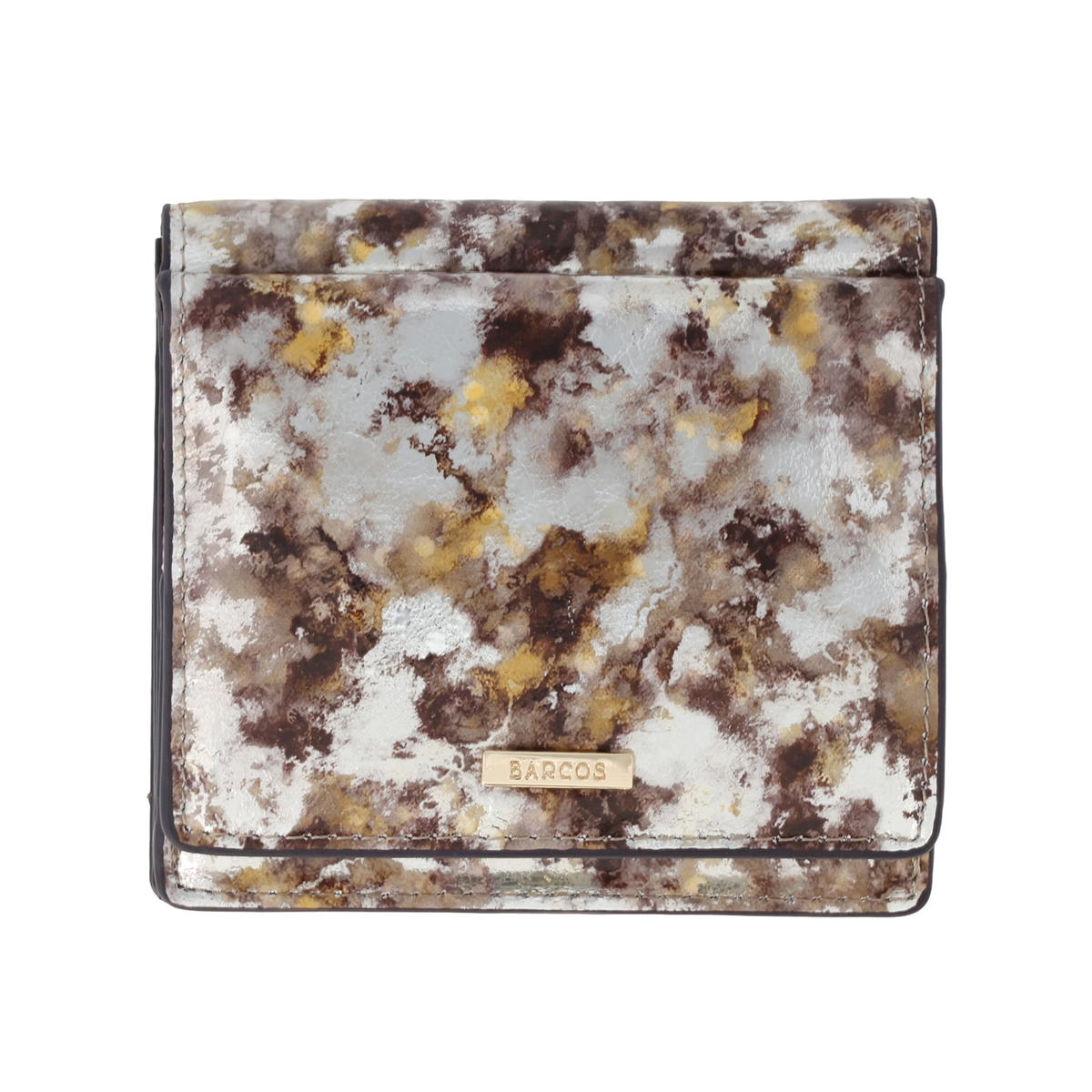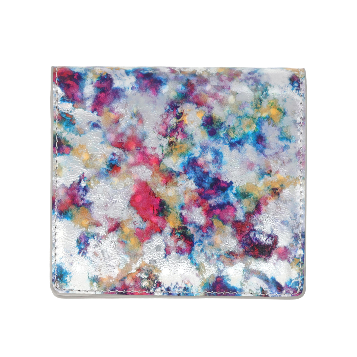 トレンドのメタリックカラーがベース。レザーにプリントで模様を施したペイントレザーデザインです。表面、小銭ポケットの上にオリジナルのプレート付き。札入れが分かれているので、お札の種類を分けたり、領収書・レシートを収納できます