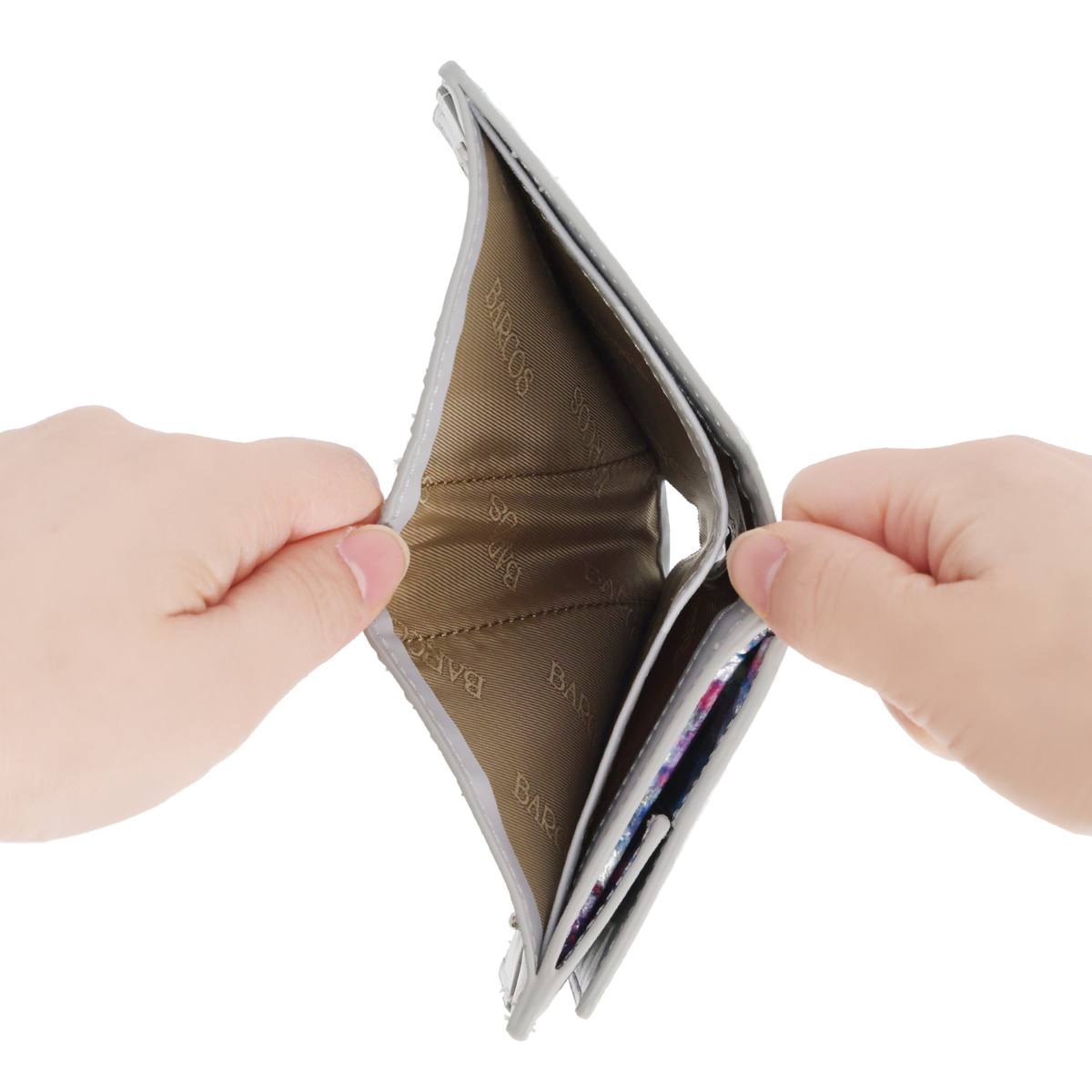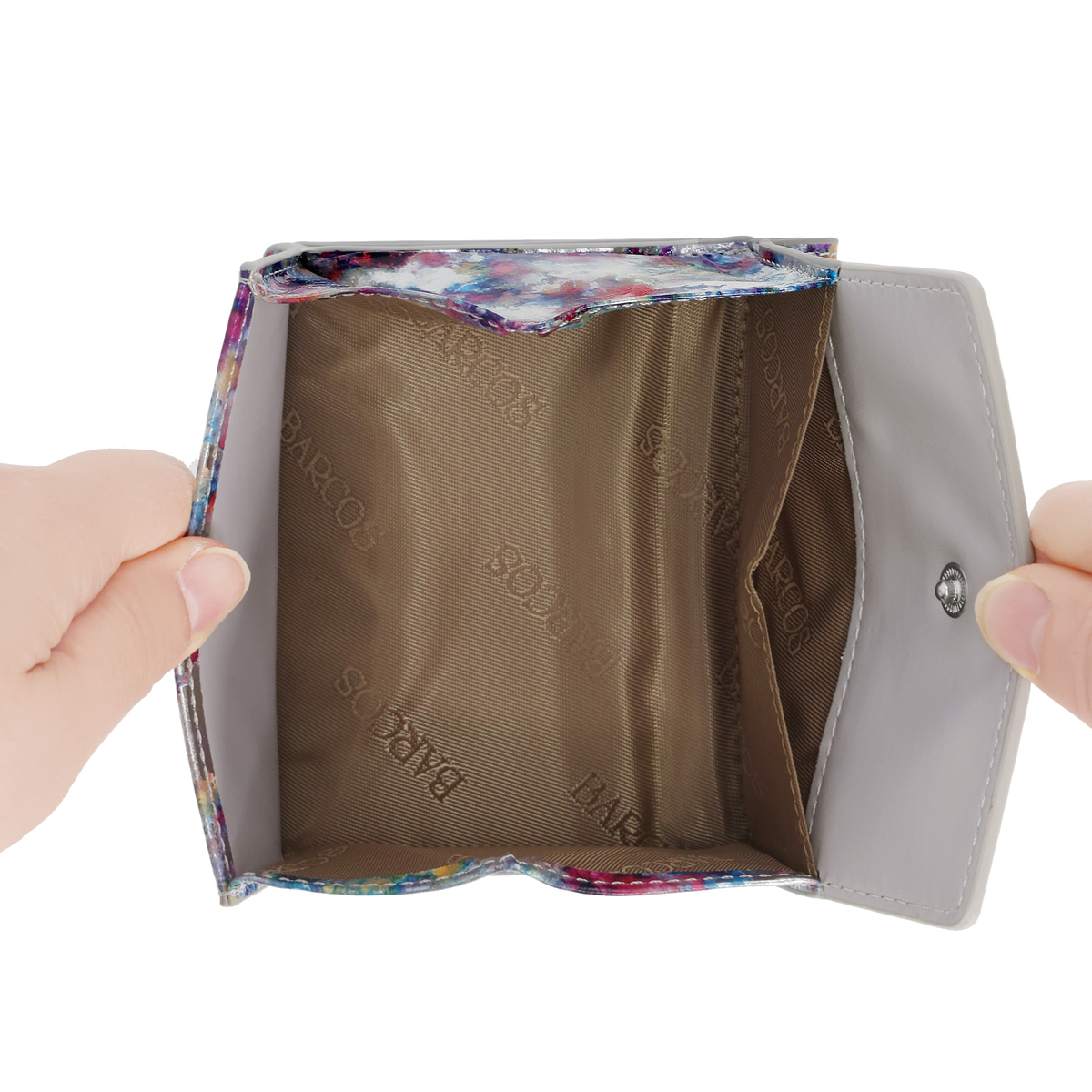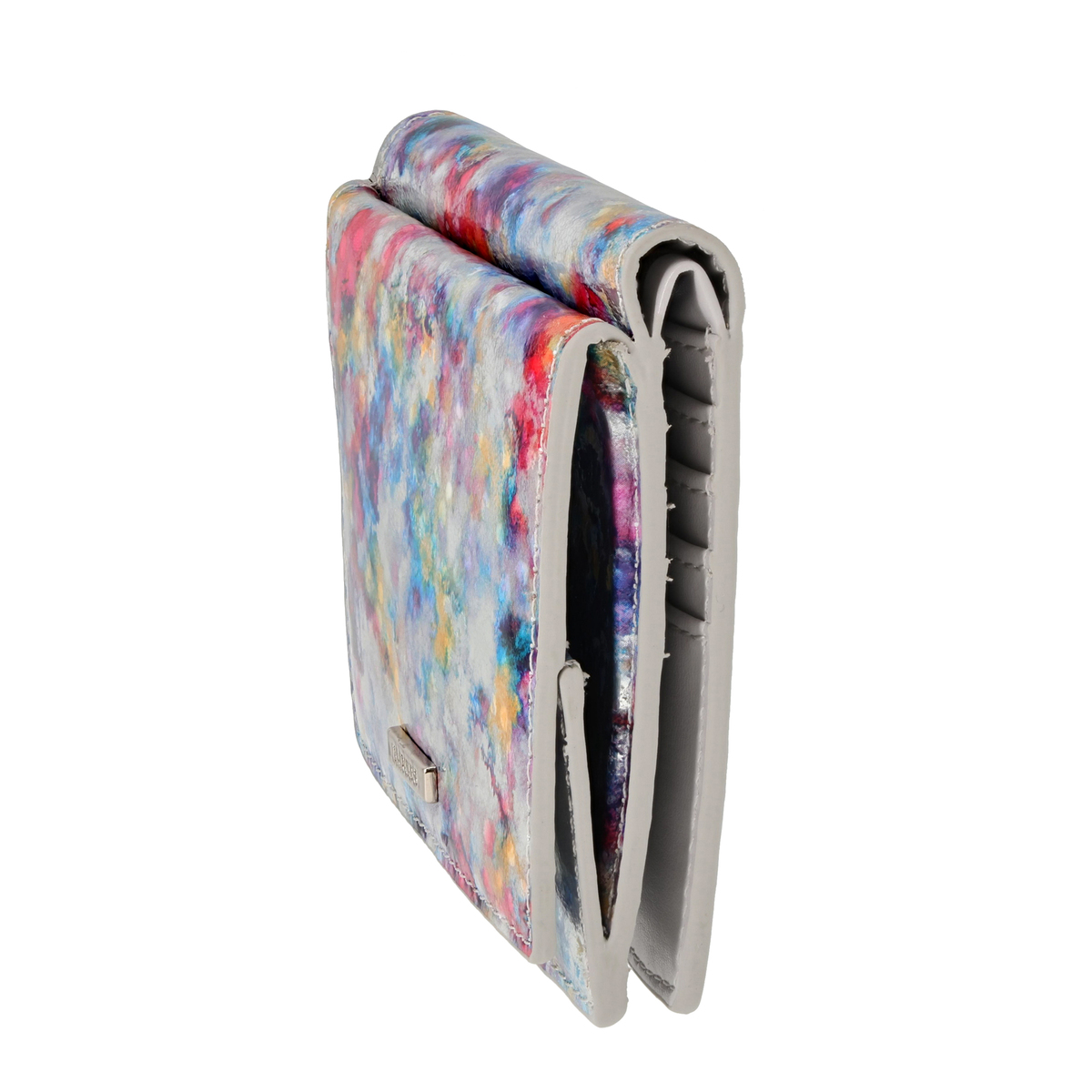 トレンドのメタリックカラーがベース。レザーにプリントで模様を施したペイントレザーデザインです。表面、小銭ポケットの上にオリジナルのプレート付き。札入れが分かれているので、お札の種類を分けたり、領収書・レシートを収納できます