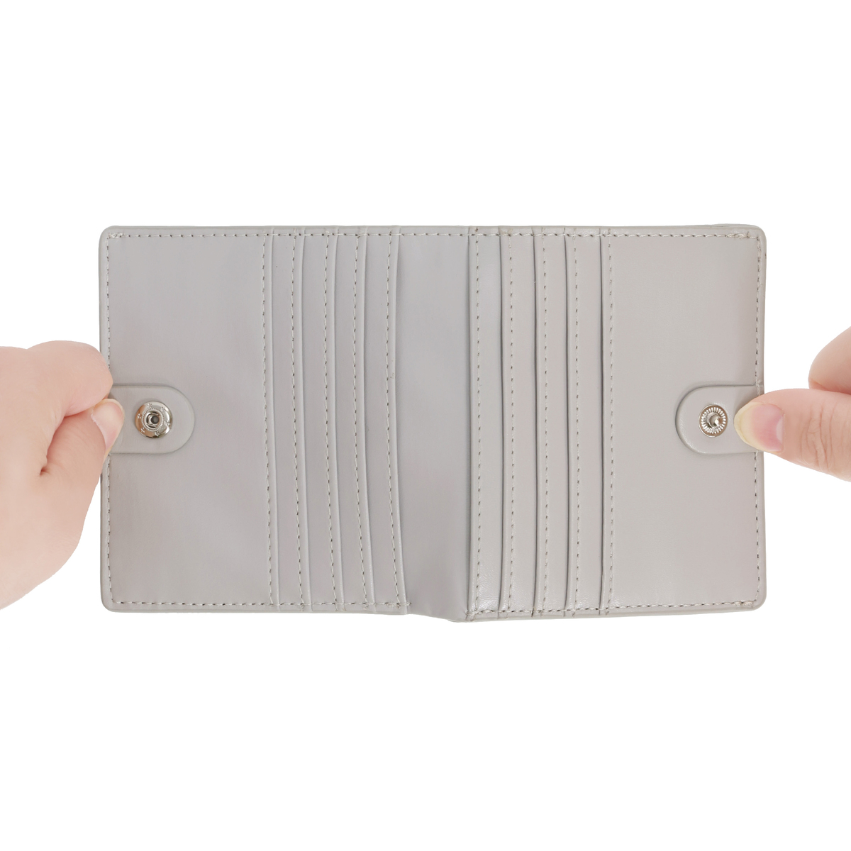 [サイズ(約)] 縦9.5×横10.5×厚み2.5cm [重量(約)] 86g [素材] 表地:牛革 内側:合成皮革 ※裏地有 [仕様] 開閉:スナップボタン式 [ポケット] 内側:カードポケット×8、オープンポケット×1、札入れ×2、 小銭ポケット内にオープンポケット×1 外側:小銭ポケット×1、オープンポケット×1 [注意事項] ※この製品は天然の皮革を使用しており、水や汗、摩擦により色落ちや褪色の場合がございますのでご注意ください ※革本来の風合いを生かすために、一点一点表情や色合い等が異なります ※濡れたときは水気を拭き取り風通しの良い場所で陰干ししてください ※ご着用後は乾いたタオルで汚れや埃等を拭き取り湿度の高い場所は避けて保管してください 【中国製】
