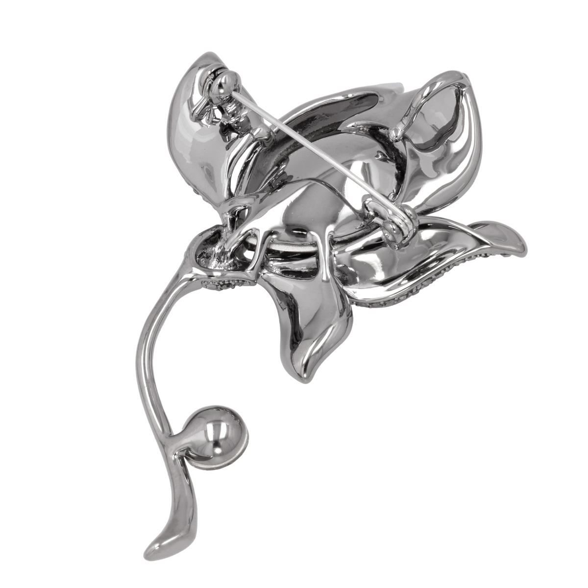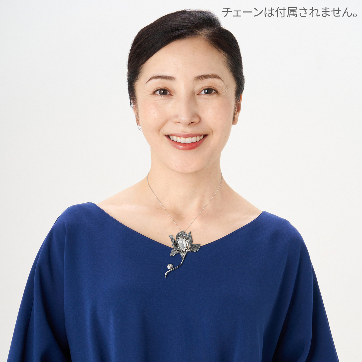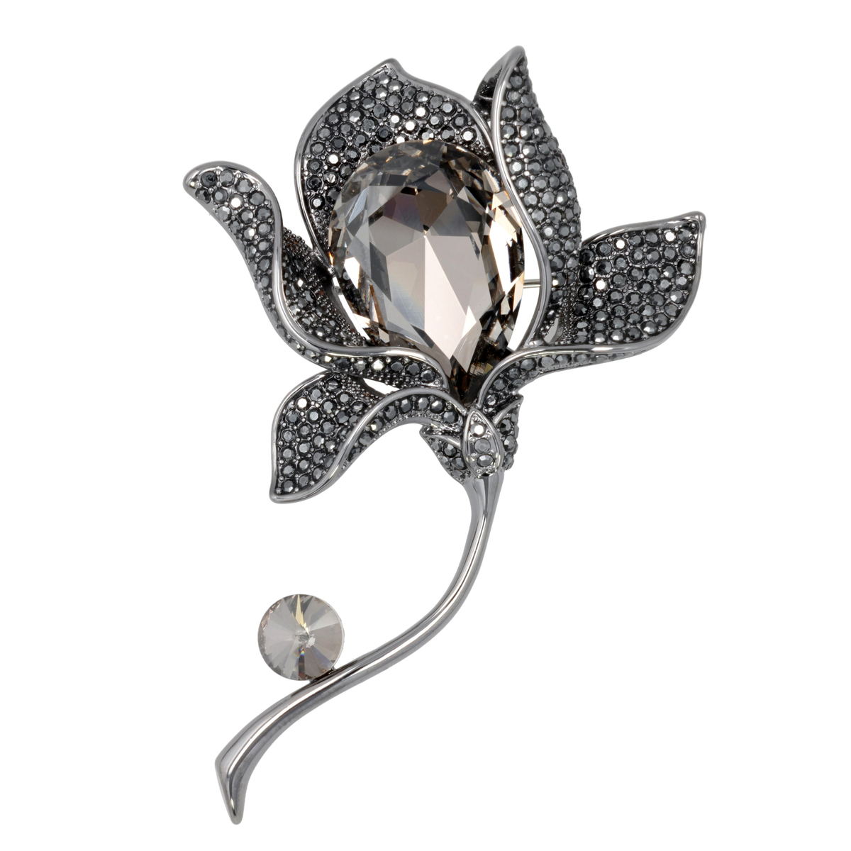 存在感のあるペアシェイプのクリスタルガラスをセットした、フラワーモチーフのブローチ。本体にはブラックカラーメッキを使用。上品な中にクリスタルガラスの輝きがより一層目を引くデザインです