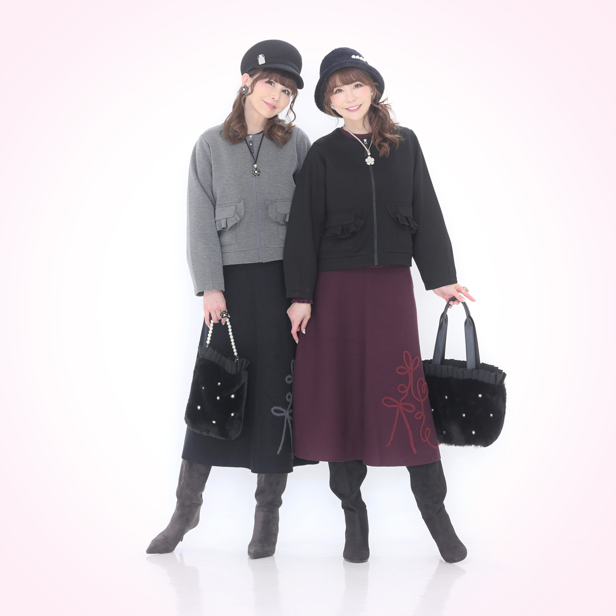 程よい厚みとハリ感のあるダンボール素材を採用し、肌触りが良く、ストレッチ性も備えています。前開きはファスナー仕様で、持ち手にグログランテープとラインストーン付きカシメをあしらい、きらりと光るアクセントがスタイルに彩りを加えます