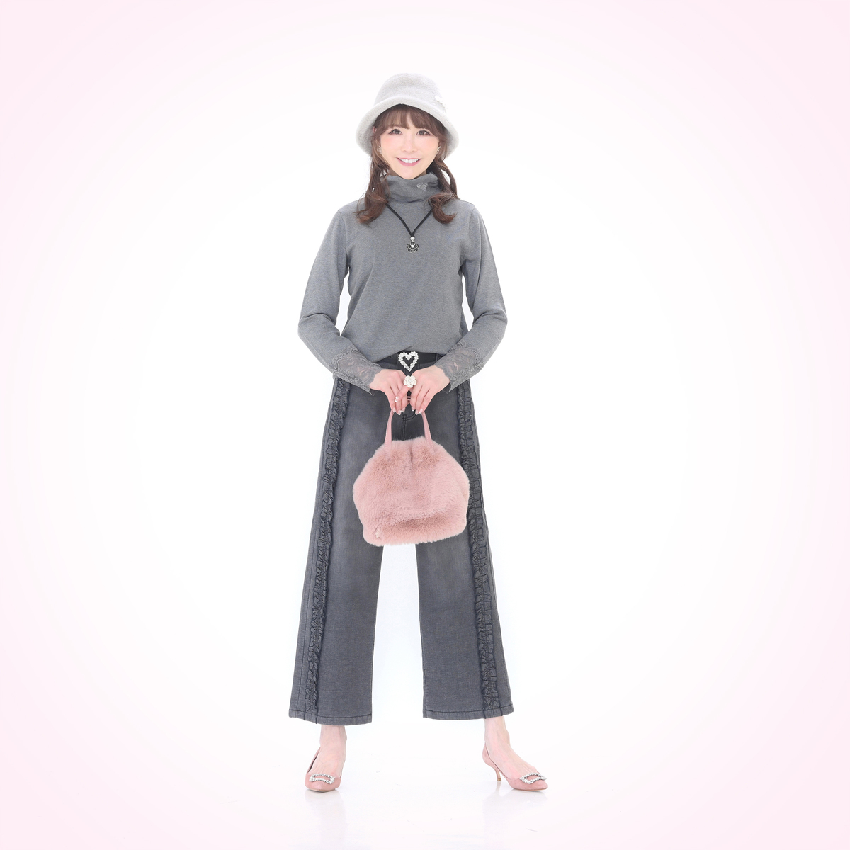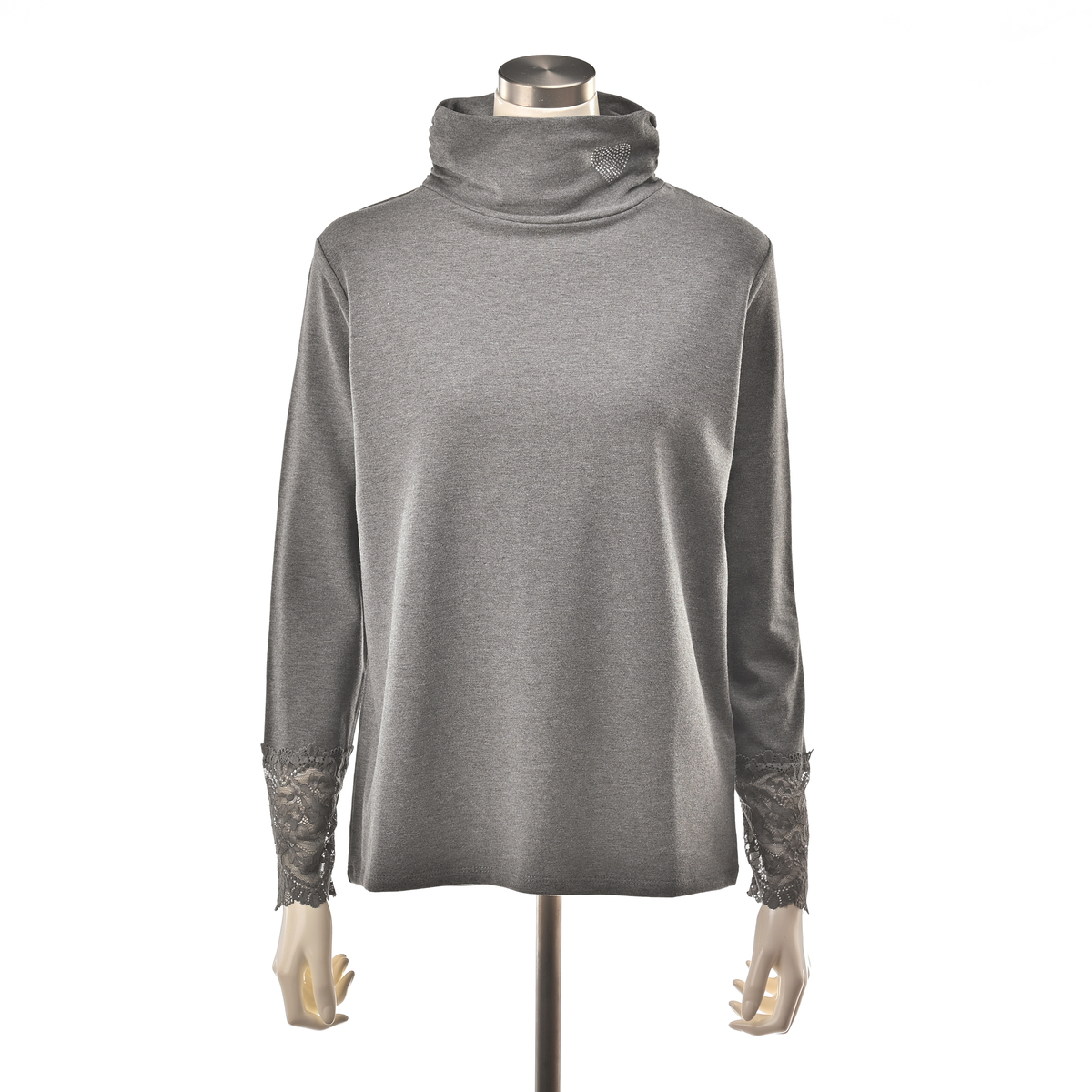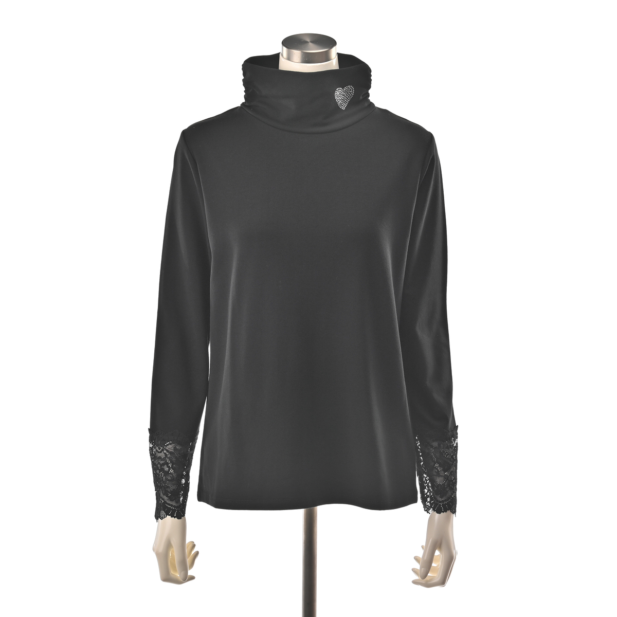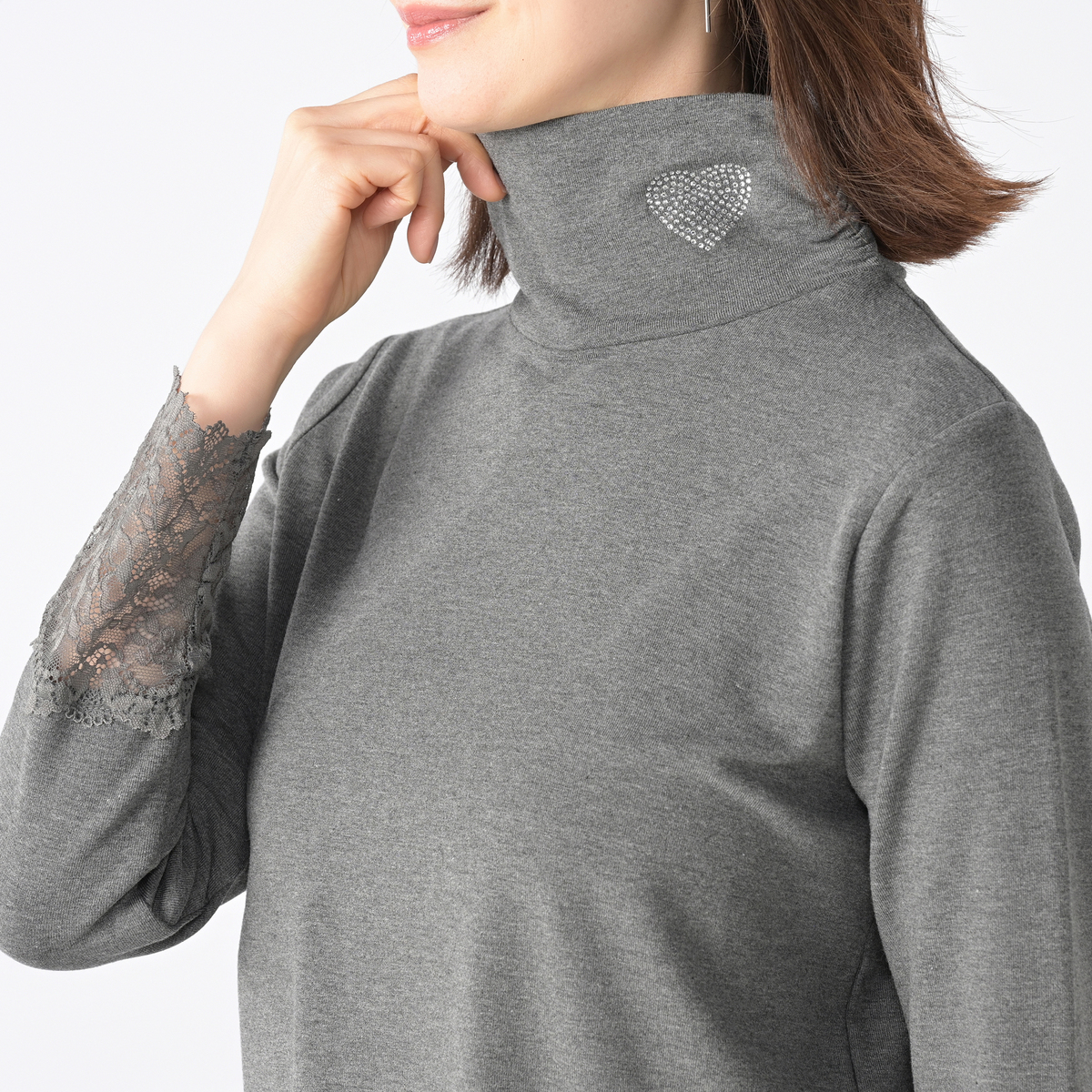 首元はサイドにシャーリングを施したオフタートル仕様。左前にきらめくラインストーンをハート型にあしらい、顔周りを華やかに彩ります