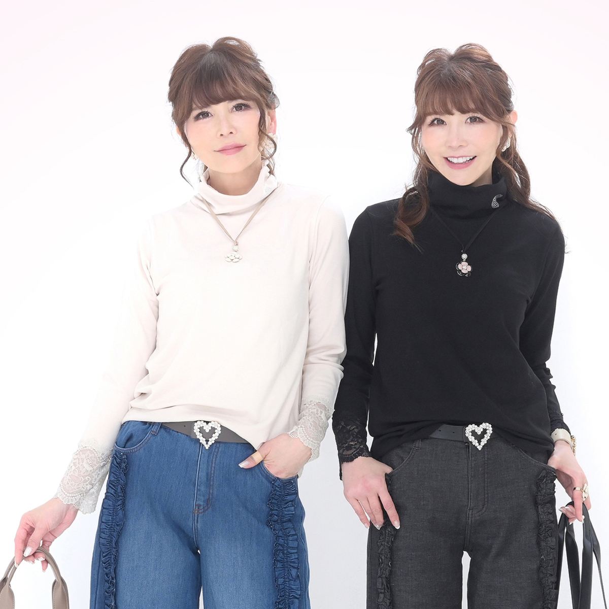 Sサイズが欲しかったのですが、ソールドアウトだったのでブラックのMサイズを買いました。 このブランドの服は可愛らしくて大好きで結構持っています。 タートルネックの服も数枚あり、値段がいつもより高いとおもっていましたが、生地も思っていたより厚く、着心地もとても良かったです。 星四つなのは私が小柄で手足が短く、いつもトップスは手や身丈が長いからです。お二人が背が高く、スタイルも良いから仕方ないことですが、150センチ前後のトップスやパンツもあると嬉しいです。
