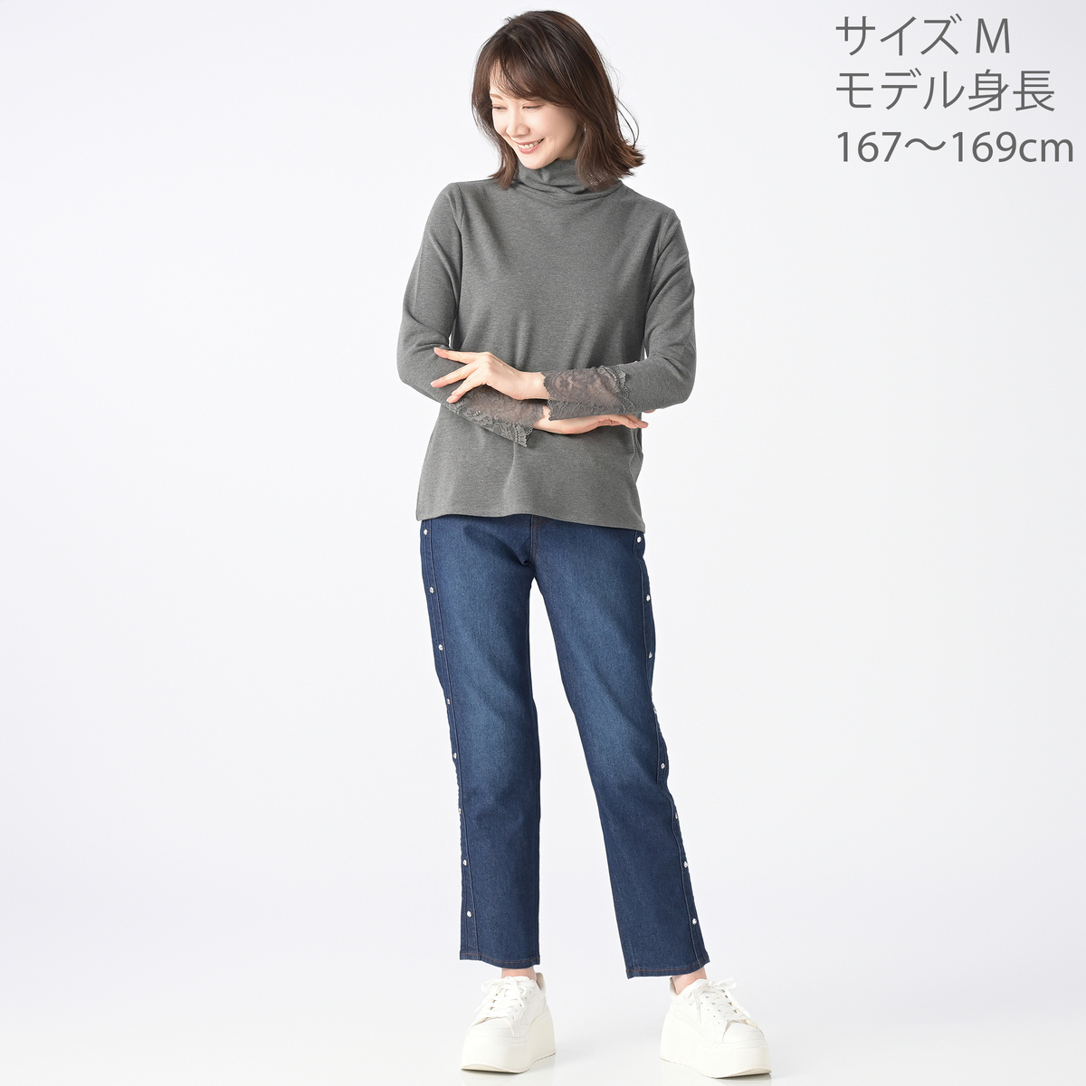 袖口にあしらった広幅レースが華やかなトップス。程良くゆとりがあり身体のラインを拾いにくく、ベーシックな丈感で様々なコーデに活躍します