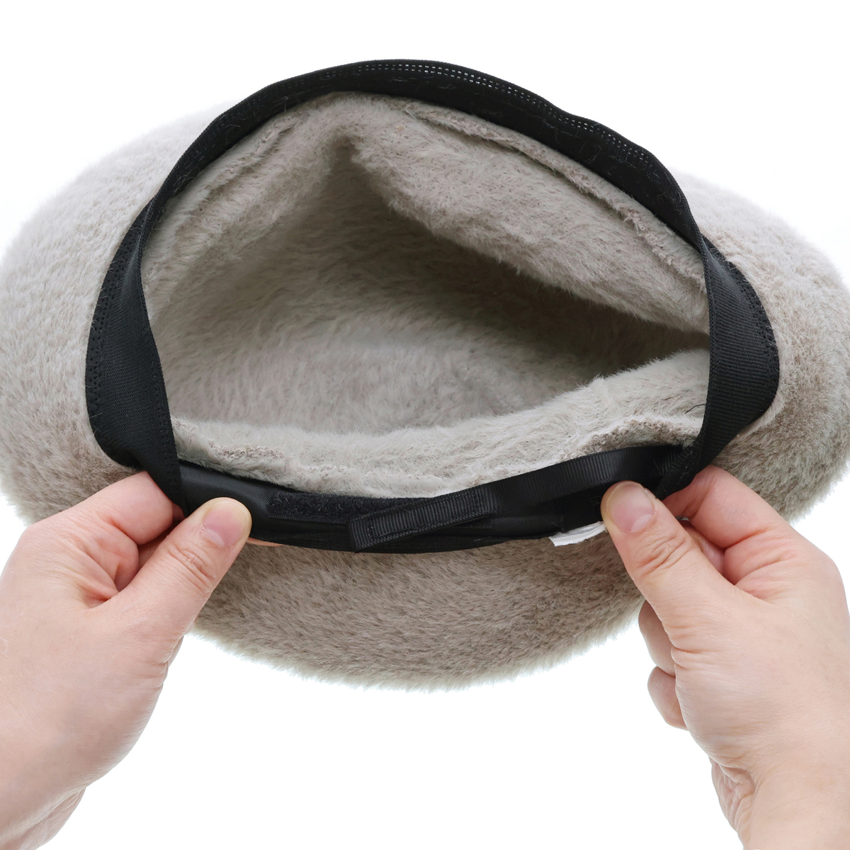 コロンとした形が愛らしく、4連のパール調ビジューがさりげなく輝きをプラス。ワンタッチで手軽にサイズ調整できる汗止め付きで、快適なかぶり心地を楽しめます