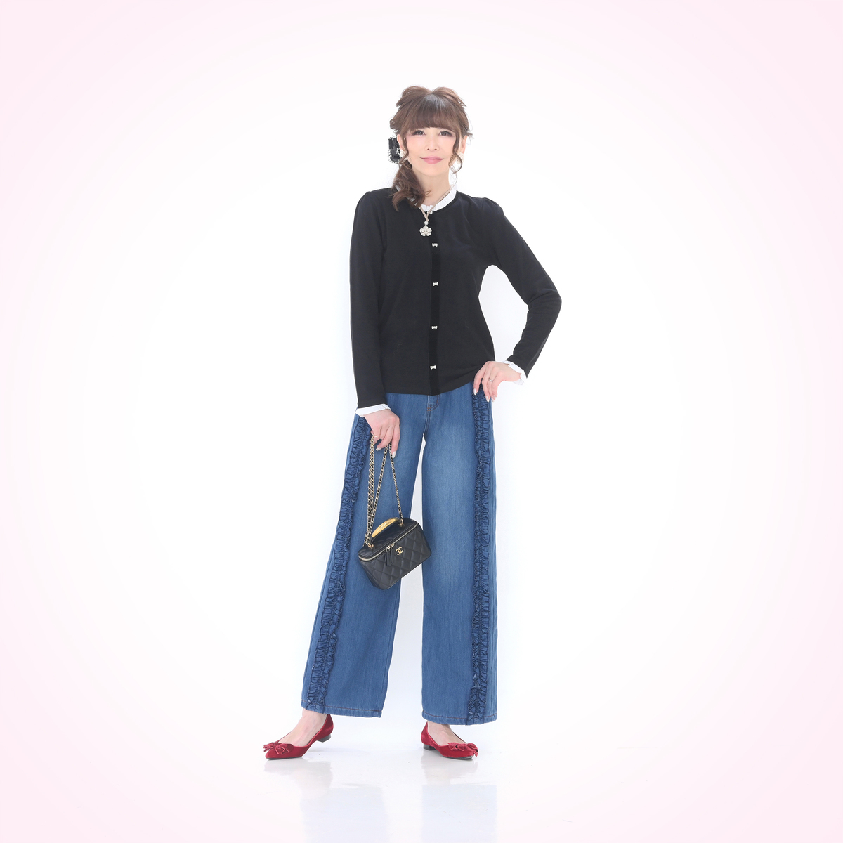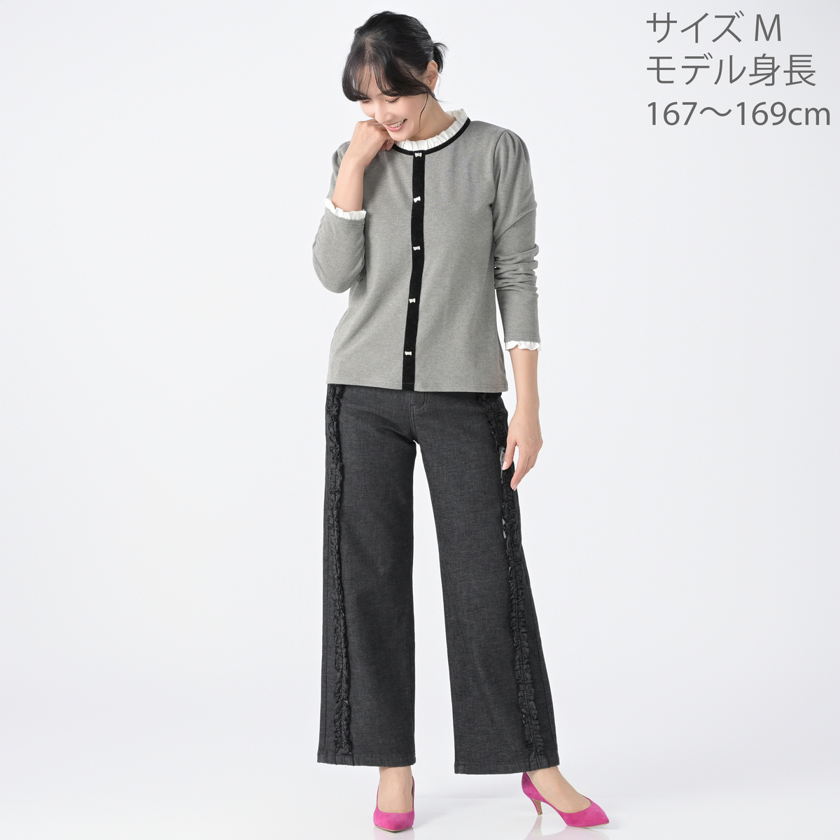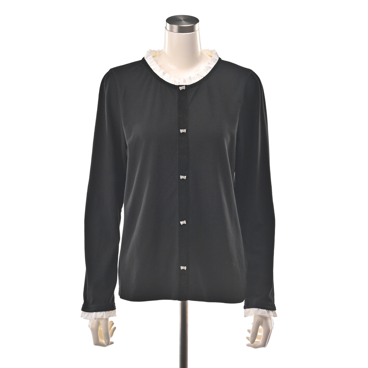 [商品寸法(ヌード)cm] サイズ バスト 着丈 S: 88(72〜80) 57 M: 94(79〜87) 57 L: 100(86〜94) 58 LL: 106(93〜101) 58 3L: 112(100〜108) 59 サイズ 肩幅 袖丈 S: 33 59 M: 34 59 L: 35 60 LL: 36 60 3L: 37 61 [素材] 本体:レーヨン66% ポリエステル28% ポリウレタン6% フリル部分:ポリエステル100% [お手入れ] 洗濯機洗い可 [注意事項] ※商品寸法の誤差は多少発生します。ご了承下さい ※中性洗剤使用 ※洗濯ネット使用 ※浸け置き禁止 ※洗濯後は形を整えて直ぐに干してください ※洗濯又はクリーニングにより縮みや斜行が生じます ※アイロン時当て布使用 ※釦部分アイロン禁止 ※濃色は汗や雨で湿った状態、又は着用による摩擦で他の物に色移りする事がありますのでご注意ください ※配色商品は色移り、色泣きすることがあります。汗・雨・水に濡れたまま放置しないで下さい ※この製品は、強い日光(又は照明)を長時間受けますと変色の恐れがあります。ご着用及び保管の際には、ご注意下さい ※この製品は、デリケートなホットフィックスの装飾物を使用しています。着脱の際の、引っ掛けにご注意下さい。洗濯の繰り返しにより脱落する場合があります 【中国製】
