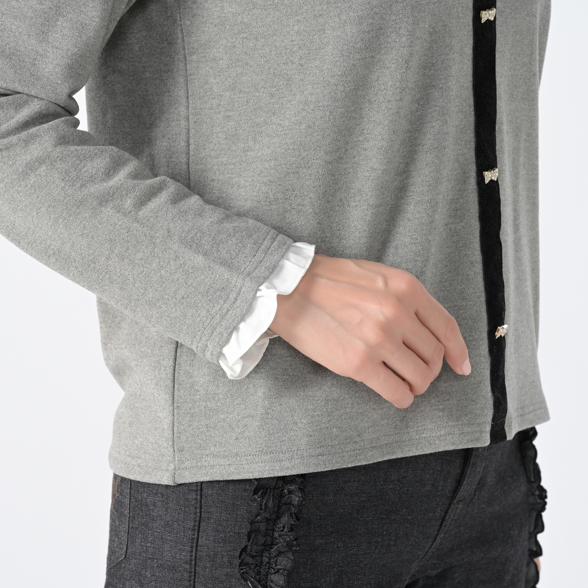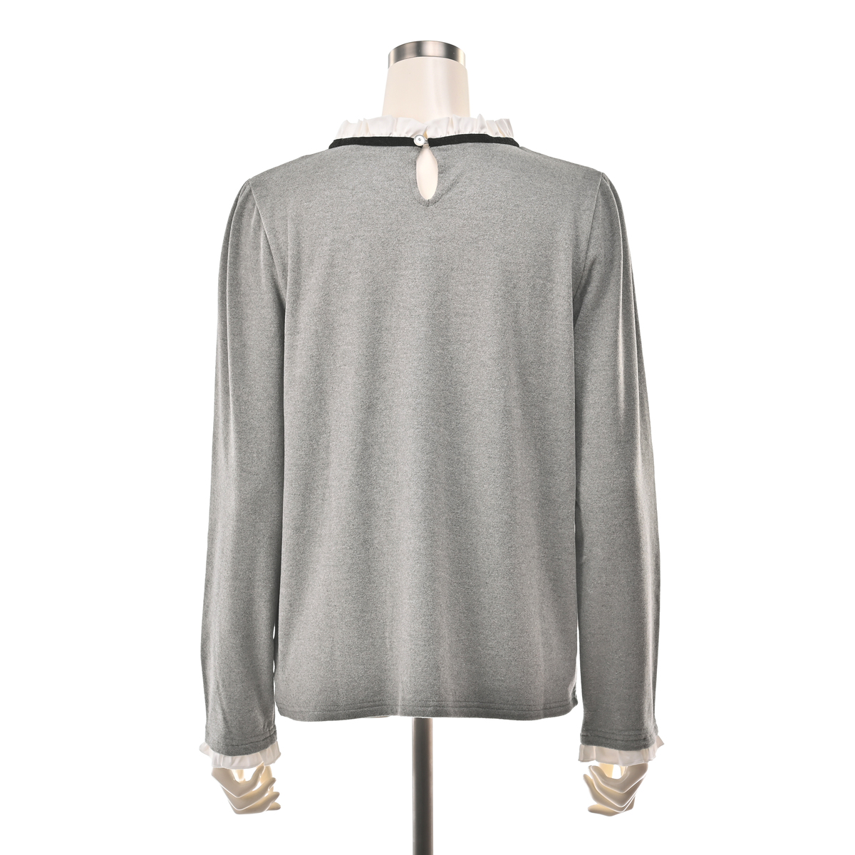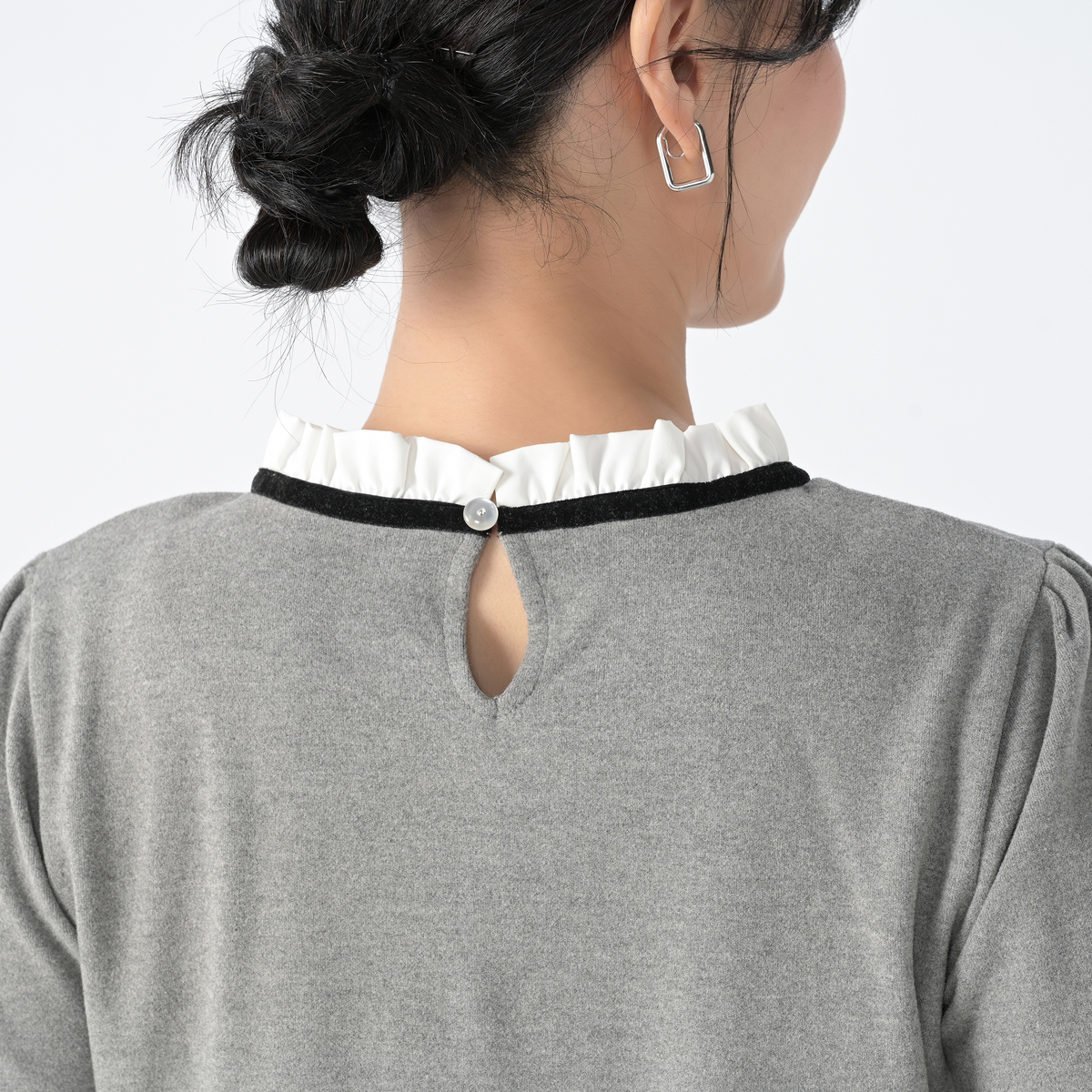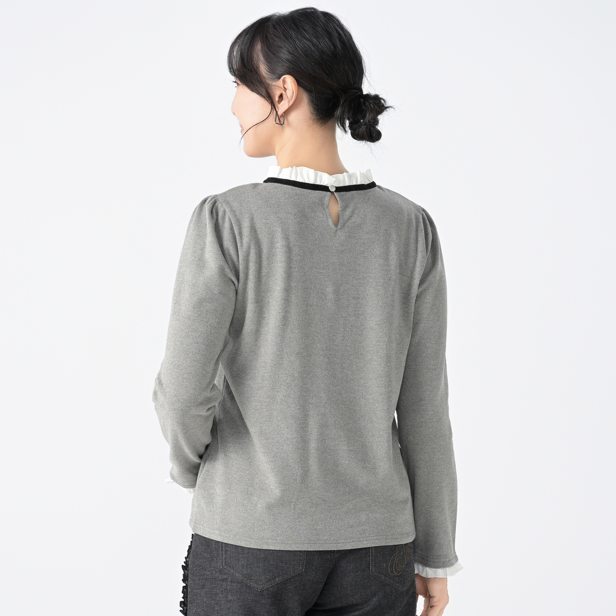 両面起毛のニットソーを採用したトップス。もちもちとしたストレッチ感とやわらかな肌触りで、快適な着心地を実現しました。ナチュラルフィットのシルエットに、衿と袖口にはシャツ地のフリルをあしらい、重ね着風のデザインに仕上げています