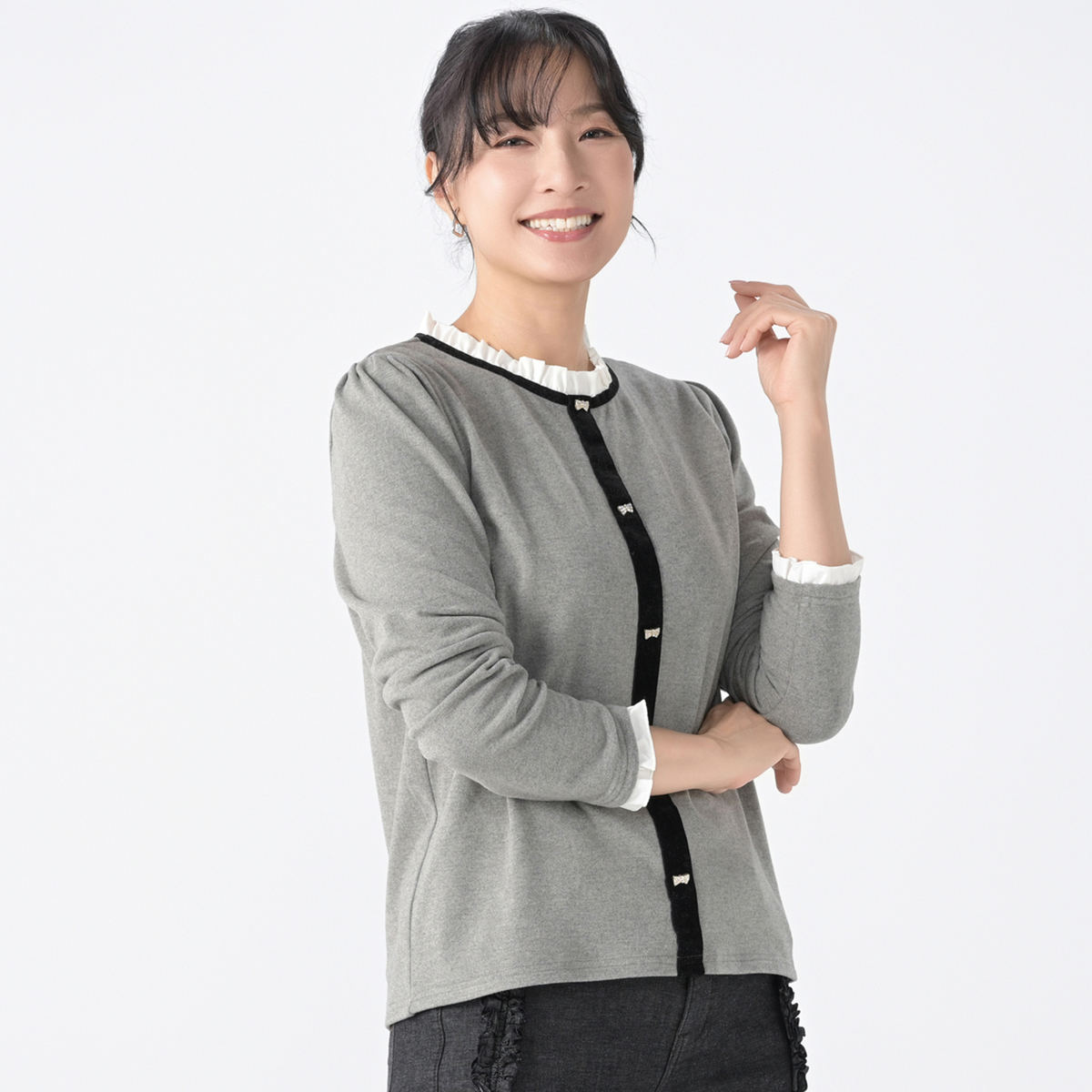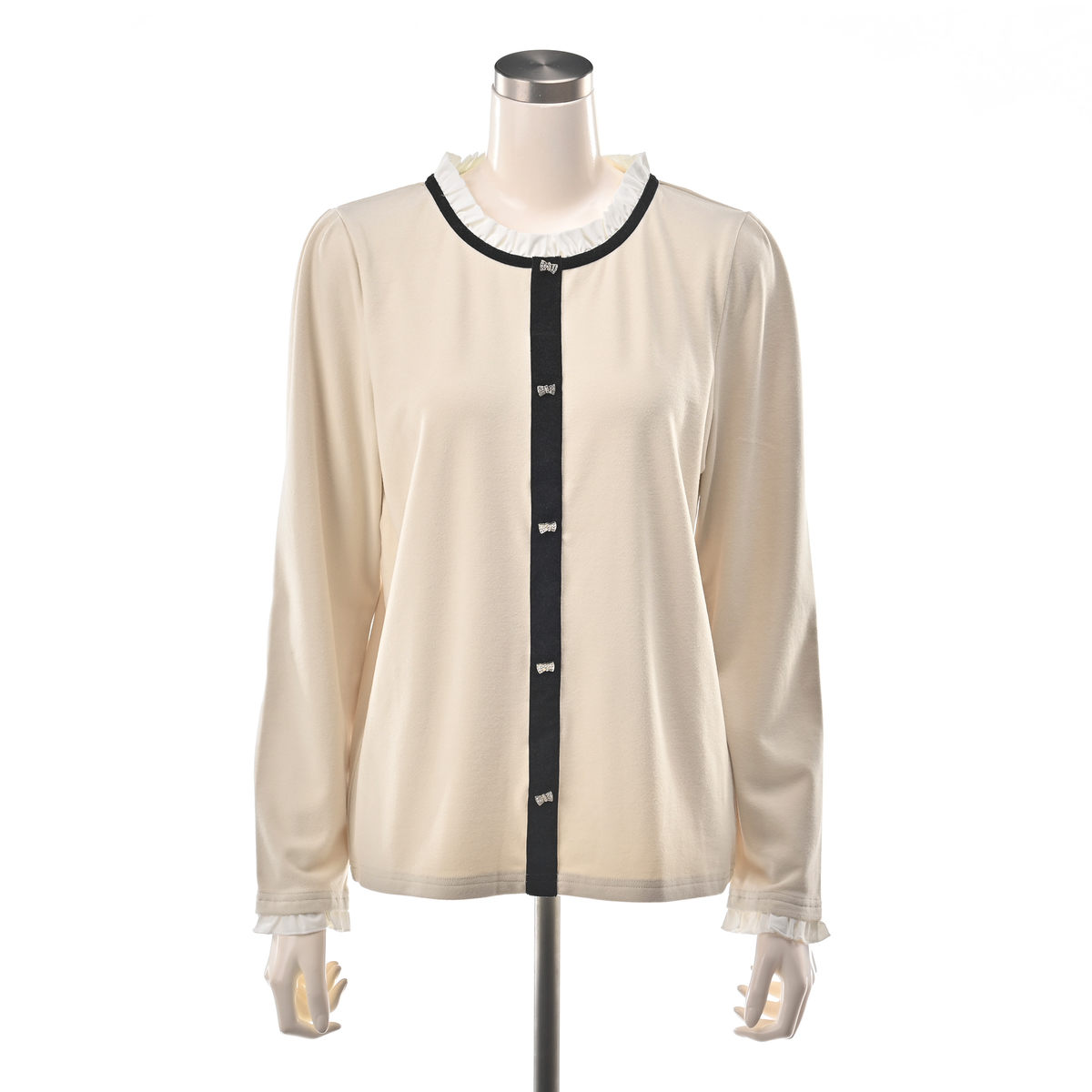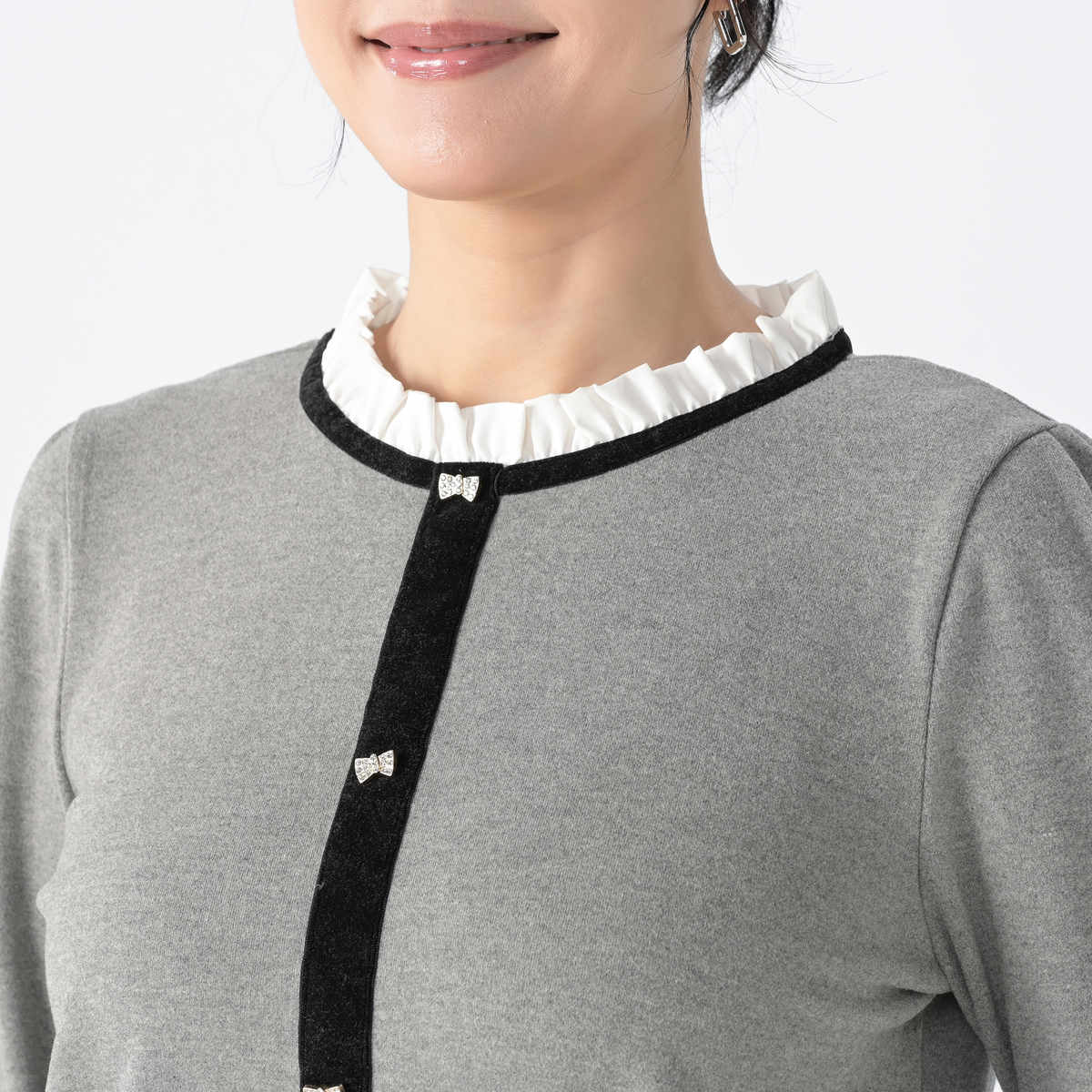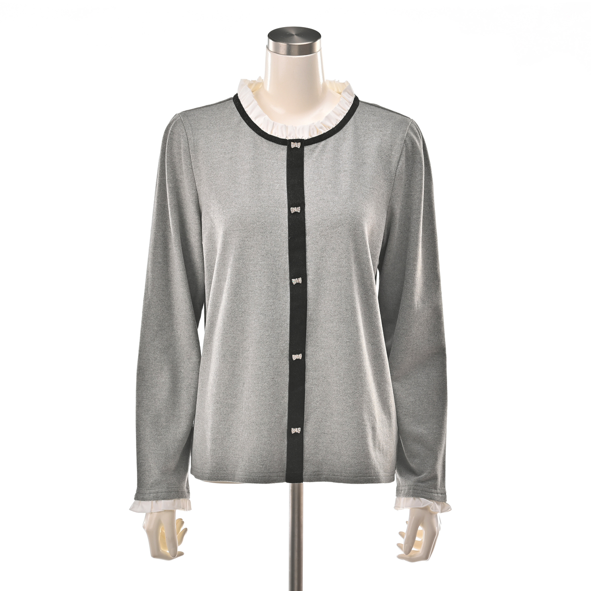 両面起毛のニットソーを採用したトップス。もちもちとしたストレッチ感とやわらかな肌触りで、快適な着心地を実現しました。ナチュラルフィットのシルエットに、衿と袖口にはシャツ地のフリルをあしらい、重ね着風のデザインに仕上げています