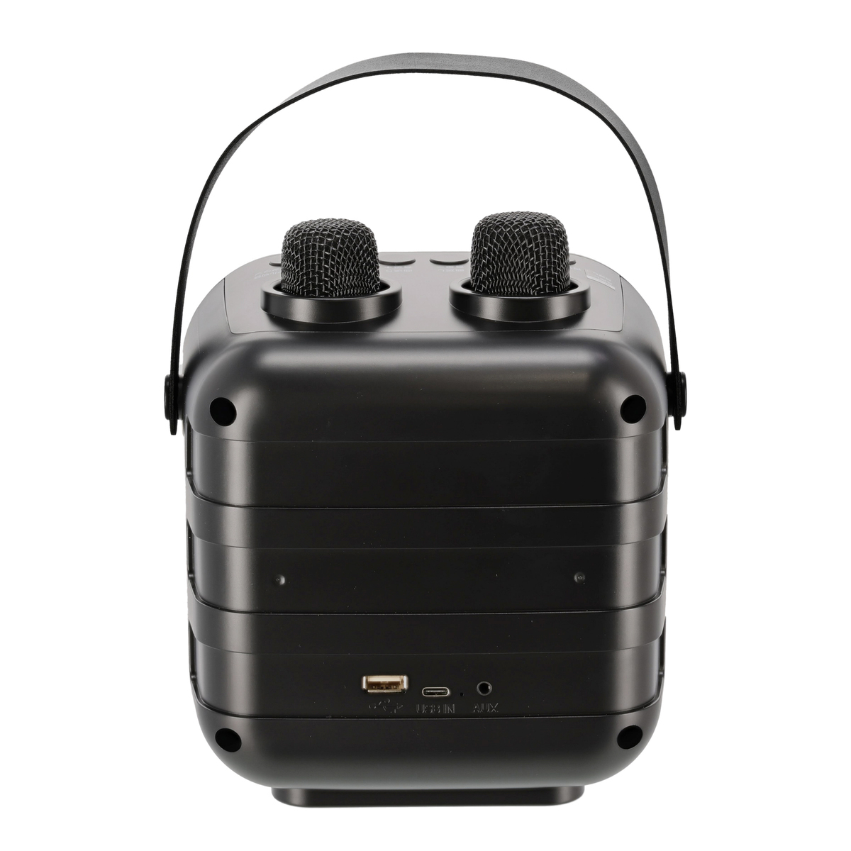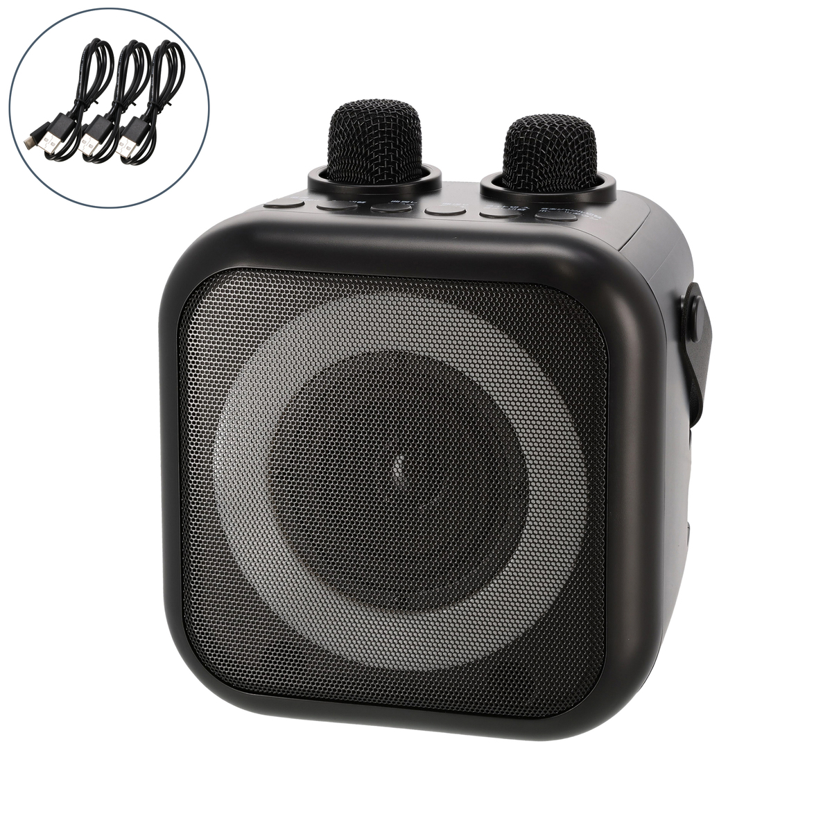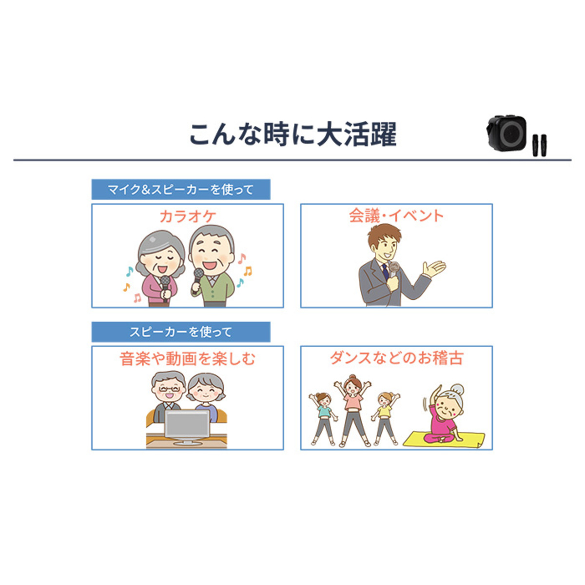 [商品内容] ・本体 ・マイク×2 ・充電ケーブル(TypeAーC)×3 ※ACアダプターは付属しません [サイズ] 本体:幅17.5×奥行14.9×高さ17.6cm マイク:幅3.8×奥行3.8×高さ13.9cm [重量] 本体:850g マイク:80g [充電時間] 本体/マイク共:約4時間 [連続使用時間(約)] 本体:2時間30分(最大音量時) マイク:20時間 ※使用温度範囲 10〜40度 [仕様詳細] 【本体】 電源 リチウムイオン充電池(内蔵):3.7V 2200mAh 定格入力 DC5V 1A(TypeーC)、オーディオ入力 Bluetooth 接続(Ver.5.3)/USBメモリ(FAT32 フォーマット、MP3ファイル)/外部入力(φ3.5mmステレオミニジャック)、マイク入力 Bluetooth 接続(Ver.5.3)×2 チャンネル、スピーカー φ75.5mm10W ( 実用最大出力 5W) 【マイク】 電源 リチウムイオン充電池(内蔵):3.7V 400mAh、定格入力 DC5V 0.2A(TypeーC) 【付属ケーブル】 端 子 :USBーA―USB TypeーC、長さ(約):60cm ■取り扱い説明を十分にご確認の上、ご使用下さい 【中国製】 [注意事項] ※心臓にペースメーカーを装着している方は、絶対に使用しない。また、ペースメーカーを装着されている方や医療機関・医療機器の近くで使用しない ※本製品の無線通信は2.4GHzの周波数帯域を使用します。電子レンジなどの産業・科学・医療用機器の他、工場の製造ラインなどで使用されている移動体識別用の構内無線局(免許を要する無線局)、アマチュア無線局および特定小電力無線局(免許を要しない無線局)などが運用されています ※本製品をご使用になる前に、近くで移動体識別用の構内無線局、アマチュア無線局および特定小電力無線局が運用されていないことを確認してください ※本製品をご使用になる前に、近くで「他の無線局」が運用されていないことを確認してください ※万一、本製品と「他の無線局」との間に電波干渉が発生した場合は、速やかに本製品の使用場所を変える、または機器の運用(電波の発射)を停止してください ※Bluetooth機器が発生する電波は、電子医療機器などに影響を与えることがあります。以下のようなところへは持ち込まない、または電源を入れないようにしてください ・病院などの医療機関、電車、航空機 ・自動ドアや火災報知機の周辺 ・心臓ペースメーカー、医療用電子機器の近く ※危険 絶対に分解・修理・改造をしない。心臓にペースメーカーを装着されている方は、絶対に使用しない。ペースメーカーを装着されている方や医療機関・医療機器の近くで使用しない。傷んだ充電ケーブルは絶対に使用しない。湿気の多い所や水のかかると所への設置は避け、水につけたり、水をかけたりしない ※警告 本体・マイクに強い衝撃を与えない。炎天下や夏場の車内など高温になる場所に放置しない。USB端子を濡れた手で抜き差ししない。充電ケーブルを持って本体・マイクを引きずらない。本体・マイク内部からもれた液にさわらない。本体・マイクを火の中に入れたり、加熱したりしない。意思表示が困難な方に使用させたり、乳幼児の手が届くところで使用したりしない。梱包用ポリ袋などは、乳幼児の手の届かないところに保管する ※注意 水平でない場所や不安定な場所に置かない。隙間にピン・針金などの金属物や異物を入れない。スプレー(殺虫剤・整髪料・掃除用洗剤など)をかけない。次のような場所・環境では使用しない・水がかかるところや湿度が高いところ・使用温度範囲外の環境・ホコリや金属片の多いところ・油や薬品のかかるところ・火気など熱源に近いところ・直射日光のあたるところ 磁気の影響を受けやすいものを近づけない 充電ケーブルの損傷につながる次のようなことはしない。傷付ける・加工する・熱器具に近づける・無理に曲げる・ねじる・引っ張る・束ねた状態で使用する・重いものをのせるなど 付属の充電ケーブル以外は使用しない。また、付属の充電ケーブルを他の機器に使用しない。以下の異常が発生した場合、ご使用を中止し、コールセンターにご相談ください ・本体内部が濡れた場合 ・本体から煙・火花がでた場合 ・ライトが点滅・破損した場合 ・充電中に本体が極端に熱くなる場合 ※12時間以上充電しても満充電にならない場合はご使用を中止する ※10〜40℃の範囲内で充電する ※カバンなどに入れて持ち運ぶ際は、誤作動に気をつける ※犬や猫など、ペットがいる部屋で使用するときは十分注意する ※製品は定期的にお手入れをする ※充電ケーブルを抜くときはケーブルを持たずに必ず先端のUSB端子を持って引き抜く ※収納するときは充電ケーブルを抜く