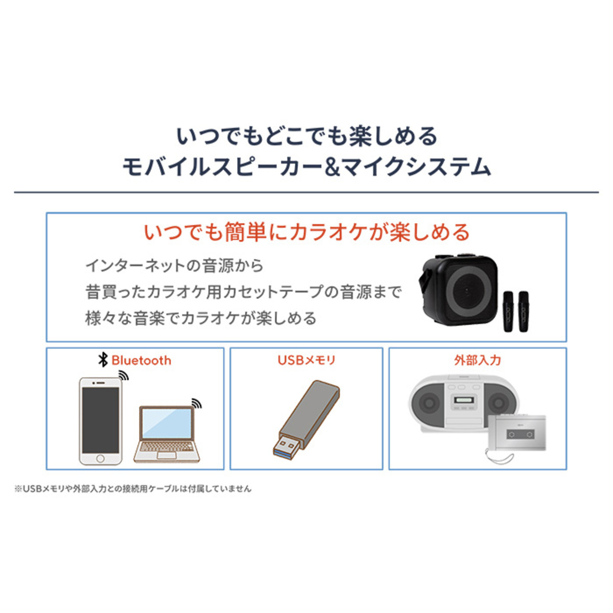 *USBメモリ:付属しません。市販のUSBメモリをご使用ください。MP3形式の音源データファイル以外は再生できません。FAT32でフォーマットされたものを使用してください。Bluetooth、外部入力:再生のための外部機器は付属しません。イヤホンで音源を聴くことはできません