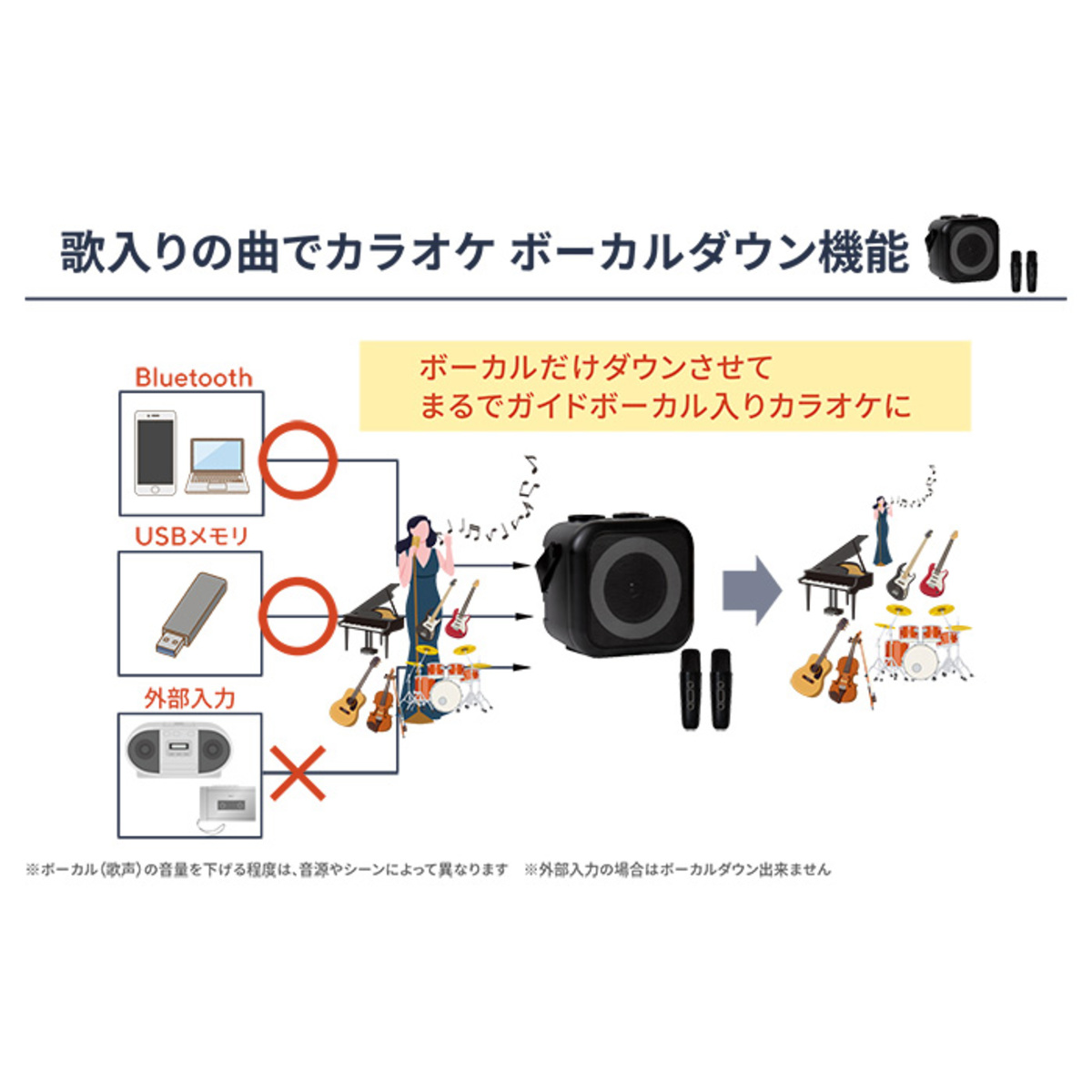 **ボーカル(歌声)の音量を下げる程度は、音源やシーンによっても異なります。特に、複数人で歌うボーカル(歌声)の場合、ボーカルの音量を下げることはできません。外部入力モードでは「ボーカルダウン」機能は使用できません