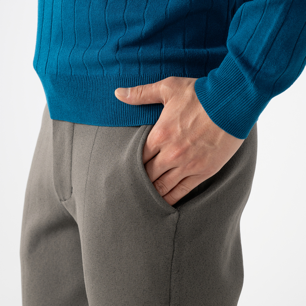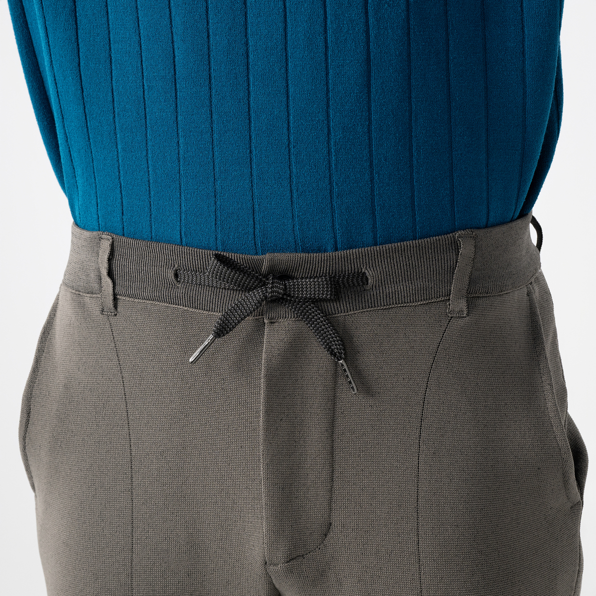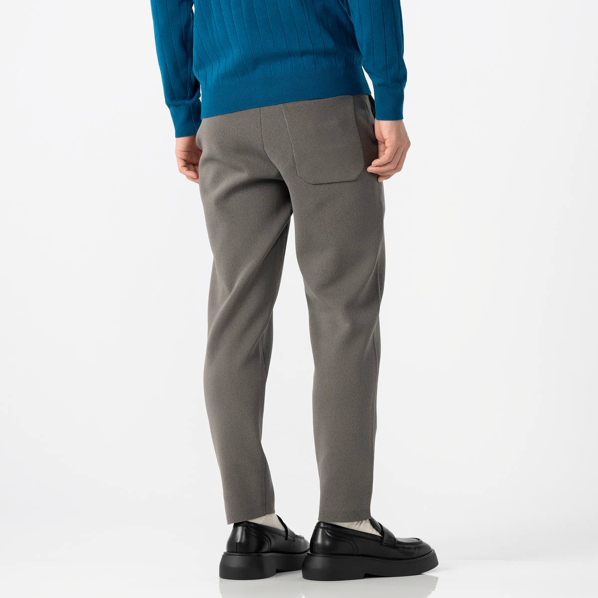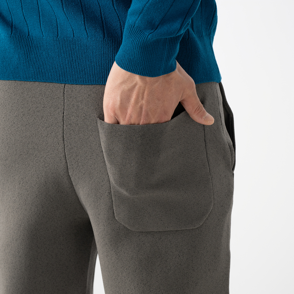 テーパードシルエットが映えるミラノリブパンツ。イージー仕様ながら、レッグラインを美しく見せる形状に仕上げ、家でのリラックスタイムから街歩き、ゴルフなどでも使いやすい一本です