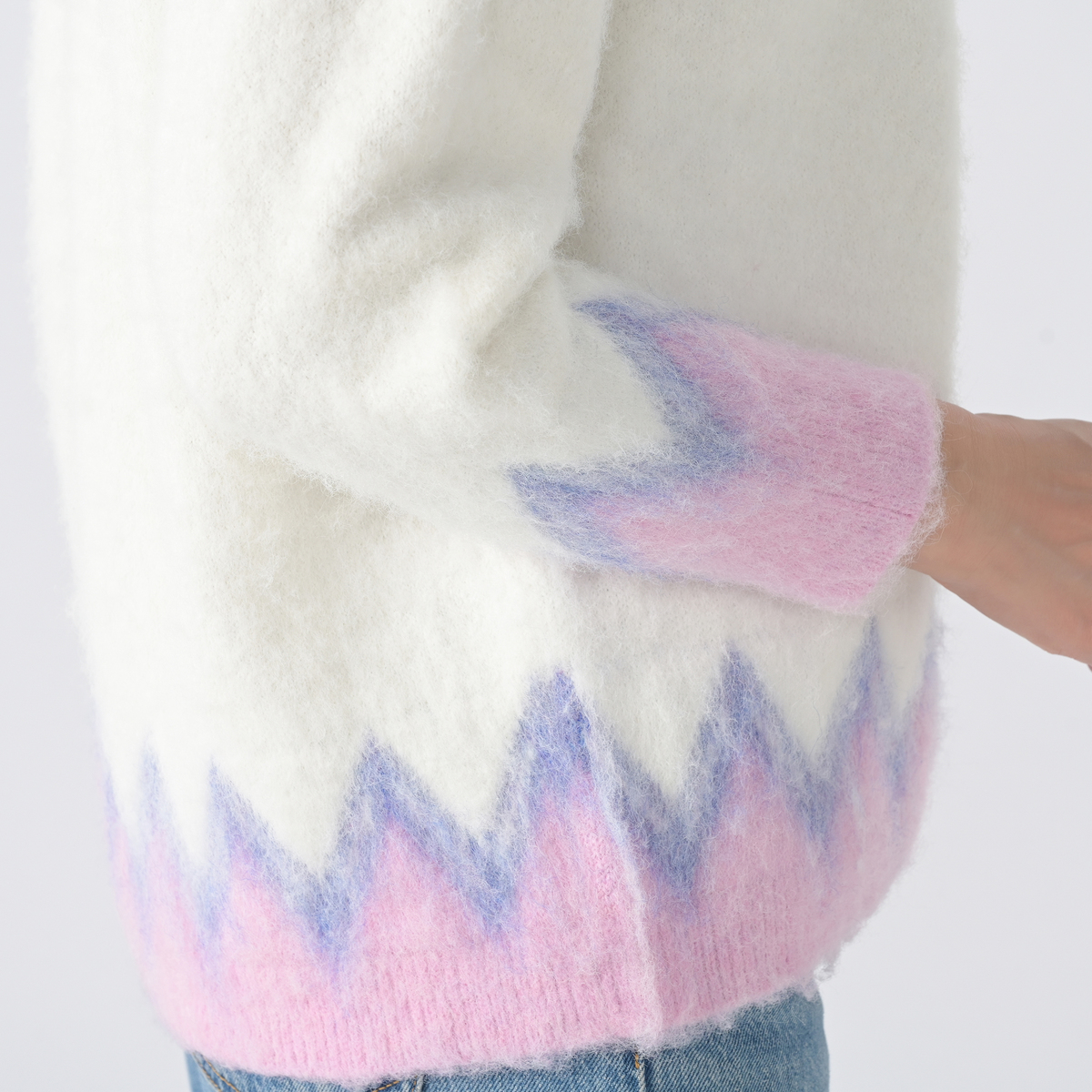 製品を編み立てた後に表面起毛を施して、ふわふわな風合いを作りました。シンプルなボトムスと合わせるだけで、おしゃれが完成します