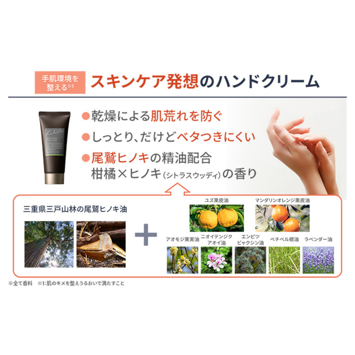 手肌環境を整える(肌のキメを整え、うるおいで満たす)スキンケア発想のハンドクリームです。べたつきにくく、のびが良いテクスチャーで、乾燥による肌荒れを防ぎます。香料としてヒノキ木油を中心に数種の柑橘をブレンドし、爽やかさと安らぎを感じさせるようなシトラスウッディの香りです