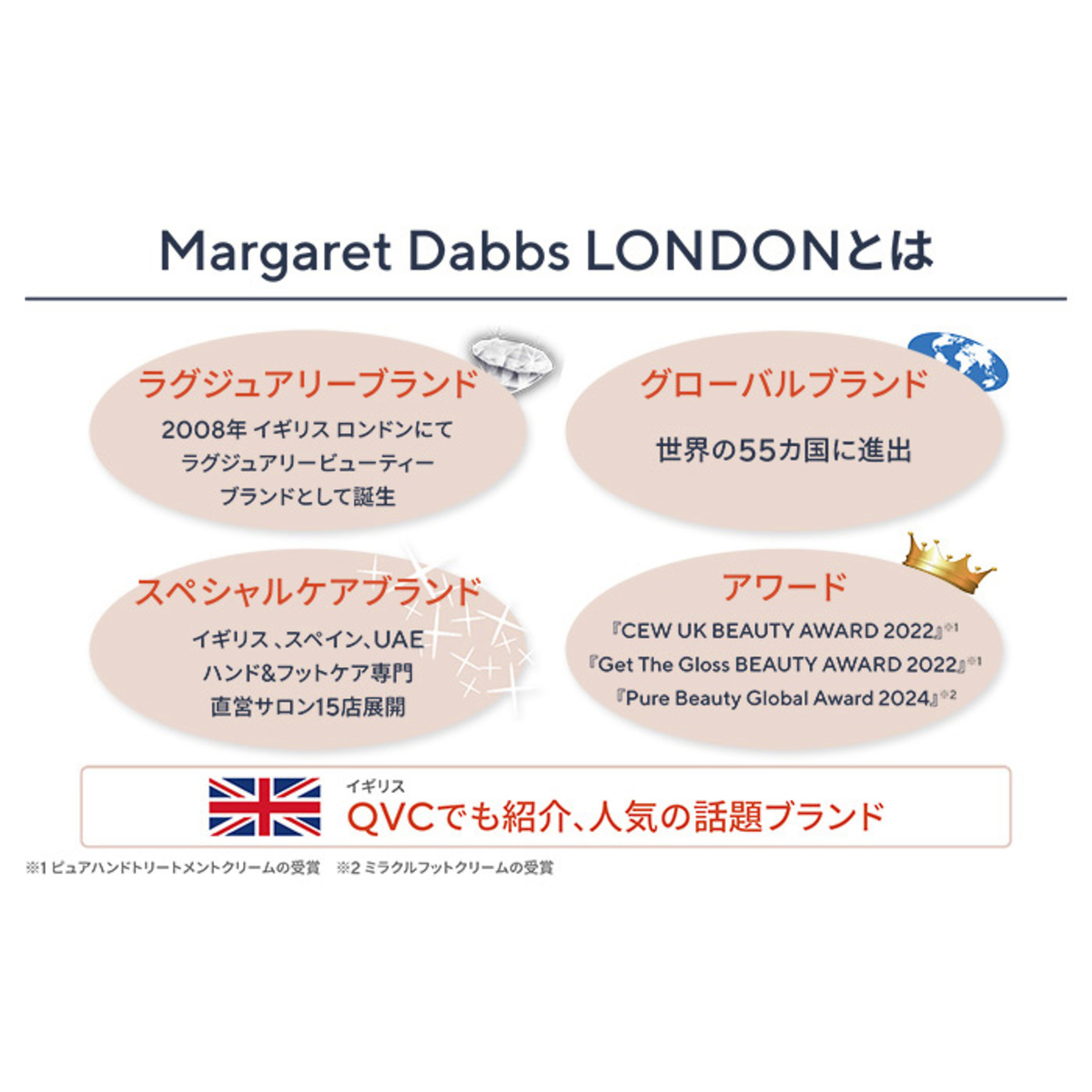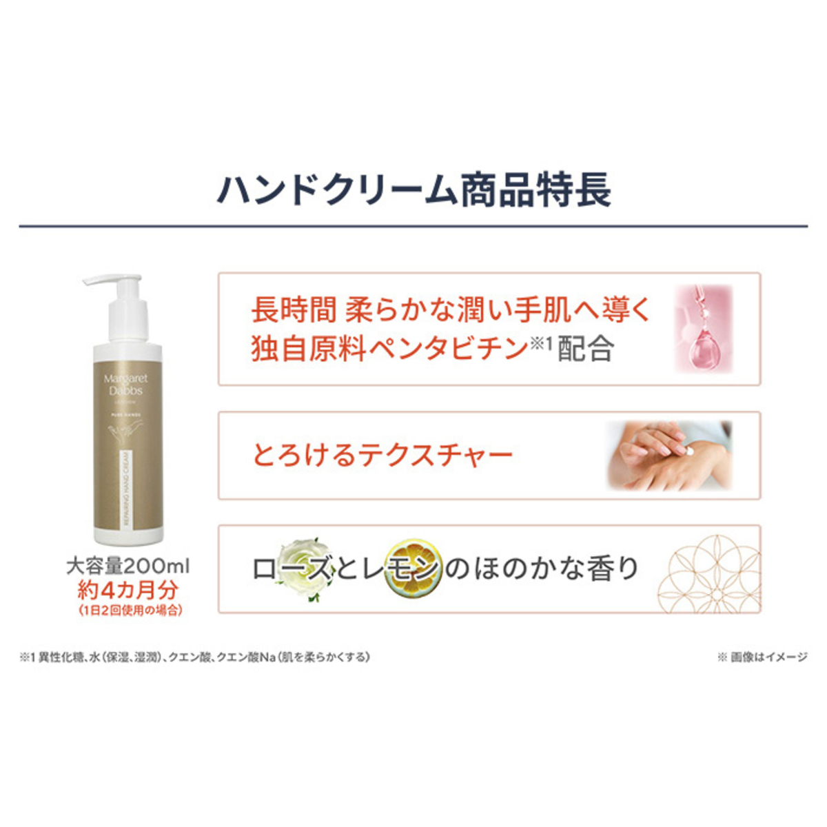 [商品内容] Margaret Dabbs ピュアハンドトリートメントクリーム200ml [使用方法] 少量のクリームを手の甲に取り、優しくマッサージしながら肌になじませます。必要に応じて繰り返しお使い下さい [注意事項] ※お肌に異常が生じていないかよく注意してご使用ください。本品がお肌に合わない次のような場合には、使用を中止してください。そのまま使用を続けますと、症状を悪化させることがありますので、皮膚科専門医等にご相談されることをおすすめします (1)使用中、赤み、はれ、かゆみ、刺激、色抜け(白斑等)や黒ずみ等の異常があらわれた場合 (2)使用したお肌に、直射日光があたって上記のような異常があらわれた場合 ※傷やはれもの、しっしん等、異常のある部位にはご使用にならないでください ※お肌の弱い方は腕の内側の皮膚の弱い部分に少量を塗布し、赤みやかゆみが起きないことをご確認ください ※目に入らないようにご注意ください。万一、目に入った場合は、すぐに水またはぬるま湯で洗い流してください ※乳幼児の手の届かない所に保管してください ※高温または低温の場所、直射日光のあたる場所には保管しないでください 【イギリス製】 [成分] 水、トリ(カプリル酸/カプリン酸)グリセリル、グリセリン、ブドウ種子油、セテアリルアルコール、アーモンド油、ステアリン酸グリセリル、リノール酸、(C15-19)アルカン、炭酸ジカプリリル、オリーブ油脂肪酸セテアリル、フェノキシエタノール、ベンジルアルコール、オリーブ油脂肪酸ソルビタン、セテアリルグルコシド、オレイン酸、異性化糖、ステアロイルグルタミン酸Na、 サンタンガム、パルミチン酸、香料、ステアリン酸、EDTA-2Na、エチルヘキシルグリセリン、クエン酸、デヒドロ酢酸、リモネン、ゲラニオール、リノレン酸、シトロネロール、グルコース、リナロール、シトラール、トコフェロール、クエン酸Na、オイゲノール