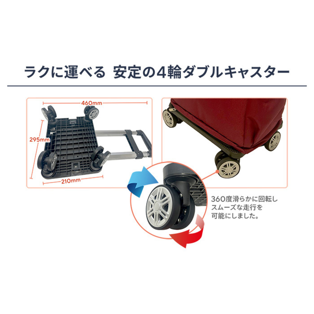直径約5cmのコンパクトで安定感のあるダブル車輪のキャスターを採用。段差に強い構造で、快適に持ち運びできます