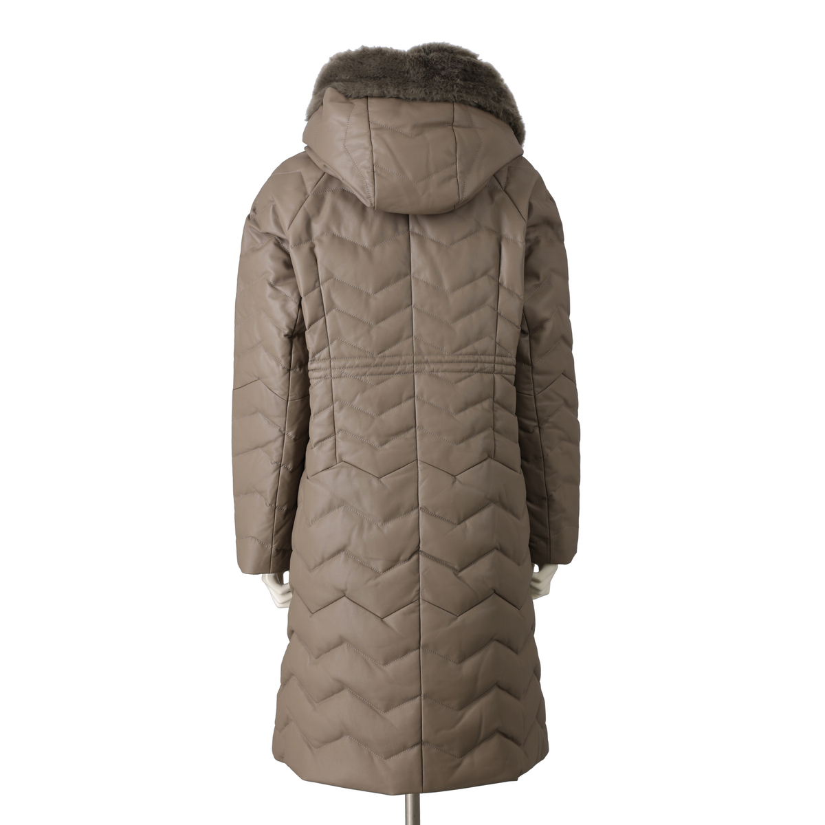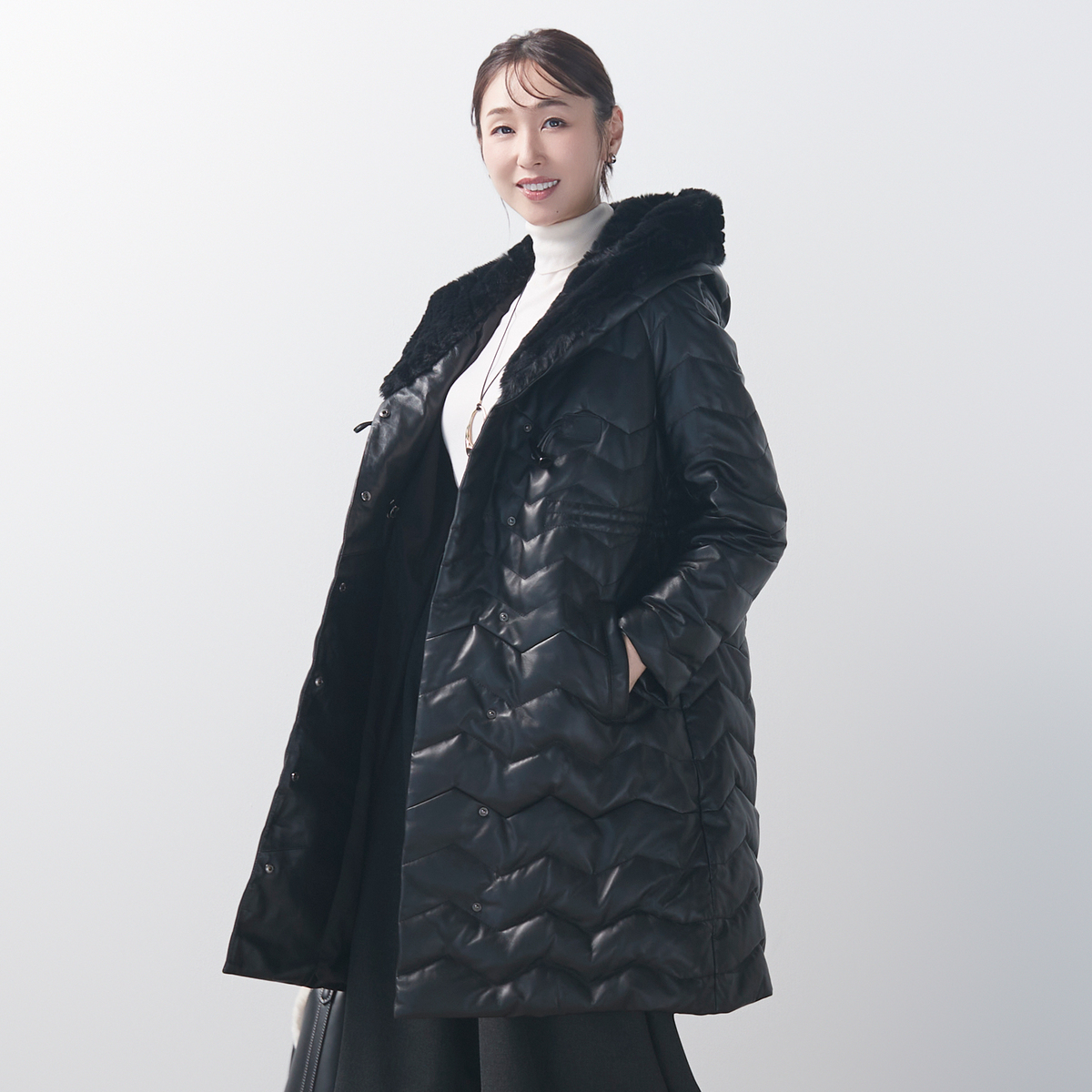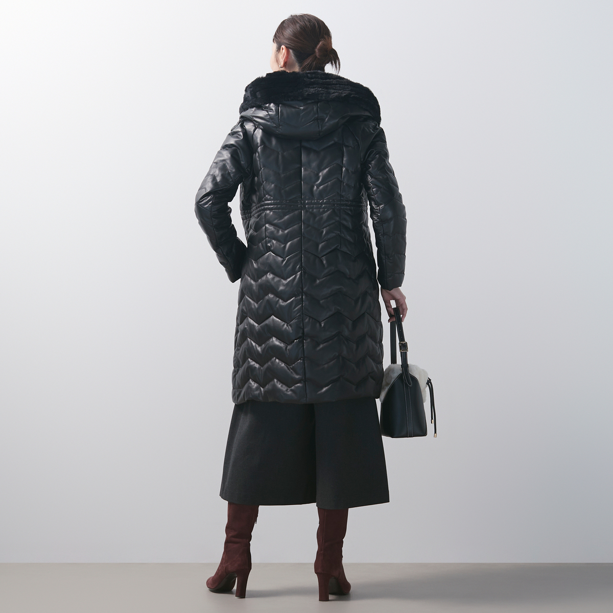 上品な羊革を贅沢に使用。ソフトタッチのダウンコートに仕立てました。フード裏にはフェイクファーをあしらいました。シェブロパターン*のキルトステッチで、さりげなく個性を醸し出したデザインです