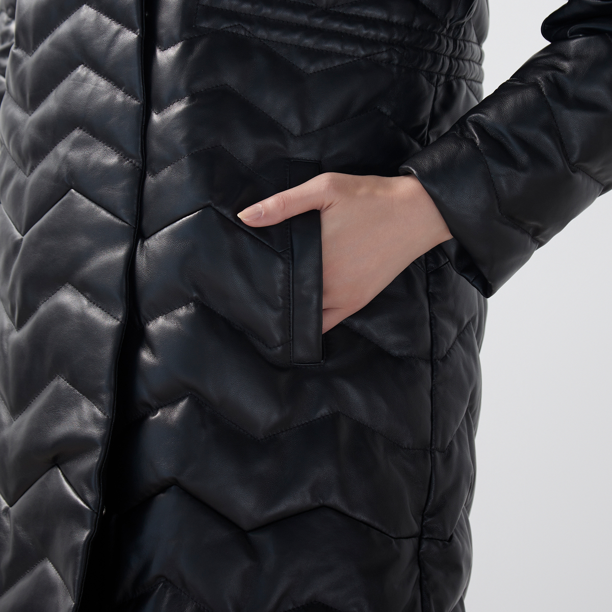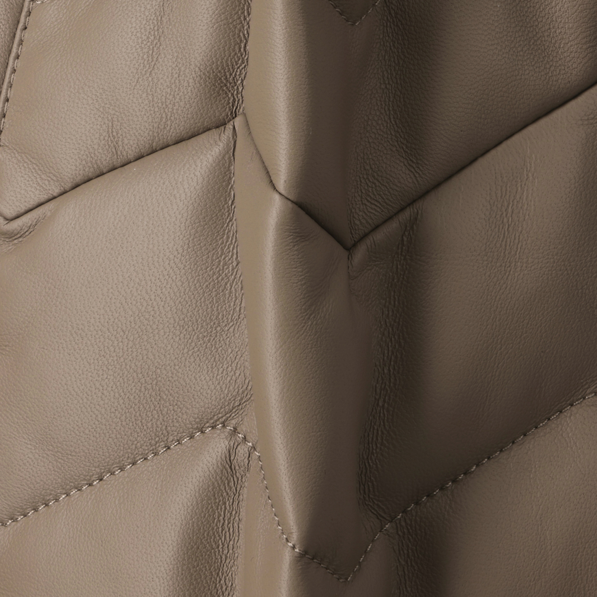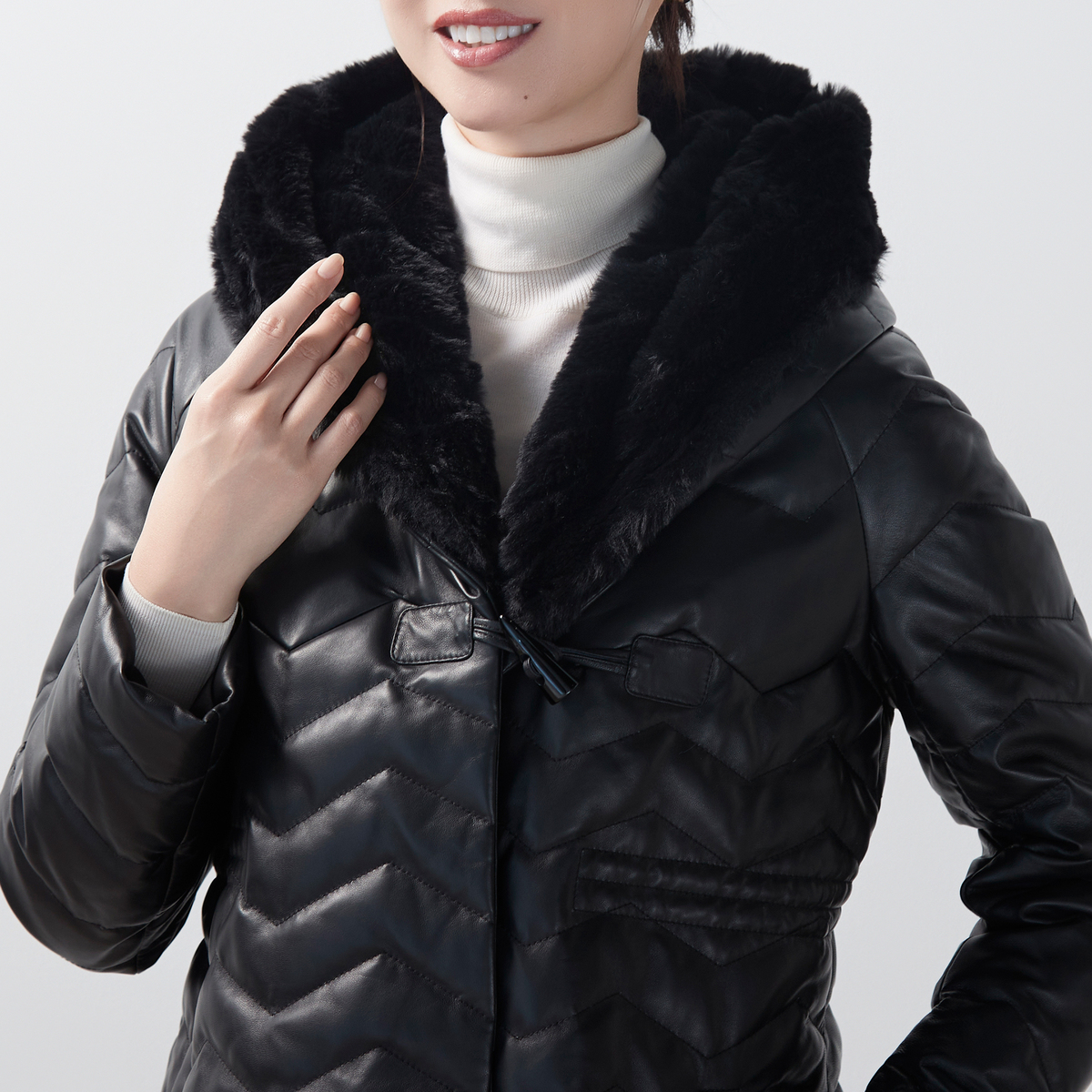 上品な羊革を贅沢に使用。ソフトタッチのダウンコートに仕立てました。フード裏にはフェイクファーをあしらいました。シェブロパターン*のキルトステッチで、さりげなく個性を醸し出したデザインです