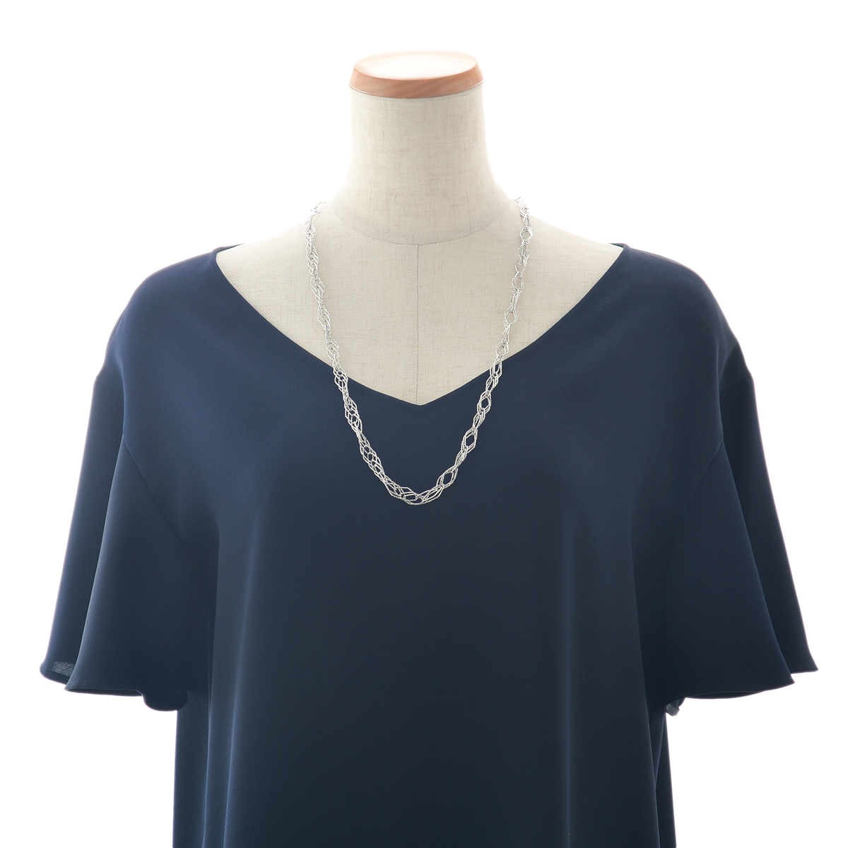 繊細なテクスチャーが揺れる度に煌めき、ダイヤシェイプの重なりが立体感と奥行きを演出。軽やかながらラグジュアリーなボリューム感のある計算されたデザインチェーンを贅沢に使用しました