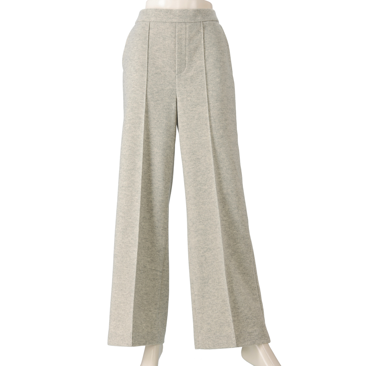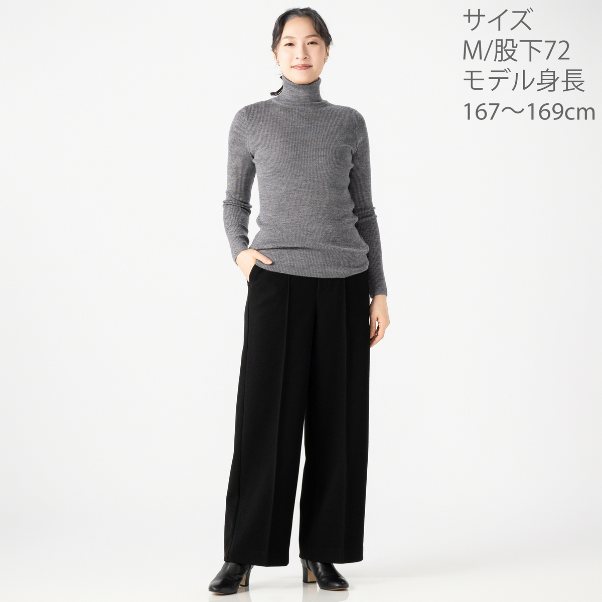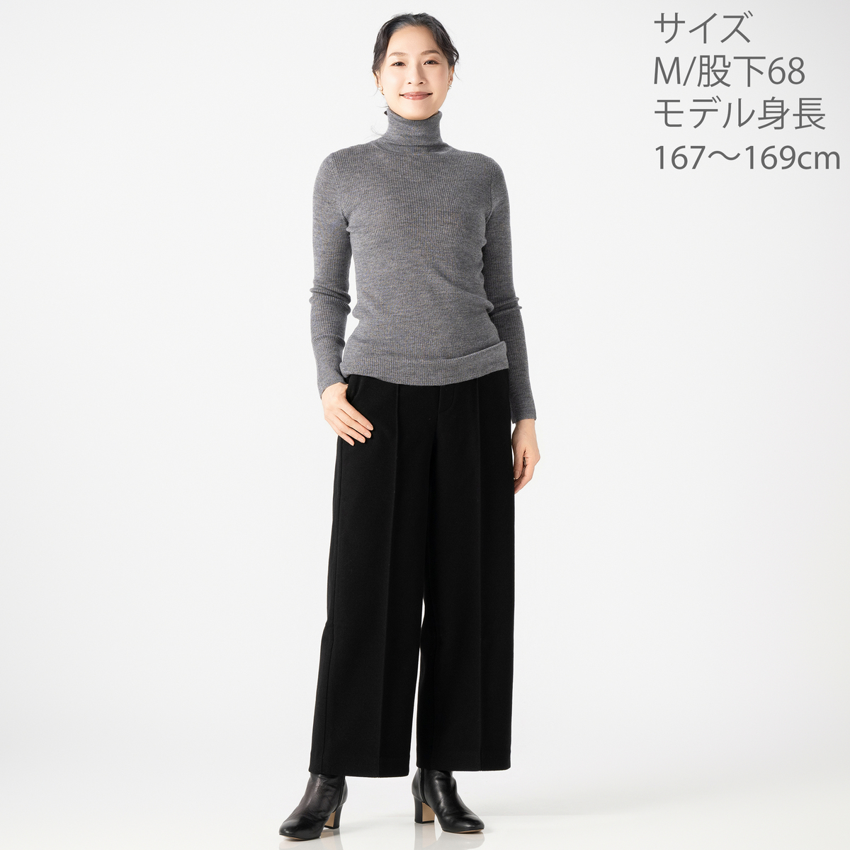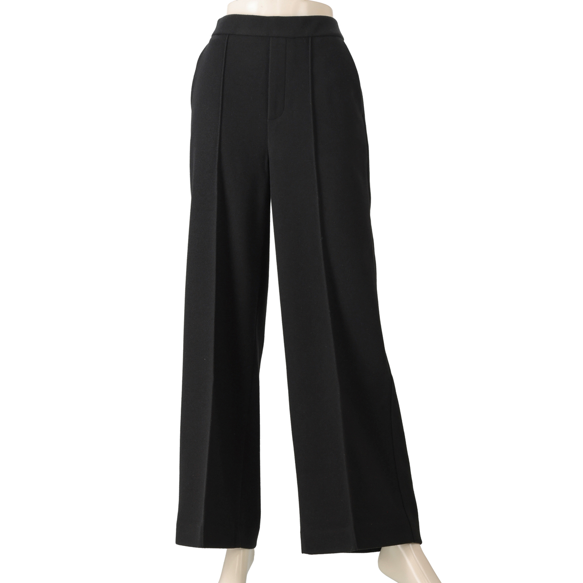 ほどよい分量感のワイドシルエットで、脚をまっすぐ見せてくれます。前身にはセンタープレスのように見せるピンタック入り。引っ張って穿けるプルオン仕様です