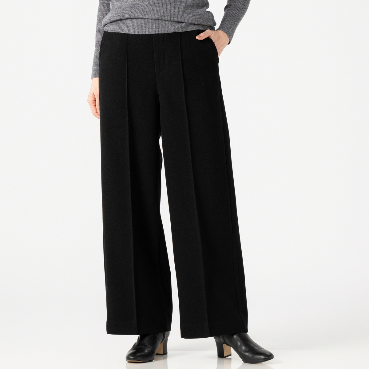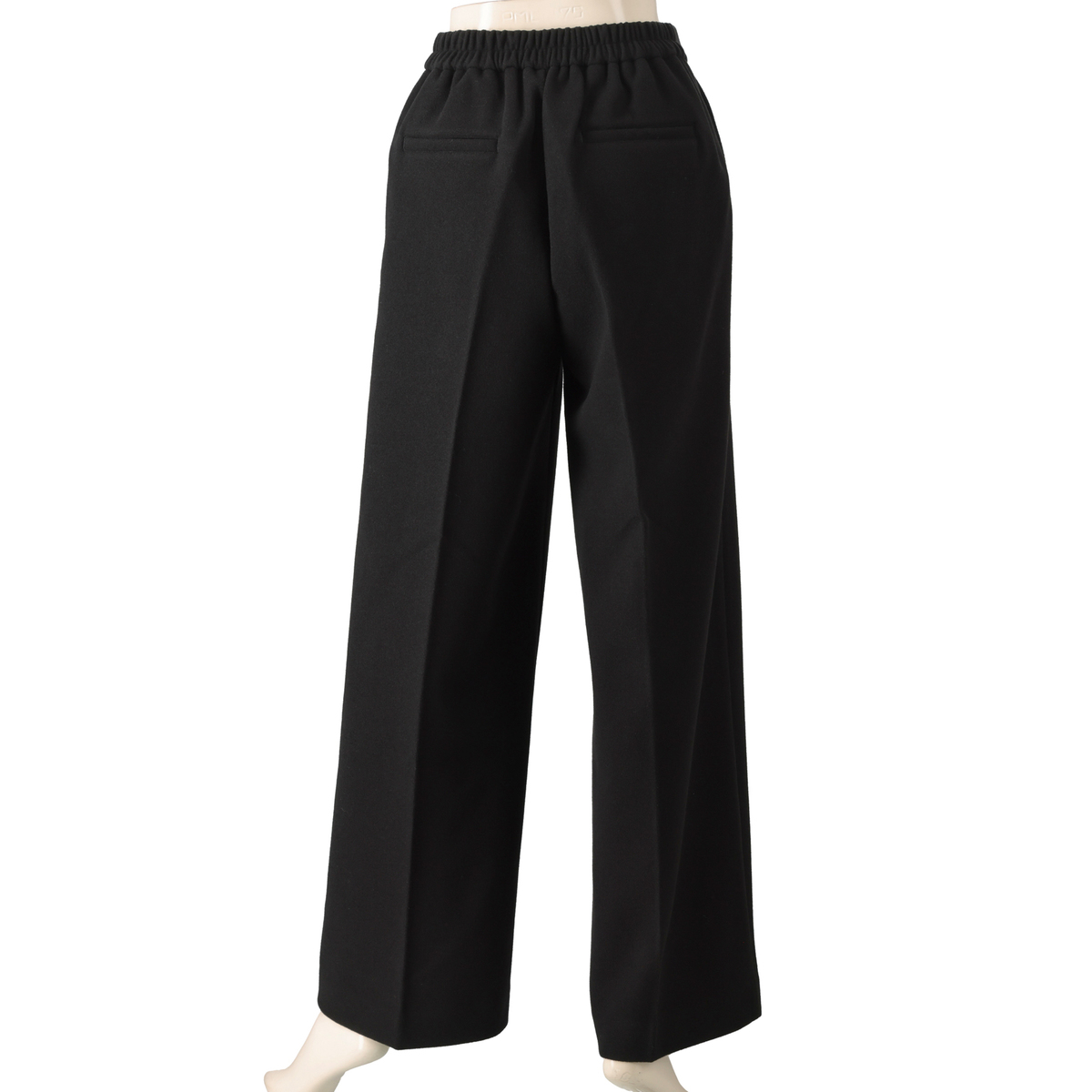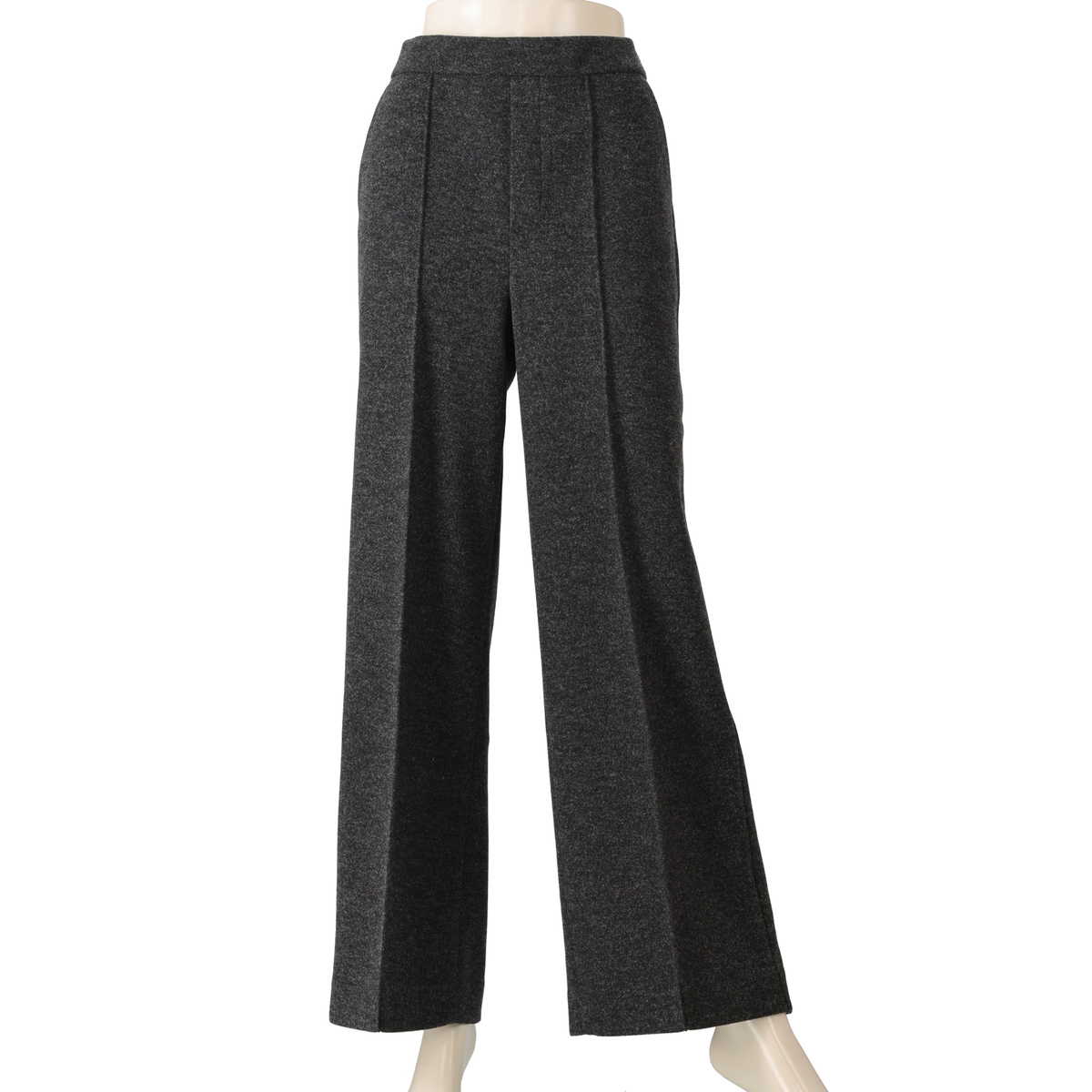 ほどよい分量感のワイドシルエットで、脚をまっすぐ見せてくれます。前身にはセンタープレスのように見せるピンタック入り。引っ張って穿けるプルオン仕様です