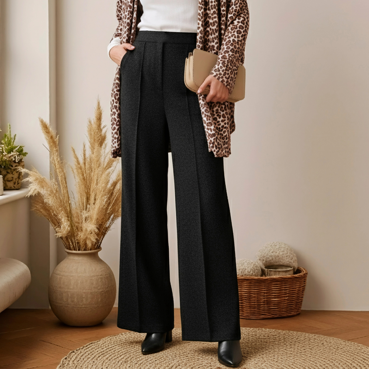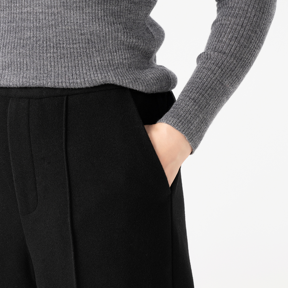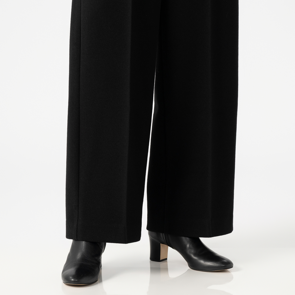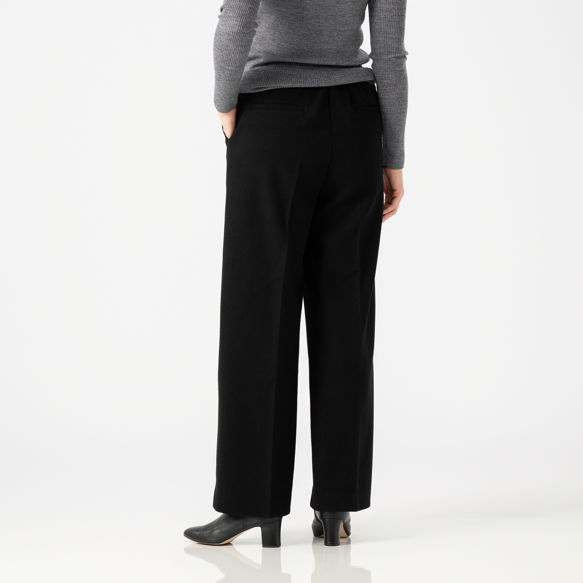 ほどよい分量感のワイドシルエットで、脚をまっすぐ見せてくれます。前身にはセンタープレスのように見せるピンタック入り。引っ張って穿けるプルオン仕様です