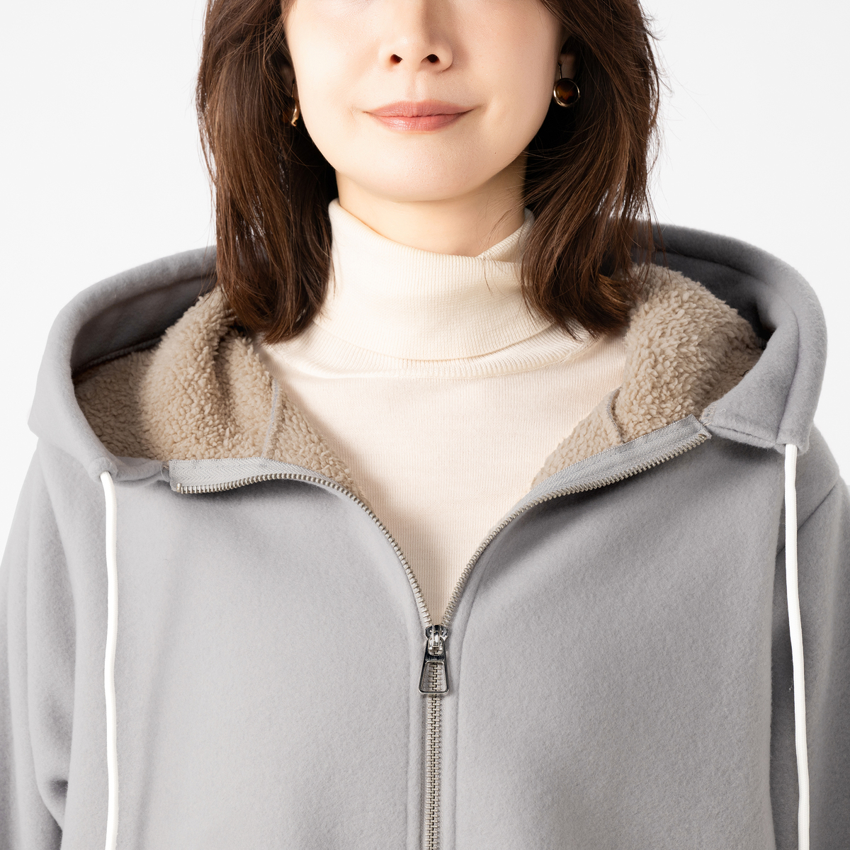 暖かな着心地で上質感も兼ね備えたパーカー。表面はウールのような起毛感、裏側には毛足のあるボアを貼り合わせた両面起毛素材で、肉厚ながらストレッチ性があり快適です。ボンディング仕立てによるハリ感が、高級感のある仕上がりを演出します
