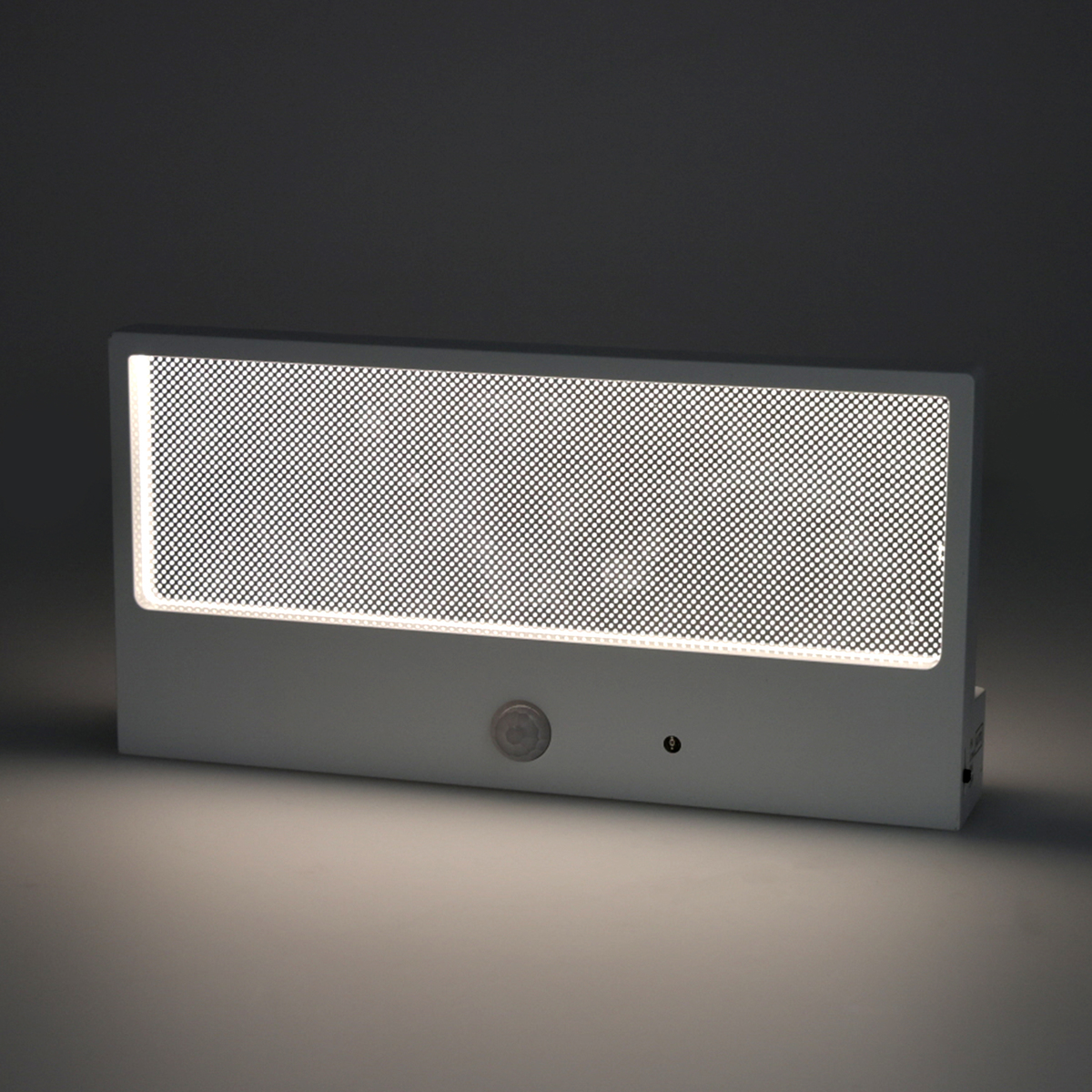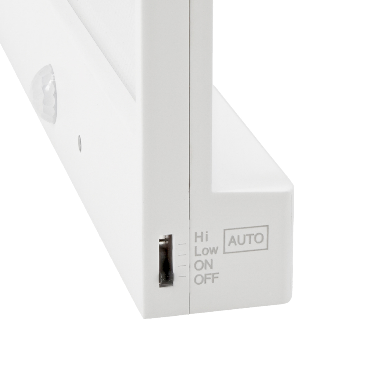 やさしい光のLED人感センサーライト。導光板パネル採用で均一な光を実現し、まぶしさを感じにくい仕様です。すぐに使える置き型で、壁面にも馴染むシンプルデザイン。AUTOモードは人を感知すると約10秒点灯*、光の強さは[Hi:100%/Low:50%]の2段階調整が可能です