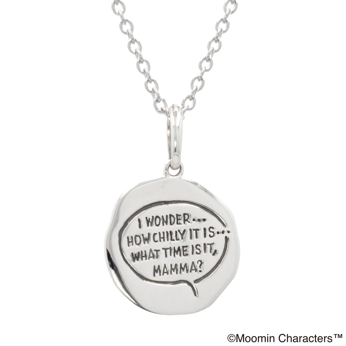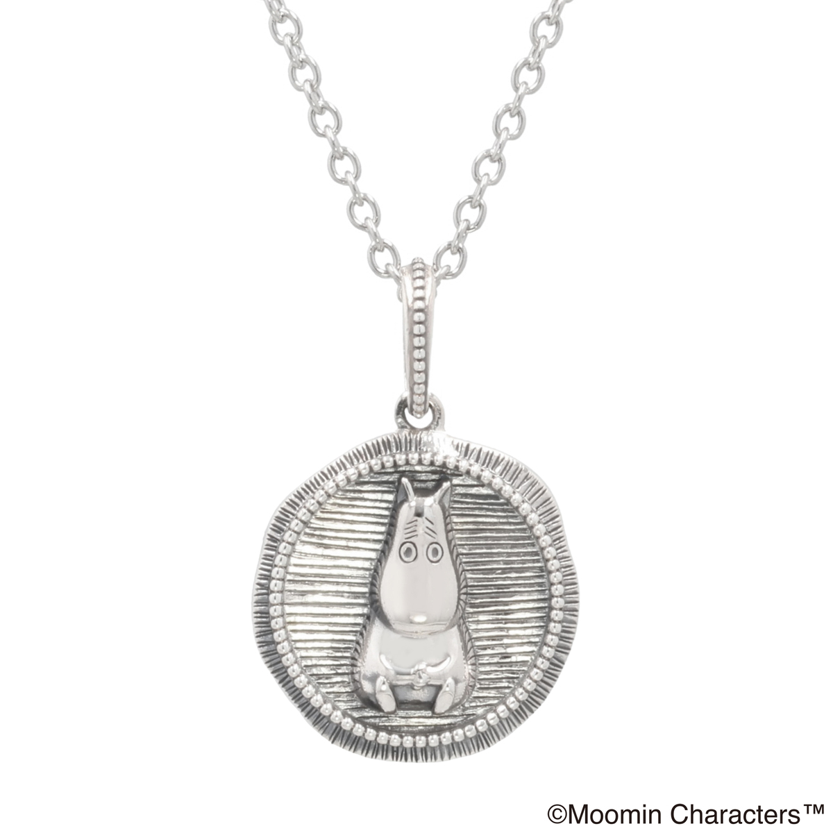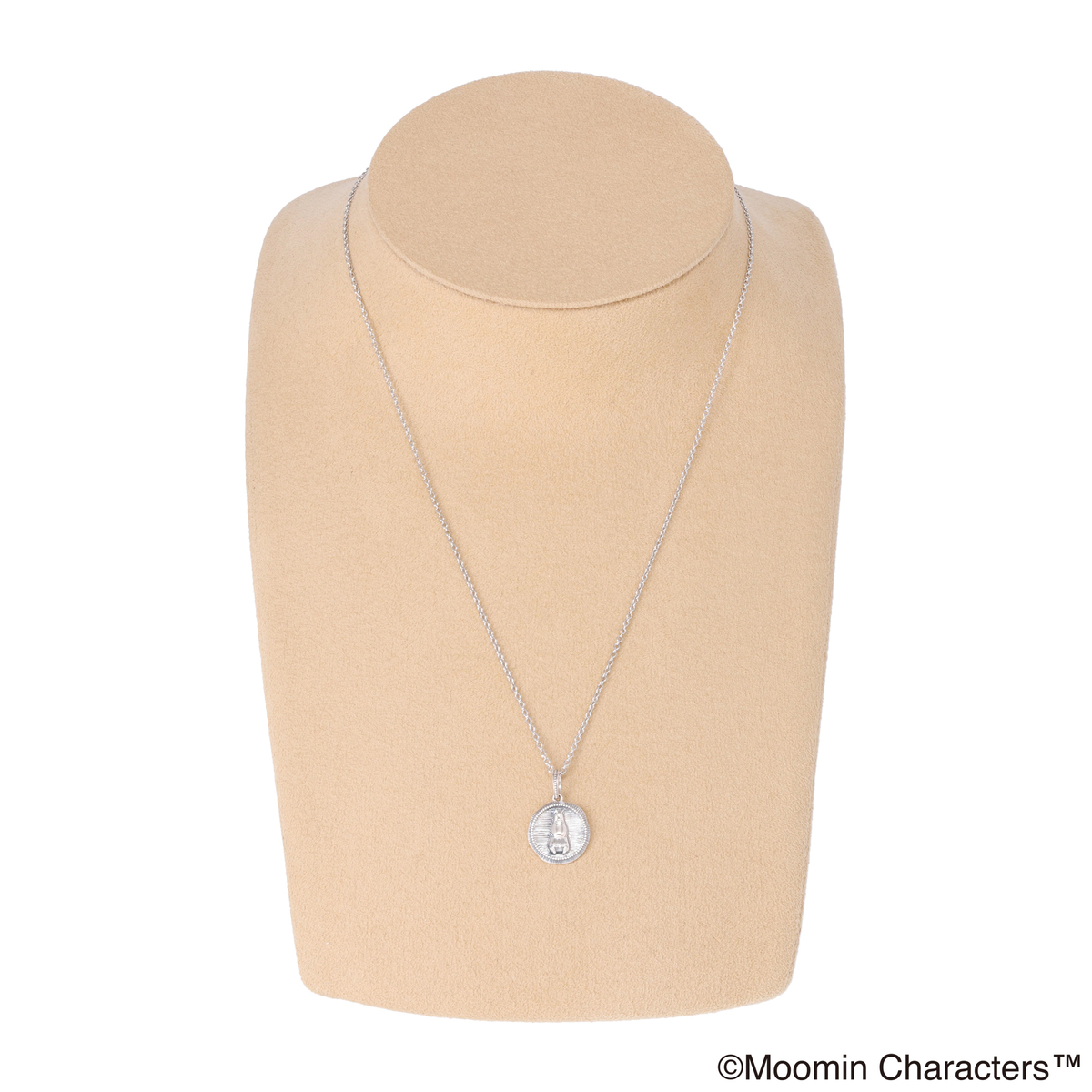 不安げな表情のムーミンがかわいらしいメダルペンダント。様々な装いに合わせやすいシンプルなデザインです
