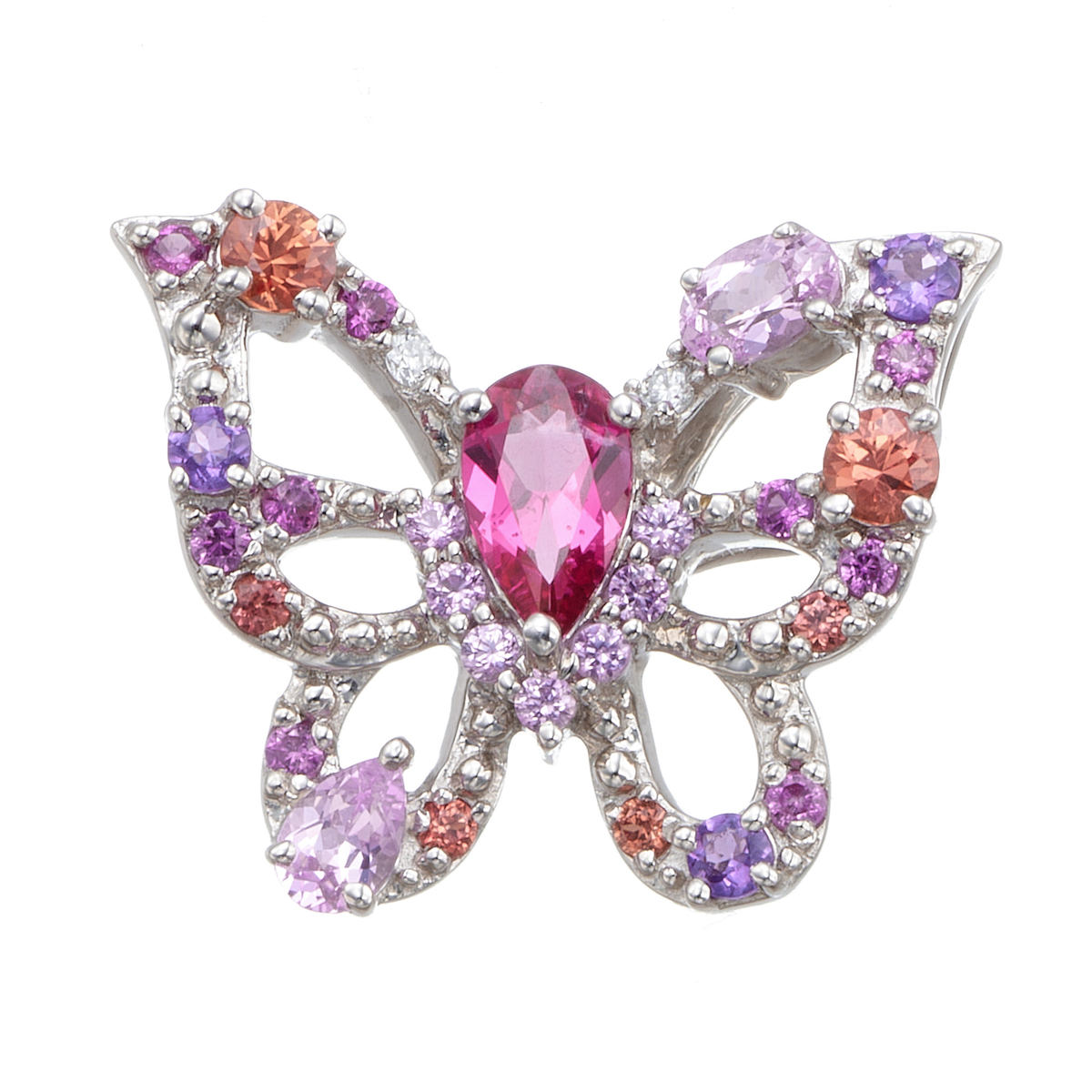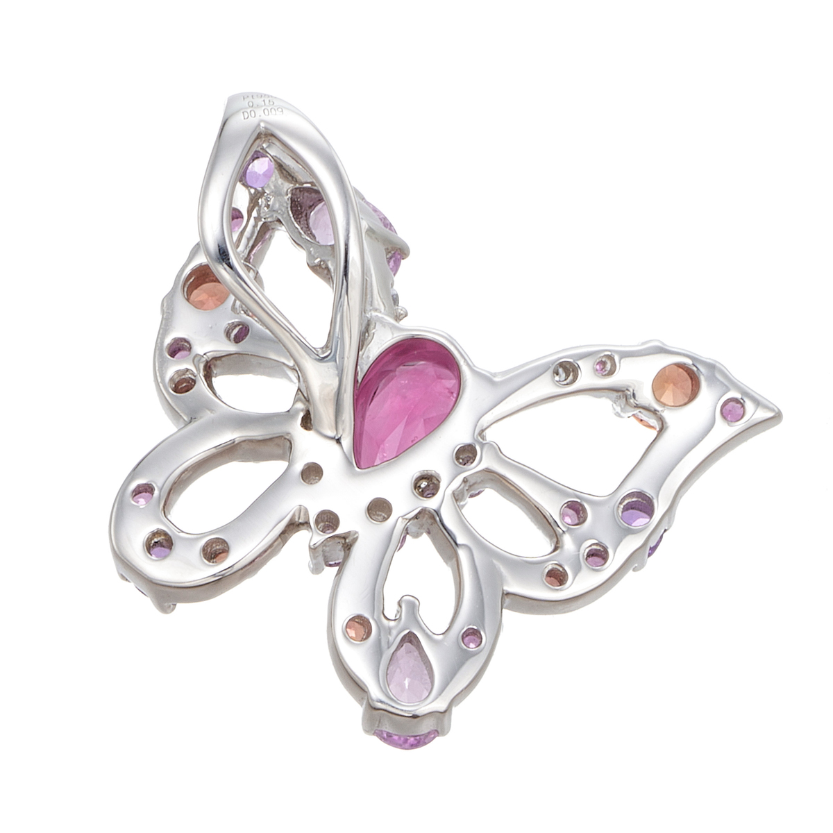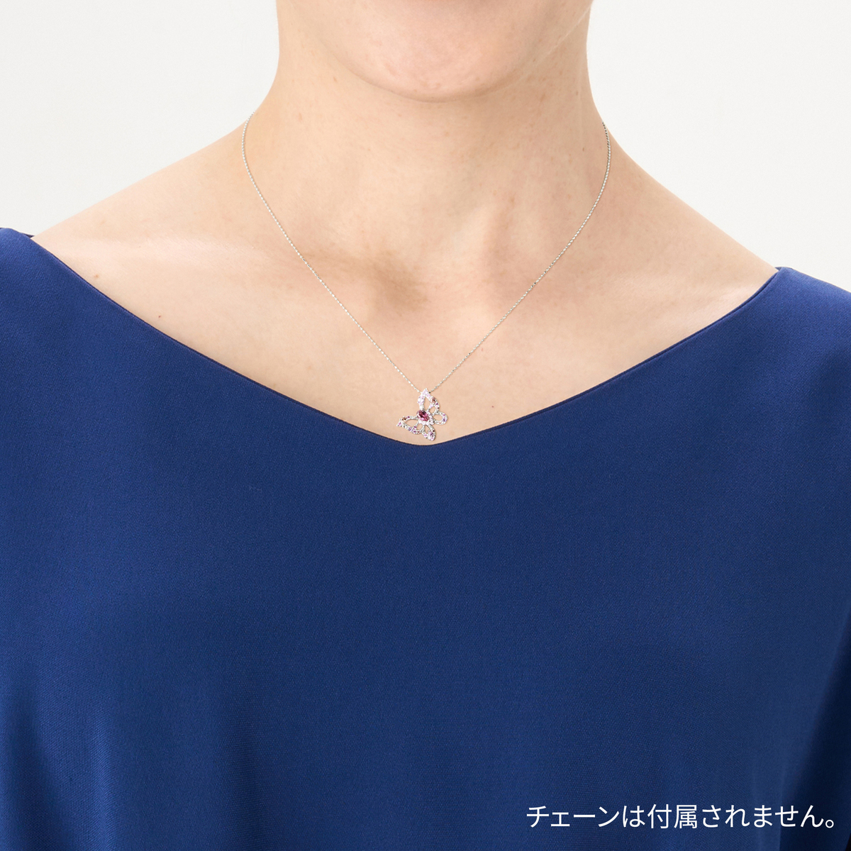 レッドスピネルを中心に、色とりどりの宝石をアシンメトリーに配したペンダントヘッドです。柔らかな羽の曲線とランダムな輝きで、幻想的な蝶の美しさを描きました