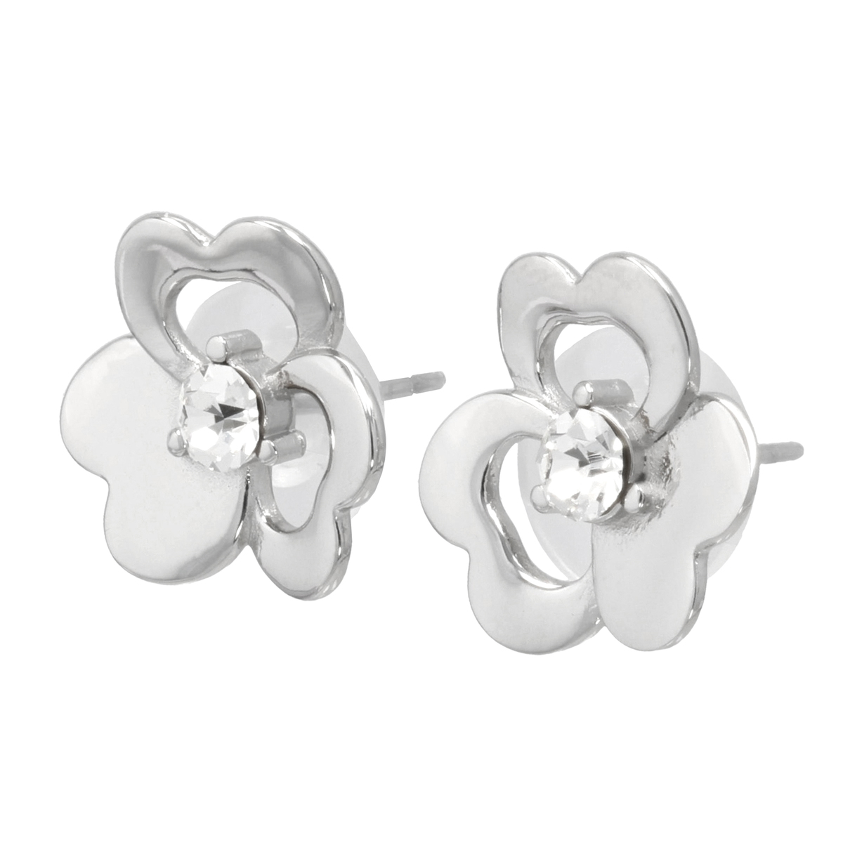 シンプルでありながら印象的なフラワーモチーフが、耳元にやさしい華やかさを添えるイヤリングまたはピアス。丸みを帯びたステンレス製の3枚の花びらが立体的に広がり、中央にあしらったクリスタルガラスが光を受けるたびに繊細な輝きを放ちます。顔まわりを明るく演出し、上品な存在感を引き立てます