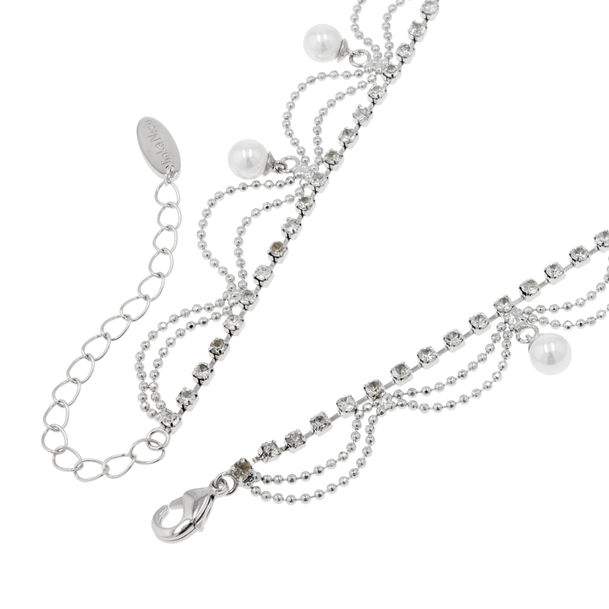 フォーマルシーンに映えるレイヤードデザインのパール調ジュエリー。複数のシルバートーンチェーンに樹脂パールをリズミカルにあしらい、動くたびに柔らかな輝きを放ちます