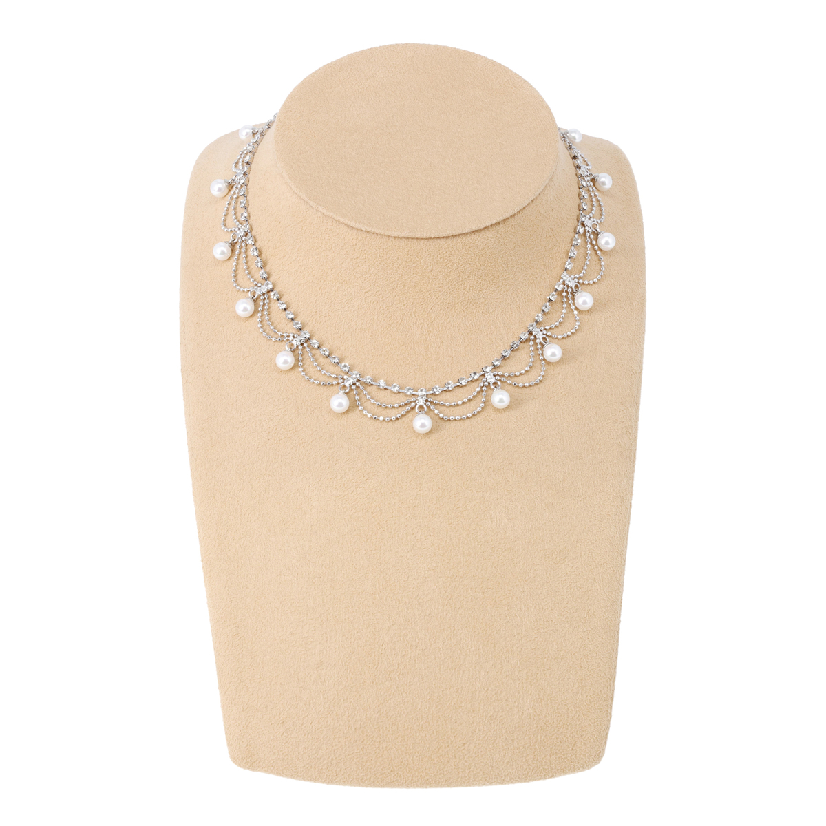 クラシカルな品格と繊細な装飾性を兼ね備え、ガラスの煌めきやドレープの美しさと揺れ感が、首元に上品な華やぎを添えるデザイン。装いに合わせるだけで、洗練された印象を与えてくれます