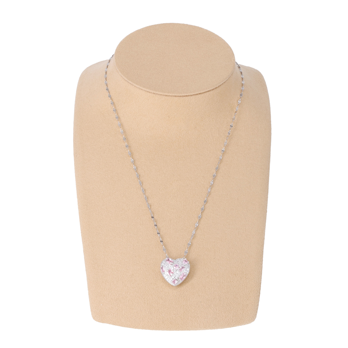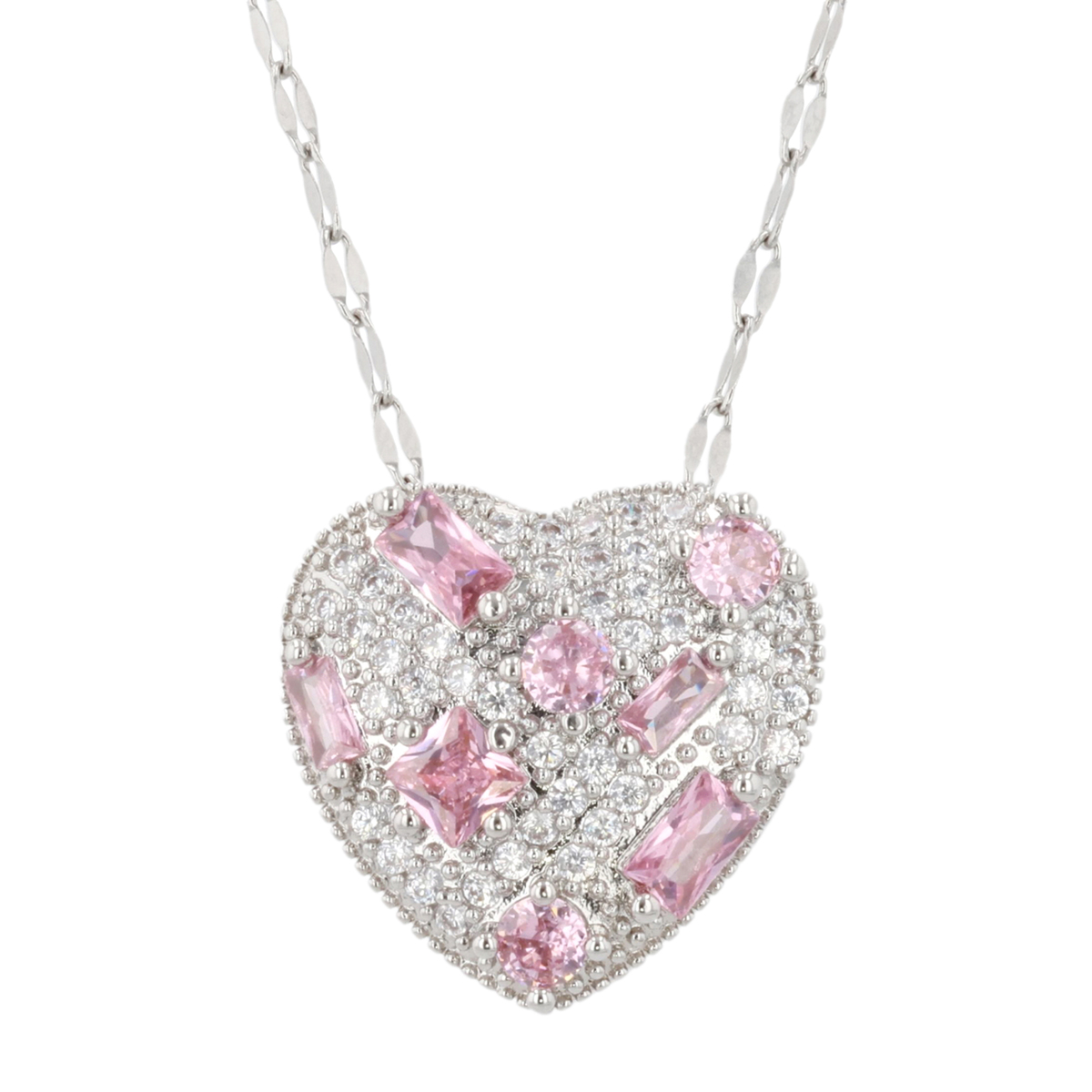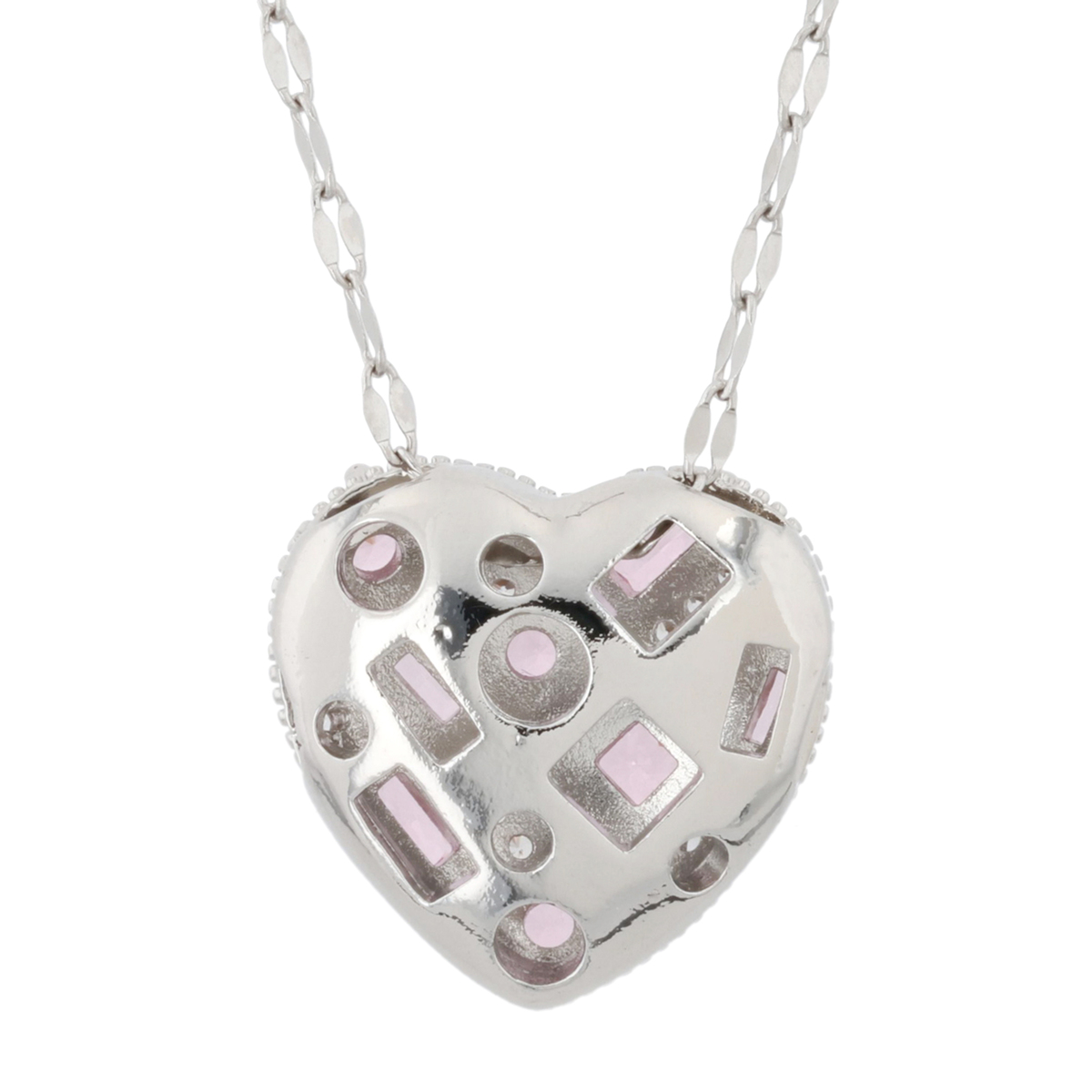 密に敷き詰められたクリアキュービックジルコニアのベースに、ライトピンクのバゲット・ラウンド・スクエアカットのキュービックジルコニアをアクセントとして散りばめた、華やかなハート型ペンダントです