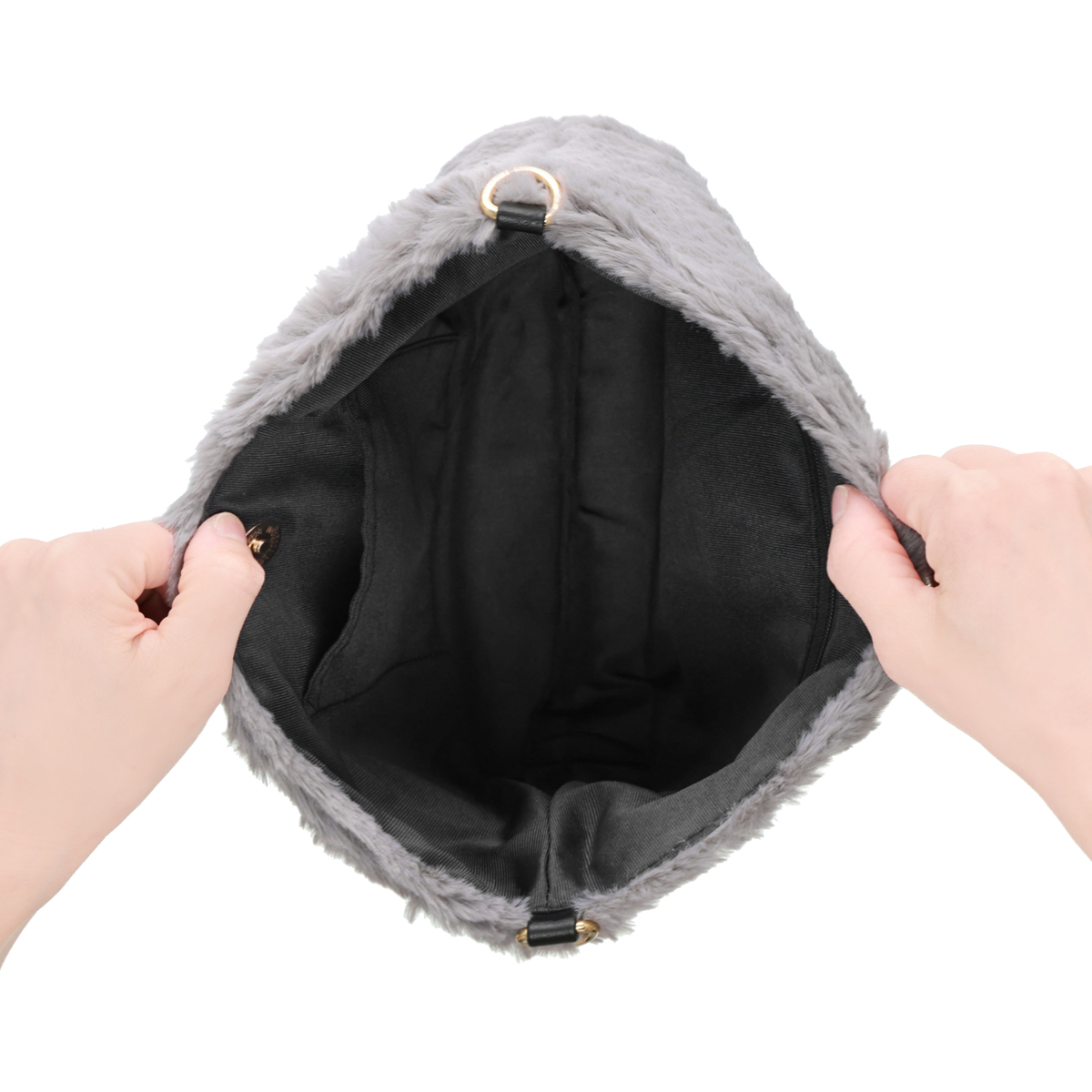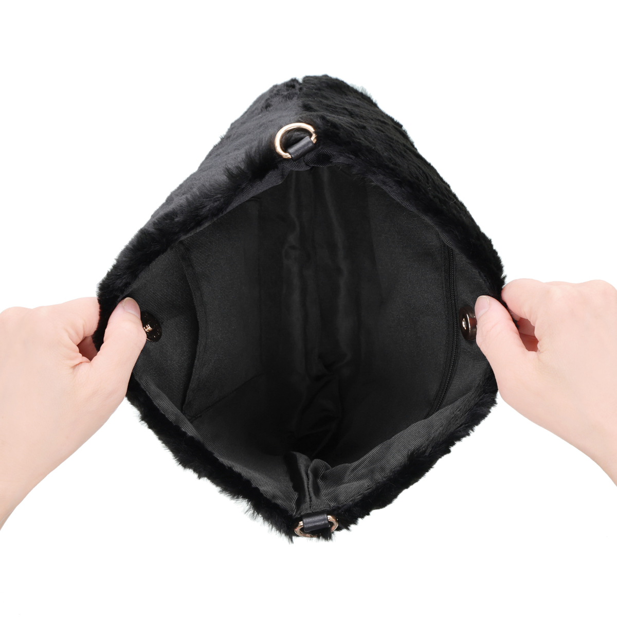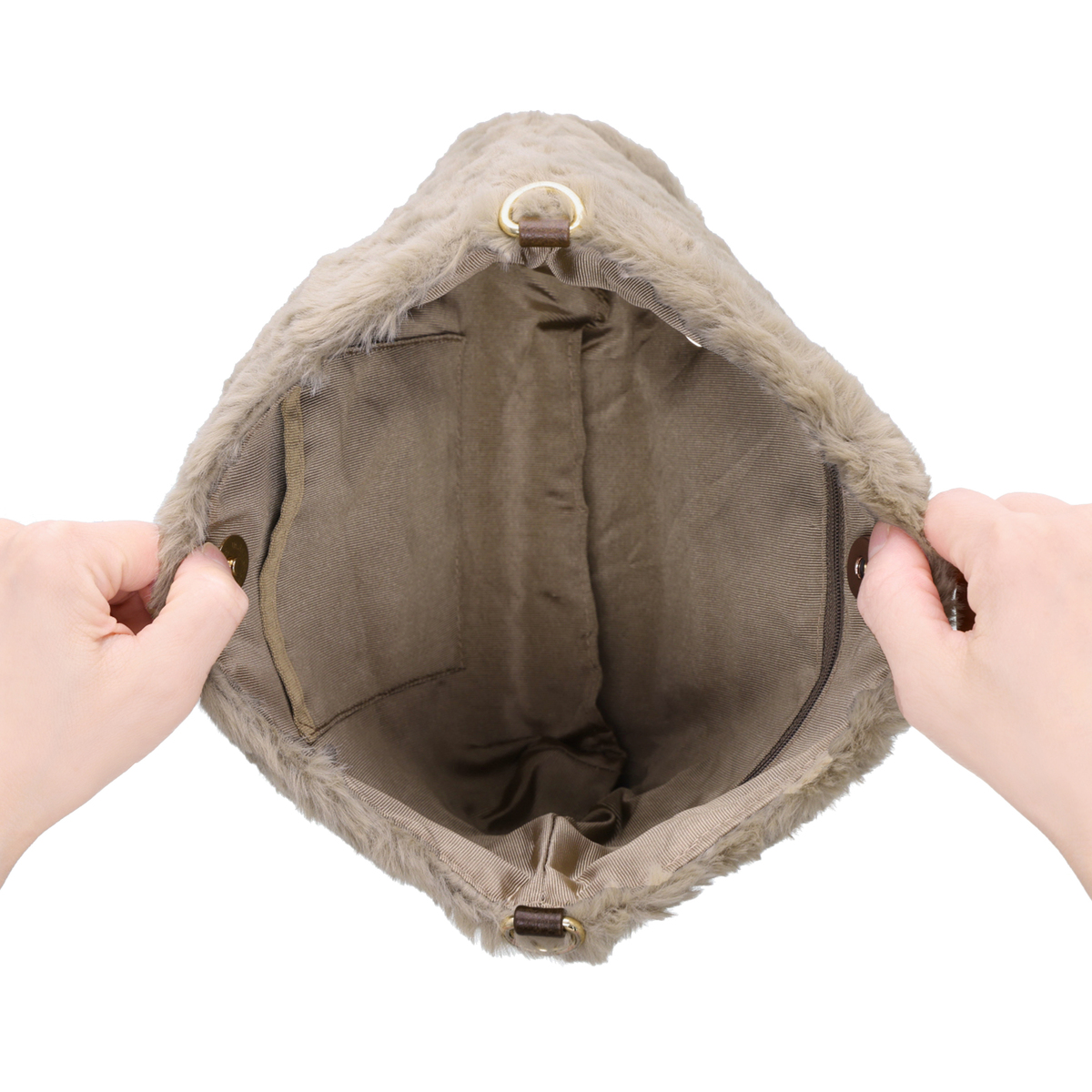 口部分はマグネット留めなので開け閉めもしやすく。内側に2種類のポケット付きで、小物などを分けて収納可能。ファーを使ったデザインで、パーティーなどの華やかなシーンにもマッチします
