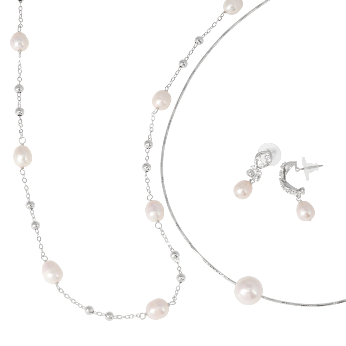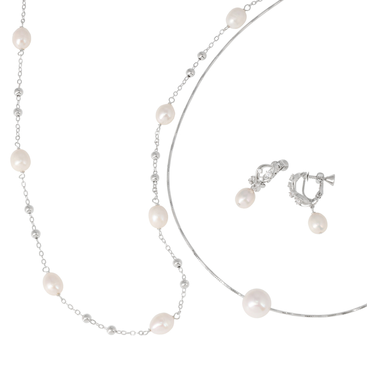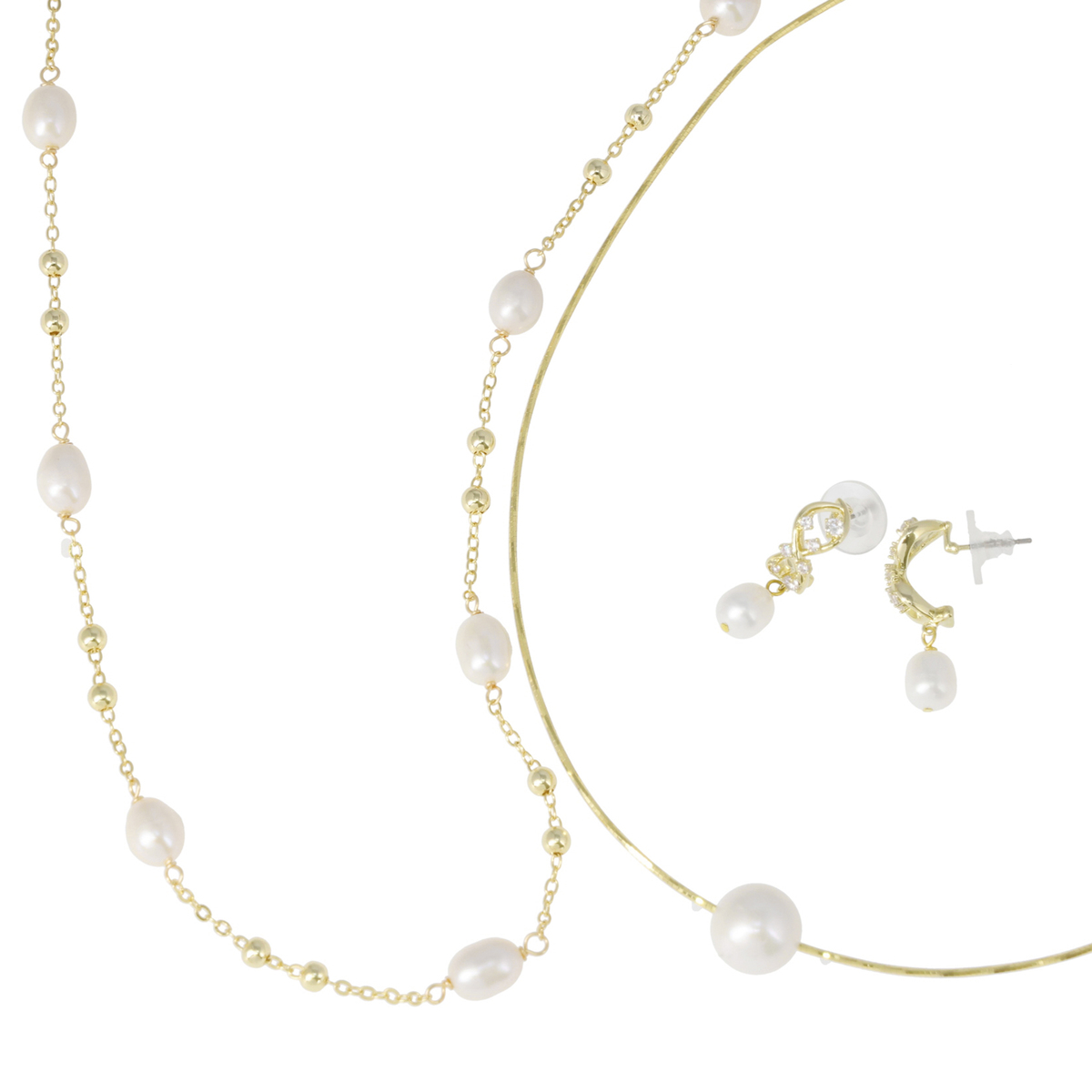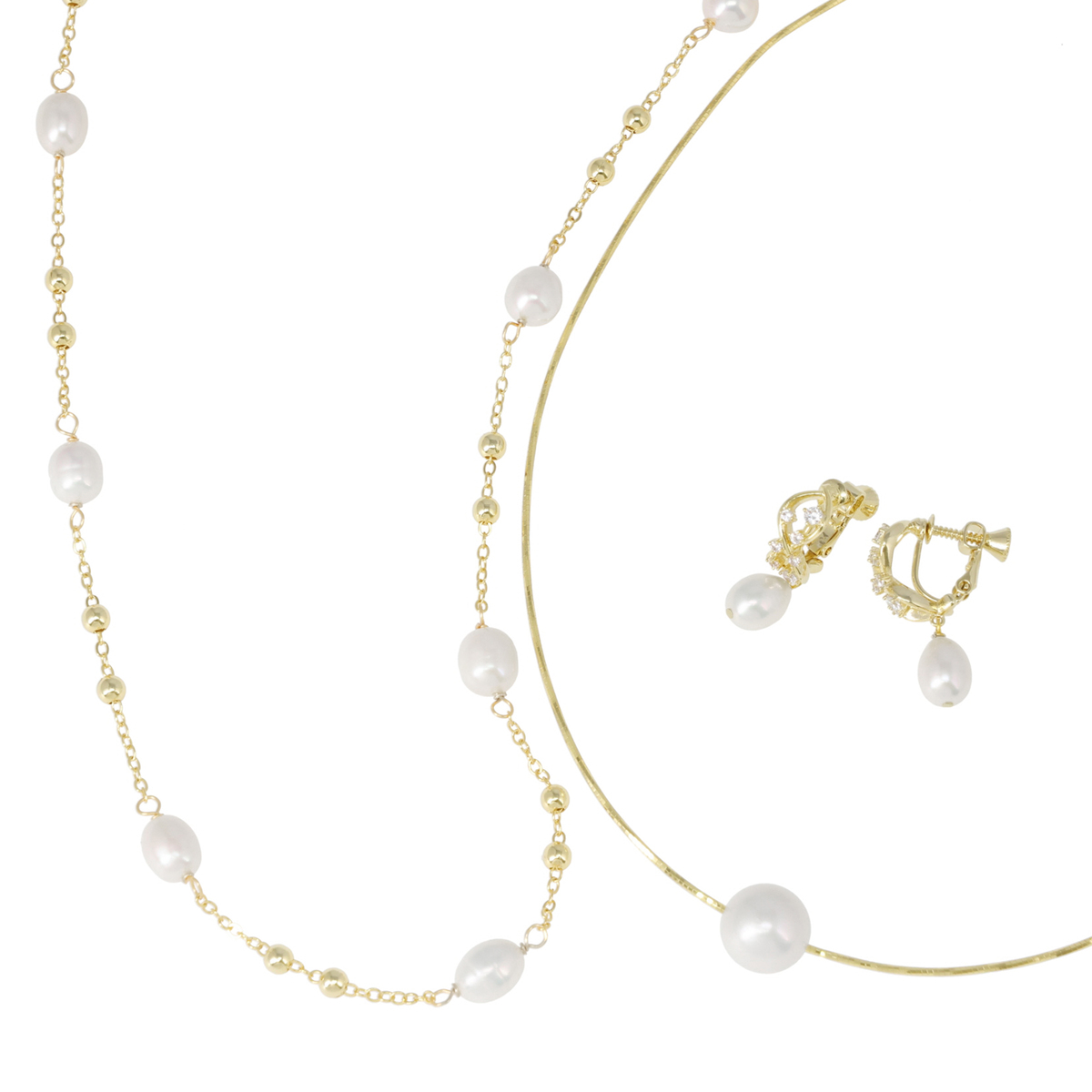 オメガネックレス、ロングステーションネックレス、イヤリングまたはピアスの3点セット。淡水パールの上品な輝きが装いに華やかさを添え、普段使いから特別なシーンまで幅広く活躍します